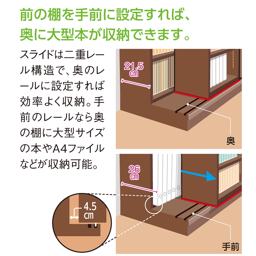 スライドは二重レール構造で、奥に設定すれば効率よく収納。手前なら大型サイズやA4ファイルなどが収納可能。