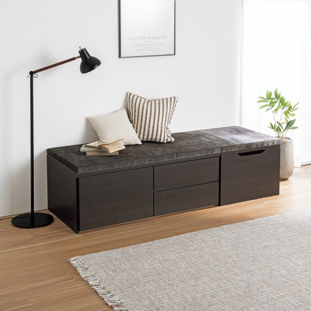 コーディネート例(イ)ダークブラウン リビングの窓辺に置いて、読書する窓辺のくつろぎスペースとしても。 ※写真はフタ収納タイプ幅60cm、引き出し収納タイプ幅120cmの組み合わせです。