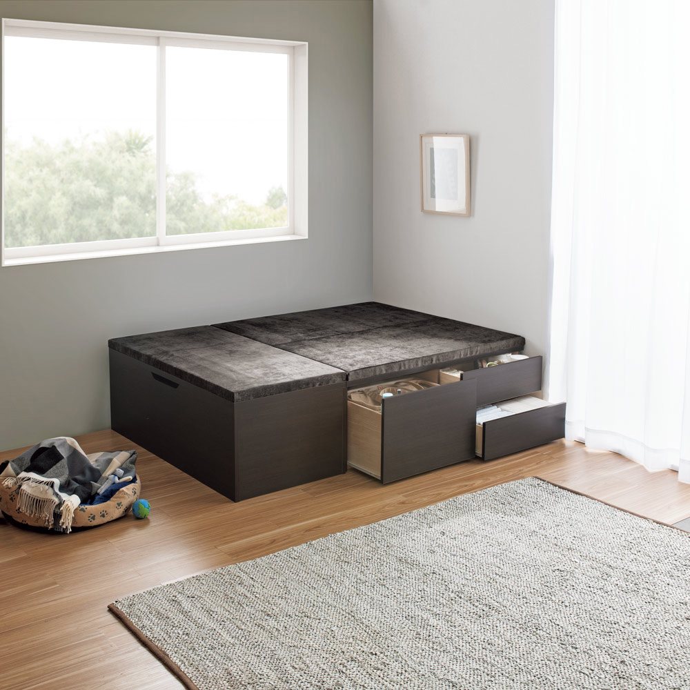 コーディネート例(イ)ダークブラウン 部屋の一角にコンパクトな小上がりスペースが作れます。 ※写真はフタ収納タイプ幅120cm、引き出し収納タイプ幅120cmの組み合わせです。