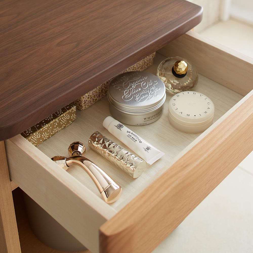 ●引き出しにはリップクリームやハンドクリーム、メガネやネイル類、アロマグッズ、エアコンのリモコンなどなくしがちな小物を収納できます。