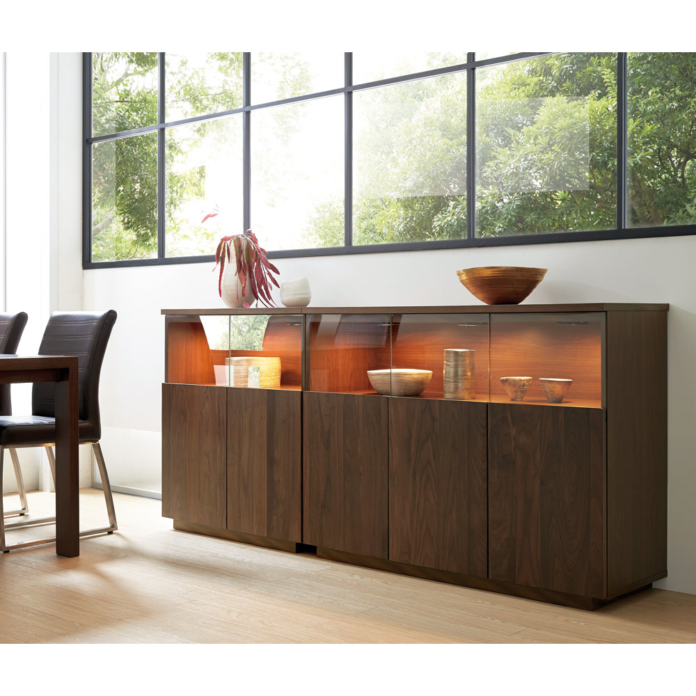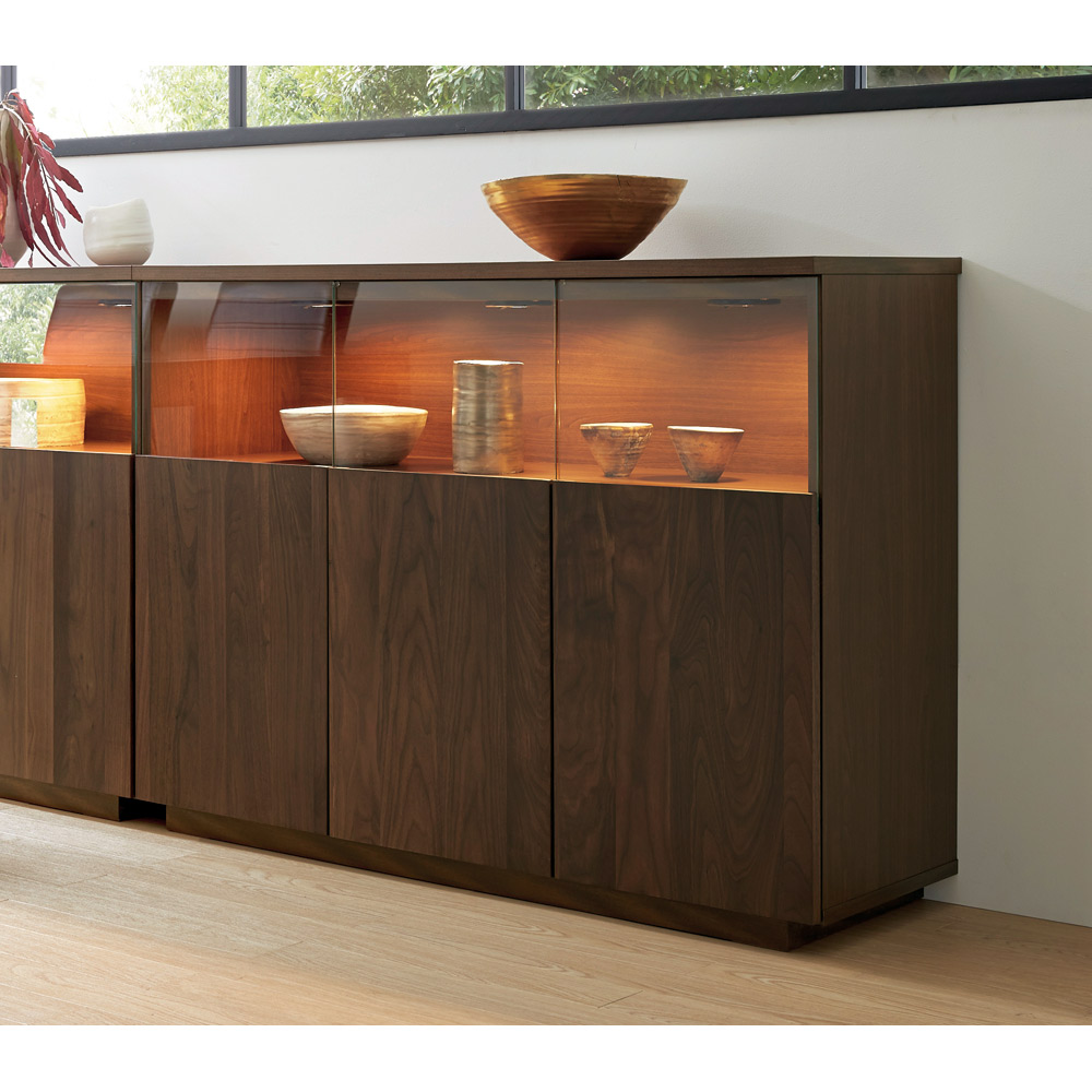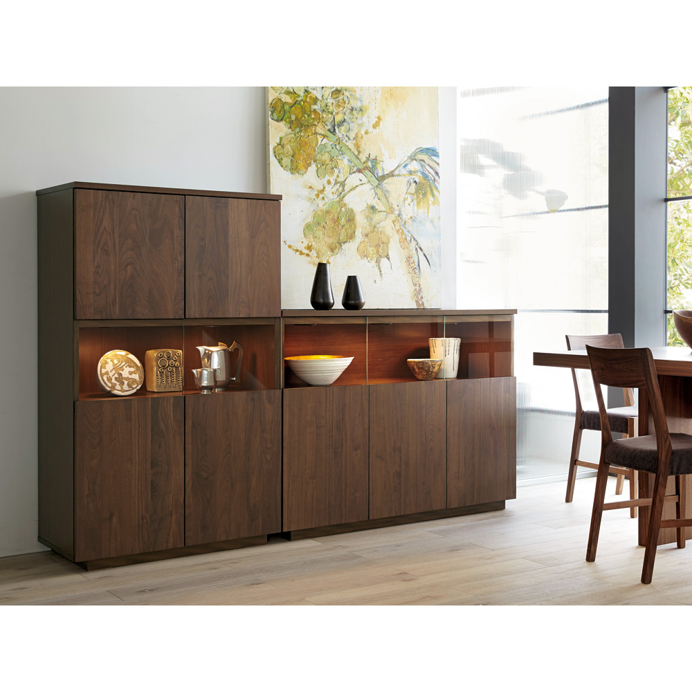 【開梱・設置料金込み】まるでステージのようなそのスペースをLEDダウンライトが照らし、大切なコレクションを美しく演出。味わい深いウォルナットの板目がハイクラスな印象を約束する、美術館のようなサイドボードです。コレクションをより上質に演出大切なコレクションをしまう場所にふさわしい重厚感。コレクションが引き立つ、LEDダウンライト付きのリビングボードです。扉の一部をガラスにしているので、お気に入りの食器やグラスなどのコレクションを魅せる楽しみも味わえます。美術館のようなおしゃれなサイドボードで、リビングルームを格調高い空間に。〜熟練の職人が丹精こめて生産しています〜熟練の家具職人がひとつずつ丁寧に仕上げたワンランク上の国産家具です。天然木素材を使用した商品のため色の誤差が多少あります。天然木ならではの風合いをお楽しみください。デザイン・仕様など細部に至るまでこだわったハウススタイリングが自信を持ってお勧めする日本製のディノス家具です。届いたらすぐ使えるのが嬉しい完成品本体は組立不要。届いたらすぐ使えるのが嬉しい完成品でお届けします。【ウォールナットについて】ウォールナットはチークやマホガニーと並ぶ世界三大銘木ともいわれる高級な木材です。ウォールナットの特徴は、《衝撃に強い》、《重厚で狂いが少ない》、《美しい木目》等が上げられ、高級家具や工芸品の材料として非常に人気の高い素材です。また特徴の一つに経年変化も上げられ、もともとは深みある茶色いウォールナットですが、時間が経つにつれて明るい色合いへと変化していくので、使い込むほどに風合いが増していくのも魅力です。