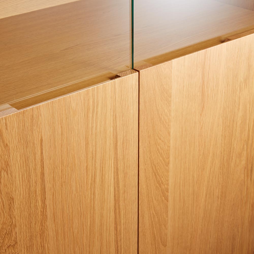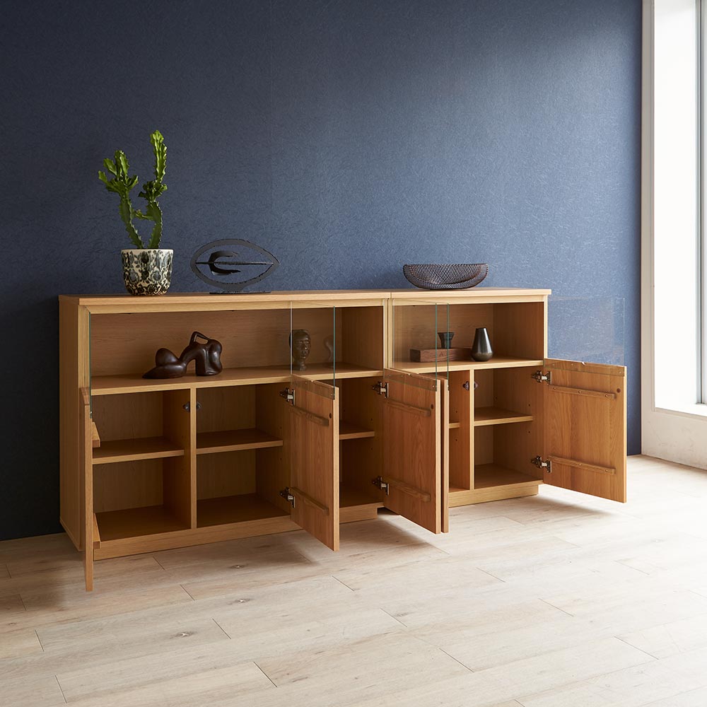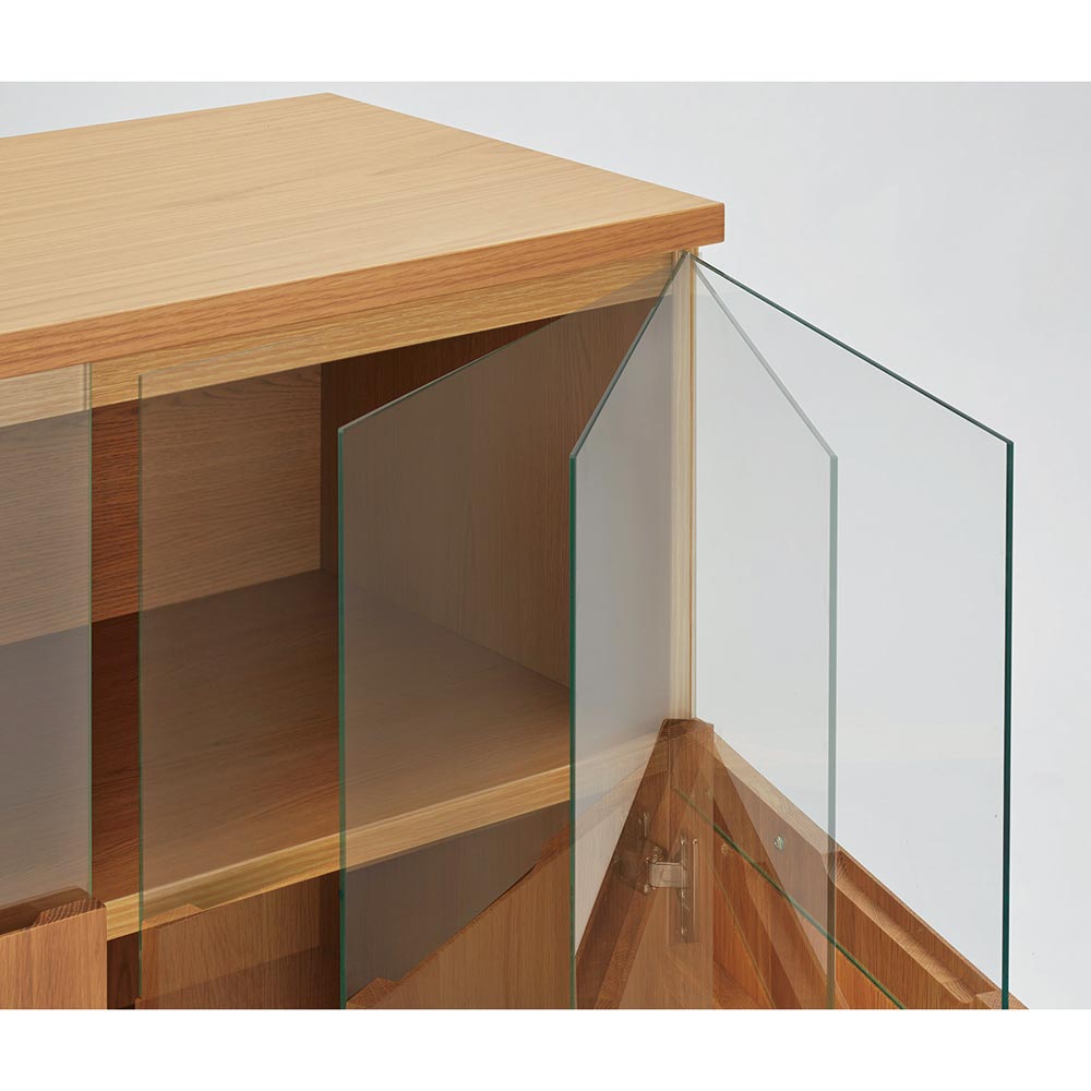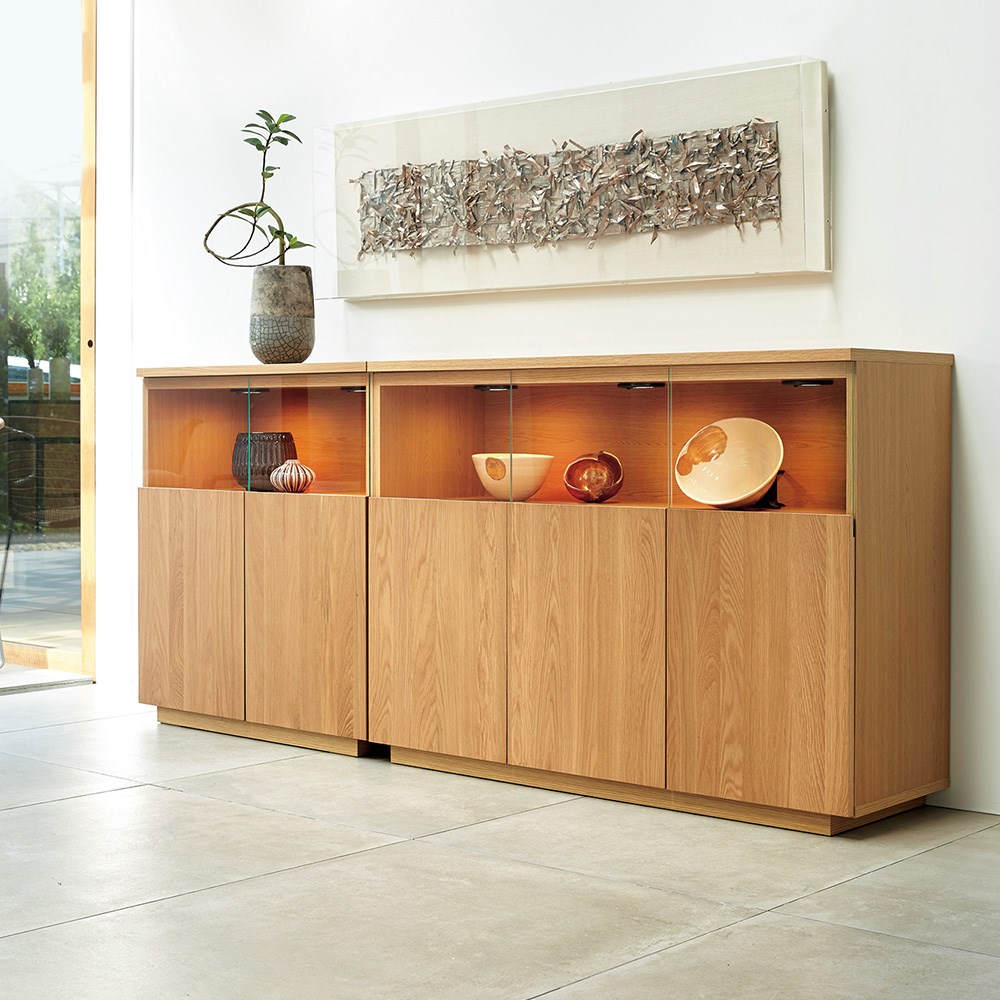 【開梱・設置料金込み】美術館のようなコレクション空間を 毎日の暮らしの中に。ステージのような美空間をLEDダウンライトが照らし、自慢のコレクションをディスプレイ。端正な木目のオーク天然木がコレクションの魅力をさらに高めます。コレクションをより上質に演出大切なコレクションをしまう場所にふさわしい重厚感。コレクションが引き立つ、LEDダウンライト付きのリビングボードです。扉の一部をガラスにしているので、お気に入りの食器やグラスなどのコレクションを魅せる楽しみも味わえます。ガラス付き扉は静かにゆっくり閉まるソフトクロージング仕様です。ディスプレイスペースは仕切りが無いので、横長の品もゆったり飾ることができます。美術館のようなサイドボードで、リビングルームを格調高い空間に。〜熟練の職人が丹精こめて生産しています〜熟練の家具職人がひとつずつ丁寧に仕上げたワンランク上の国産家具です。天然木素材を使用した商品のため色の誤差が多少あります。天然木ならではの風合いをお楽しみください。デザイン・仕様など細部に至るまでこだわったハウススタイリングが自信を持ってお勧めする日本製のディノス家具です。届いたらすぐ使えるのが嬉しい完成品本体は組立不要。届いたらすぐ使えるのが嬉しい完成品でお届けします。【オーク天然木について】明るく爽やかな印象を持ちながら、比較的しっかりとした主張の木目で力強さを感じさせるオーク材。涼しい地域で時間をかけゆっくり成長する木なので、密度が高く強度にも優れるといわれます。木目は細かくて美しく、家具用木材として人気があり高級家具としても流通しています。固くて強度が高く、力の加重や衝撃に比較的強いといった特徴をもちます。使うほどに少ずつ色が深くなり、味わい深くなる経年変化を楽しめます。