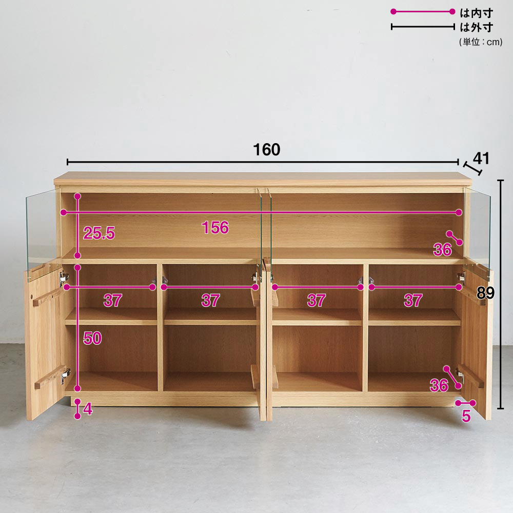 美術館のようなコレクション空間を 毎日の暮らしの中に。ステージのような美空間をLEDダウンライトが照らし、自慢のコレクションをディスプレイ。端正な木目のオーク天然木がコレクションの魅力をさらに高めます。コレクションをより上質に演出大切なコレクションをしまう場所にふさわしい重厚感。コレクションが引き立つ、LEDダウンライト付きのリビングボードです。扉の一部をガラスにしているので、お気に入りの食器やグラスなどのコレクションを魅せる楽しみも味わえます。ガラス付き扉は静かにゆっくり閉まるソフトクロージング仕様です。ディスプレイスペースは仕切りが無いので、横長の品もゆったり飾ることができます。美術館のようなサイドボードで、リビングルームを格調高い空間に。〜熟練の職人が丹精こめて生産しています〜熟練の家具職人がひとつずつ丁寧に仕上げたワンランク上の国産家具です。天然木素材を使用した商品のため色の誤差が多少あります。天然木ならではの風合いをお楽しみください。デザイン・仕様など細部に至るまでこだわったハウススタイリングが自信を持ってお勧めする日本製のディノス家具です。届いたらすぐ使えるのが嬉しい完成品本体は組立不要。届いたらすぐ使えるのが嬉しい完成品でお届けします。【オーク天然木について】明るく爽やかな印象を持ちながら、比較的しっかりとした主張の木目で力強さを感じさせるオーク材。涼しい地域で時間をかけゆっくり成長する木なので、密度が高く強度にも優れるといわれます。木目は細かくて美しく、家具用木材として人気があり高級家具としても流通しています。固くて強度が高く、力の加重や衝撃に比較的強いといった特徴をもちます。使うほどに少ずつ色が深くなり、味わい深くなる経年変化を楽しめます。