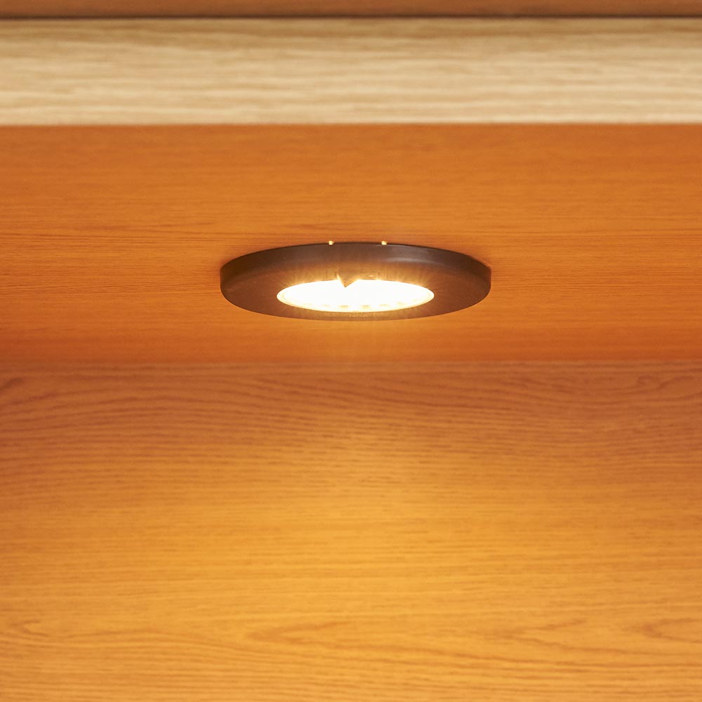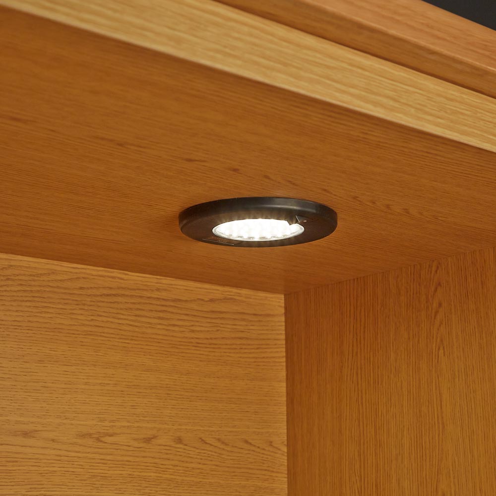 コレクションが引き立つ、LEDダウンライト付きのリビングボードです。