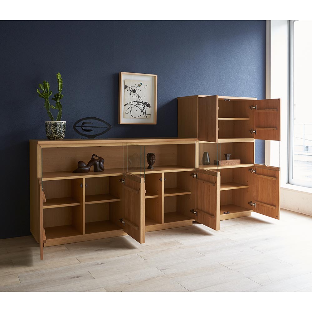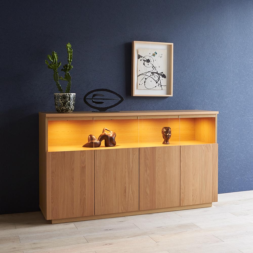 【開梱・設置料金込み】美術館のようなコレクション空間を 毎日の暮らしの中に。ステージのような美空間をLEDダウンライトが照らし、自慢のコレクションをディスプレイ。端正な木目のオーク天然木がコレクションの魅力をさらに高めます。コレクションをより上質に演出大切なコレクションをしまう場所にふさわしい重厚感。コレクションが引き立つ、LEDダウンライト付きのリビングボードです。扉の一部をガラスにしているので、お気に入りの食器やグラスなどのコレクションを魅せる楽しみも味わえます。ガラス付き扉は静かにゆっくり閉まるソフトクロージング仕様です。ディスプレイスペースは仕切りが無いので、横長の品もゆったり飾ることができます。美術館のようなサイドボードで、リビングルームを格調高い空間に。〜熟練の職人が丹精こめて生産しています〜熟練の家具職人がひとつずつ丁寧に仕上げたワンランク上の国産家具です。天然木素材を使用した商品のため色の誤差が多少あります。天然木ならではの風合いをお楽しみください。デザイン・仕様など細部に至るまでこだわったハウススタイリングが自信を持ってお勧めする日本製のディノス家具です。届いたらすぐ使えるのが嬉しい完成品本体は組立不要。届いたらすぐ使えるのが嬉しい完成品でお届けします。【オーク天然木について】明るく爽やかな印象を持ちながら、比較的しっかりとした主張の木目で力強さを感じさせるオーク材。涼しい地域で時間をかけゆっくり成長する木なので、密度が高く強度にも優れるといわれます。木目は細かくて美しく、家具用木材として人気があり高級家具としても流通しています。固くて強度が高く、力の加重や衝撃に比較的強いといった特徴をもちます。使うほどに少ずつ色が深くなり、味わい深くなる経年変化を楽しめます。