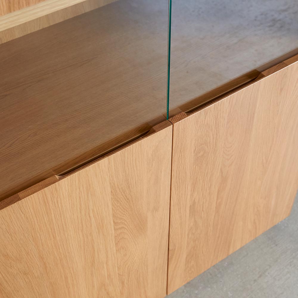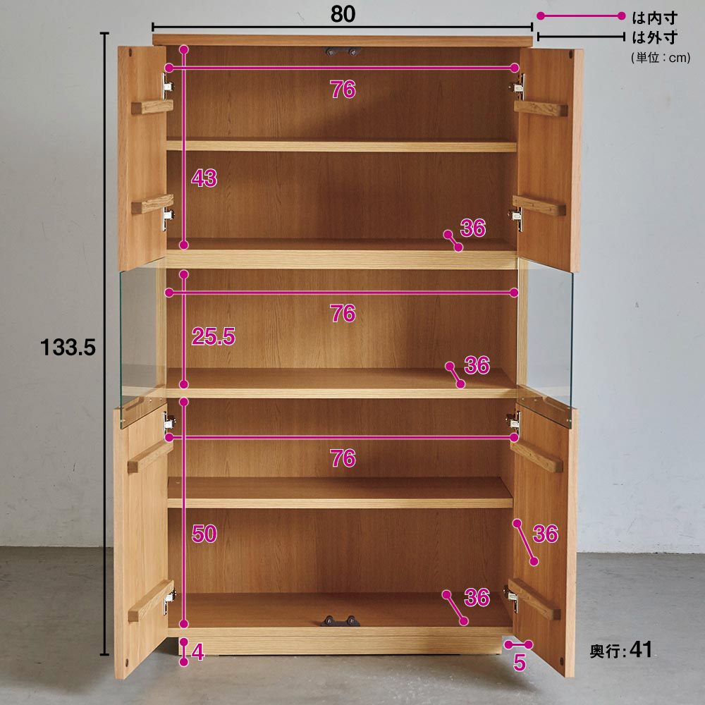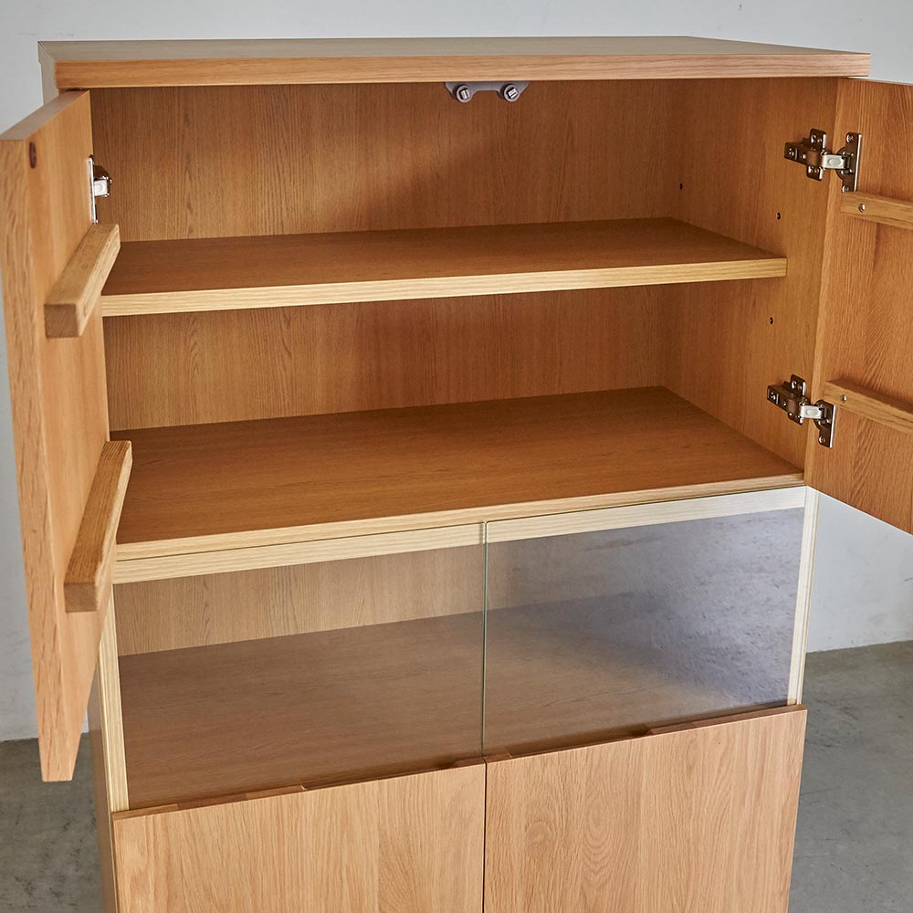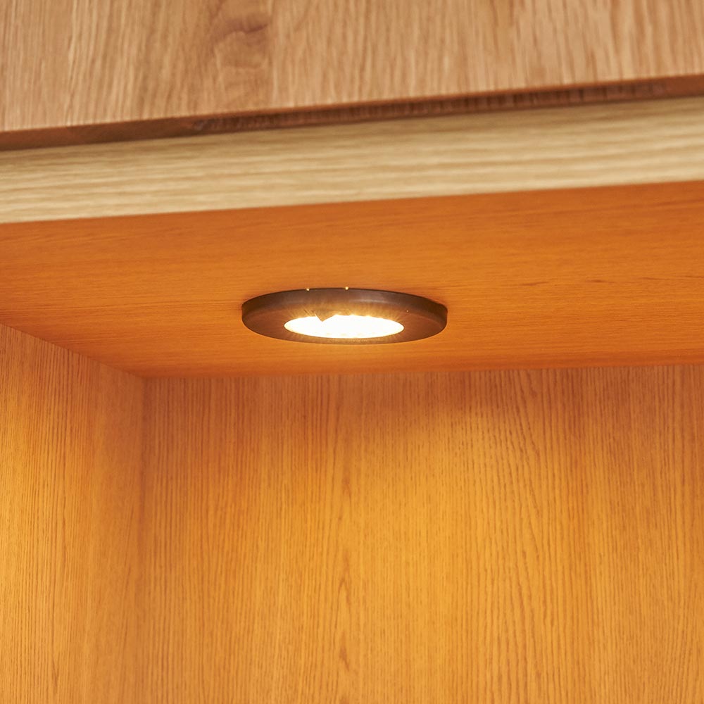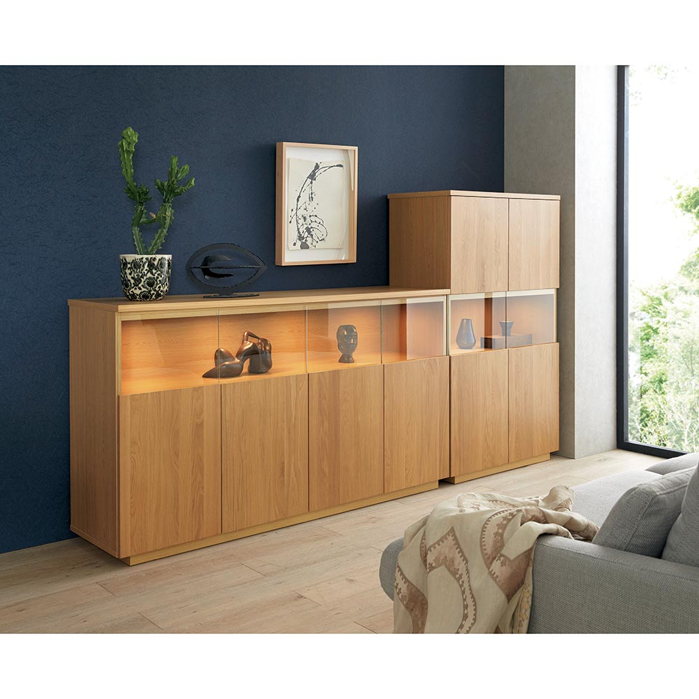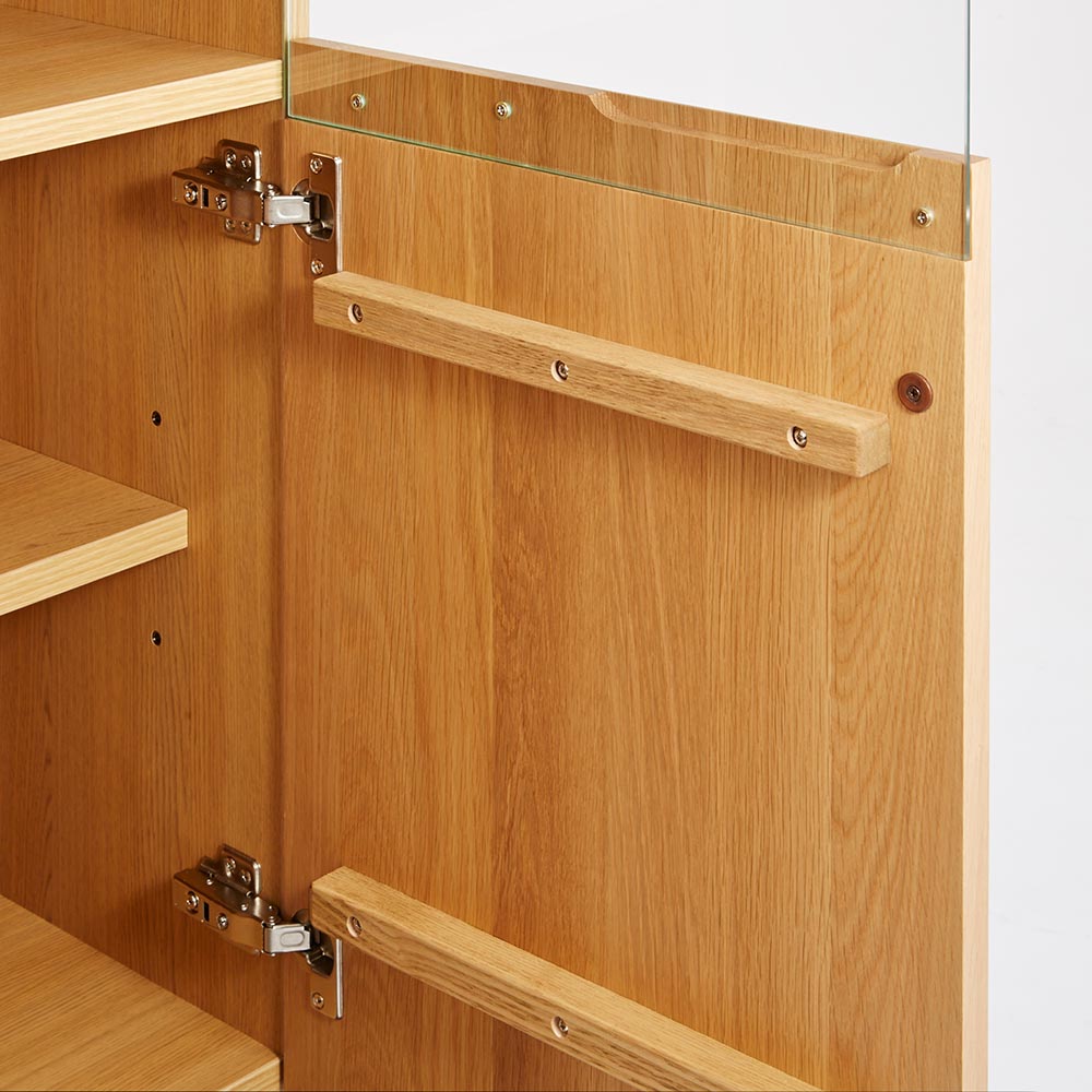【開梱・設置料金込み】美術館のようなコレクション空間を 毎日の暮らしの中に。ステージのような美空間をLEDダウンライトが照らし、自慢のコレクションをディスプレイ。端正な木目のオーク天然木がコレクションの魅力をさらに高めます。コレクションをより上質に演出大切なコレクションをしまう場所にふさわしい重厚感。コレクションが引き立つ、LEDダウンライト付きのリビングボードです。扉の一部をガラスにしているので、お気に入りの食器やグラスなどのコレクションを魅せる楽しみも味わえます。ガラス付き扉は静かにゆっくり閉まるソフトクロージング仕様です。ディスプレイスペースは仕切りが無いので、横長の品もゆったり飾ることができます。美術館のようなサイドボードで、リビングルームを格調高い空間に。〜熟練の職人が丹精こめて生産しています〜熟練の家具職人がひとつずつ丁寧に仕上げたワンランク上の国産家具です。天然木素材を使用した商品のため色の誤差が多少あります。天然木ならではの風合いをお楽しみください。デザイン・仕様など細部に至るまでこだわったハウススタイリングが自信を持ってお勧めする日本製のディノス家具です。届いたらすぐ使えるのが嬉しい完成品本体は組立不要。届いたらすぐ使えるのが嬉しい完成品でお届けします。【オーク天然木について】明るく爽やかな印象を持ちながら、比較的しっかりとした主張の木目で力強さを感じさせるオーク材。涼しい地域で時間をかけゆっくり成長する木なので、密度が高く強度にも優れるといわれます。木目は細かくて美しく、家具用木材として人気があり高級家具としても流通しています。固くて強度が高く、力の加重や衝撃に比較的強いといった特徴をもちます。使うほどに少ずつ色が深くなり、味わい深くなる経年変化を楽しめます。