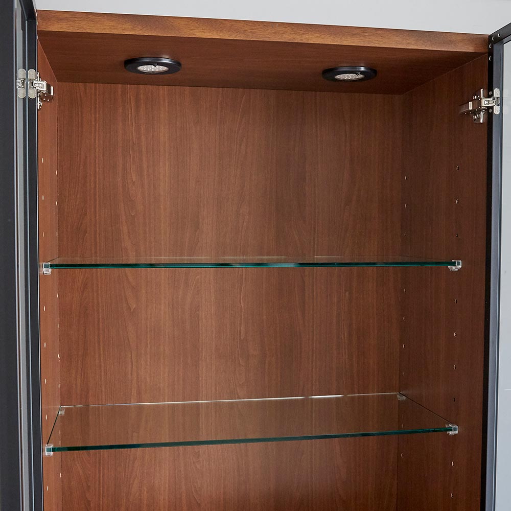 リビングに気品ある雰囲気をもたらす味わい深いウォルナット風の板目が印象的なキャビネット。ゆとりある高さとLEDダウンライトで、ブランドショップのようにリッチなディスプレイが楽しめます。下段は愛蔵書を見せて収納するのも素敵です。ディスプレイと収納を1台で上部はLEDダウンライトが付いたディスプレイスペース。2枚のガラス棚板で、3段に愛蔵品を見せながら収納できます。下部は木製棚板の収納空間。愛蔵書の収納などにおすすめ。ガラス付き扉は静かにゆっくり閉まるソフトクロージング仕様です。扉ガラスには飛散防止効果や紫外線を約98%前後遮蔽する効果のあるフィルム張りで、収納物を守ります。美術館のようなコレクション空間を 毎日の暮らしの中に。使いやすさにもこだわりました扉を開ければ大容量の収納空間が出現。大事な品々の大量収納も可能です。扉内の棚板は可動式・固定式の組み合わせ。空間を無駄なく有効活用します。棚板は6cmピッチで高さ調整できます。愛蔵品や書籍の整理整頓ができて、探しやすくなるのもポイントです。シンプル・モダンに仕上げたデザインは、インテリアの和洋を問わずマッチします。素敵な見た目の飾り棚で、お洒落な印象のリビングが完成します。〜熟練の職人が丹精こめて生産しています〜熟練の家具職人がひとつずつ丁寧に仕上げたワンランク上の国産家具です。天然木素材を使用した商品のため色の誤差が多少あります。天然木ならではの風合いをお楽しみください。デザイン・仕様など細部に至るまでこだわったハウススタイリングが自信を持ってお勧めする日本製のディノス家具です。お気に入りのローボード・サイドボードでリビングや寝室をワンランク上の空間に。すぐ使えるのが嬉しい、取っ手取付のみの完成品でお届け本体は組立不要で簡単な取っ手の取付のみ。届いたらすぐ使えるのが嬉しい本体完成品でお届けします。【LEDライトについて】LED段ライト:タンブラースイッチ付き1つのライトの中にLED36灯使用消費電力1.4W LED寿命 約40000時間