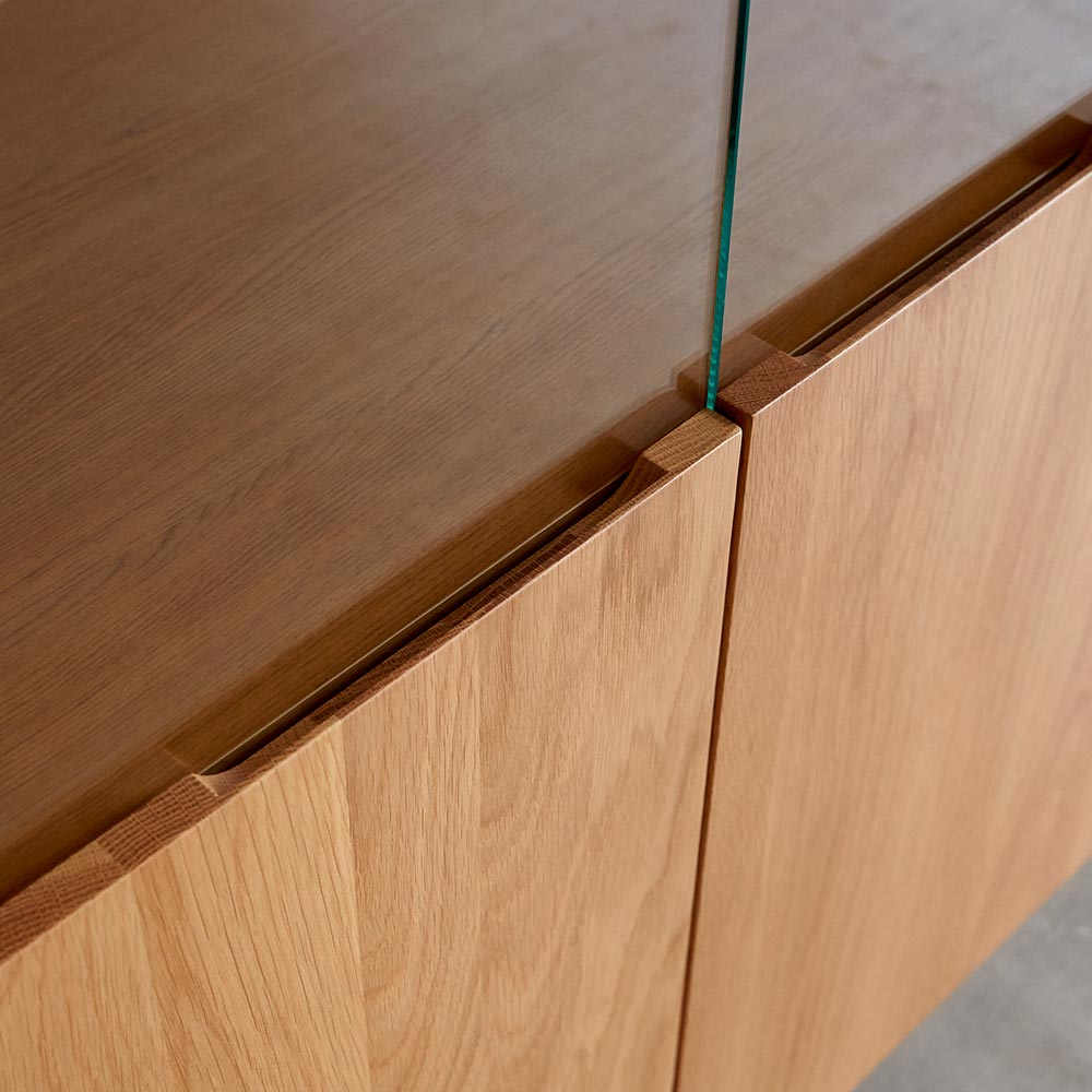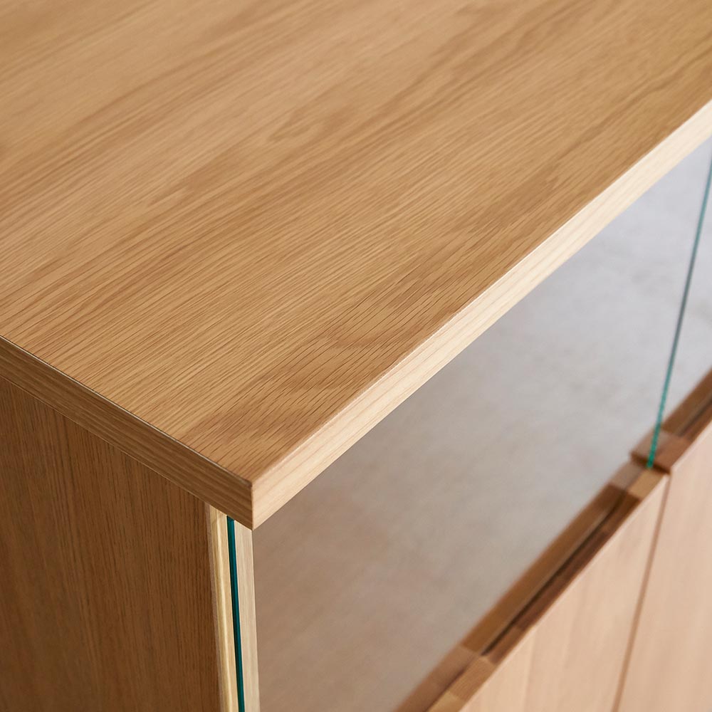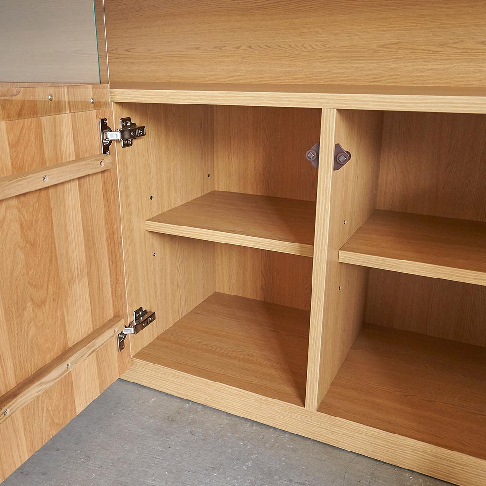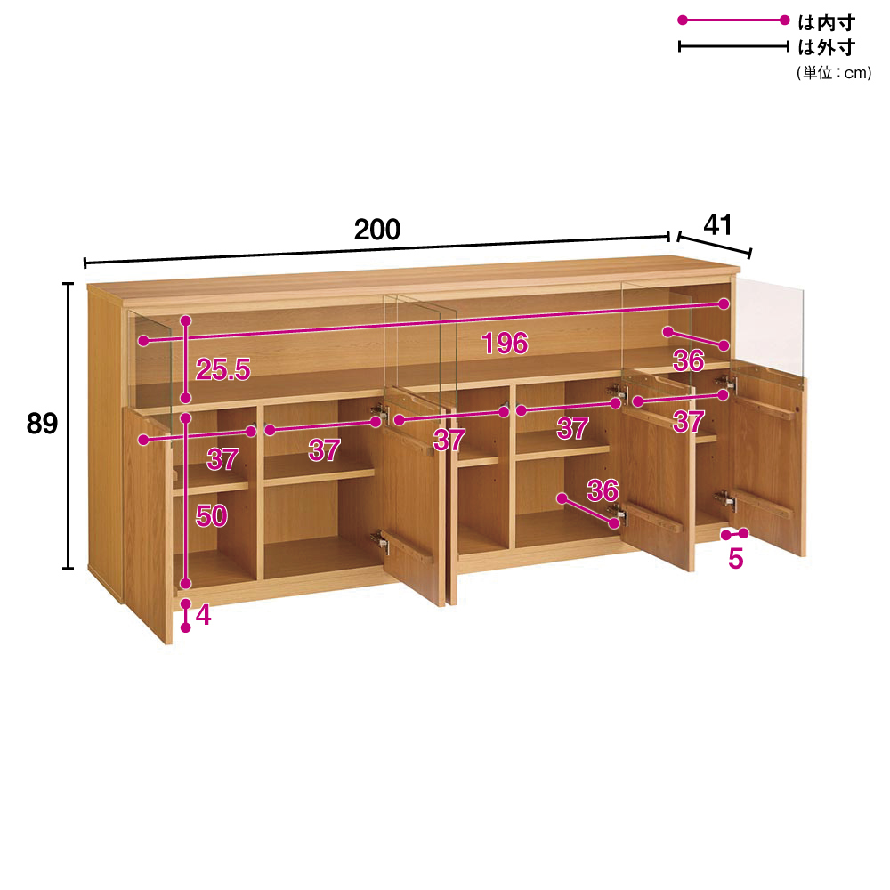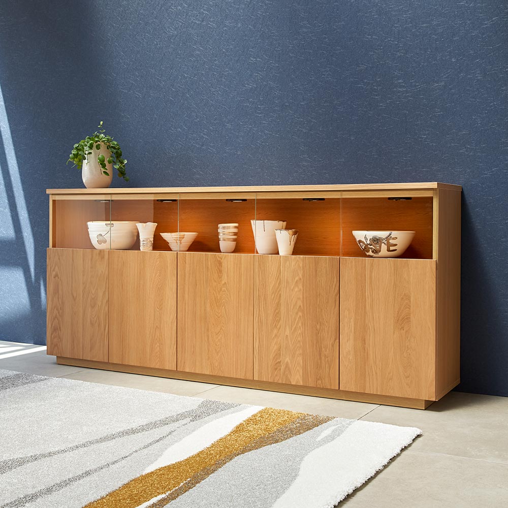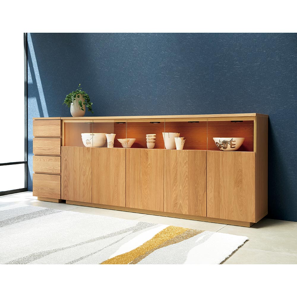 【開梱・設置料金込み】美術館のようなコレクション空間を 毎日の暮らしの中に。ステージのような美空間をLEDダウンライトが照らし、自慢のコレクションをディスプレイ。端正な木目のオーク天然木がコレクションの魅力をさらに高めます。コレクションをより上質に演出大切なコレクションをしまう場所にふさわしい重厚感。コレクションが引き立つ、LEDダウンライト付きのリビングボードです。扉の一部をガラスにしているので、お気に入りの食器やグラスなどのコレクションを魅せる楽しみも味わえます。ガラス付き扉は静かにゆっくり閉まるソフトクロージング仕様です。ディスプレイスペースは仕切りが無いので、横長の品もゆったり飾ることができます。美術館のようなサイドボードで、リビングルームを格調高い空間に。〜熟練の職人が丹精こめて生産しています〜熟練の家具職人がひとつずつ丁寧に仕上げたワンランク上の国産家具です。天然木素材を使用した商品のため色の誤差が多少あります。天然木ならではの風合いをお楽しみください。デザイン・仕様など細部に至るまでこだわったハウススタイリングが自信を持ってお勧めする日本製のディノス家具です。届いたらすぐ使えるのが嬉しい完成品本体は組立不要。届いたらすぐ使えるのが嬉しい完成品でお届けします。【オーク天然木について】明るく爽やかな印象を持ちながら、比較的しっかりとした主張の木目で力強さを感じさせるオーク材。涼しい地域で時間をかけゆっくり成長する木なので、密度が高く強度にも優れるといわれます。木目は細かくて美しく、家具用木材として人気があり高級家具としても流通しています。固くて強度が高く、力の加重や衝撃に比較的強いといった特徴をもちます。使うほどに少ずつ色が深くなり、味わい深くなる経年変化を楽しめます。