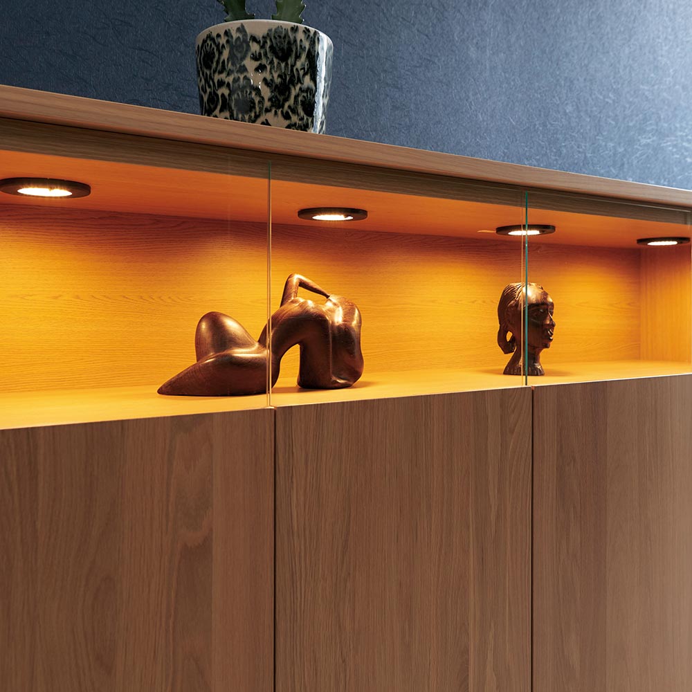 コレクションが引き立つ、LEDダウンライト付きのリビングボードです。
