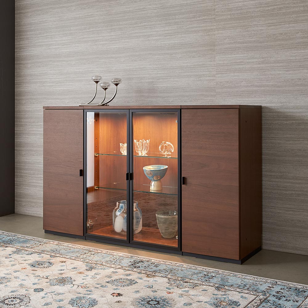 リビングに気品ある雰囲気をもたらす味わい深いウォルナットの板目が印象的なキャビネット。収納物をすっきりと隠せる板扉タイプです。圧迫感の少ない高さ95cmタイプ。LED付きガラス扉タイプと組み合わせれば、異素材のコントラストが美しいリビング収納空間が完成します。より上質にコレクションを収納深いウォルナット材が醸す、大切なコレクションをしまう場所にふさわしい重厚感。扉の内部には可動式の棚板が2枚付属。6cmピッチで高さ調整できます。扉は静かにゆっくり閉まるソフトクロージング仕様です。美しい天然木仕上げの扉の向こうに、愛蔵書のほかリビングのあれこれをまとめて収納して。美術館のようなキャビネットで、リビングルームを格調高い空間に。圧迫感の少ないミドルタイプの高さ95cm。リビングボードとして、出窓下やカウンター下にも置きやすいサイズです。扉の開閉方向が選べます。レイアウトに合わせ、右開き・左開きからお選びください。使いやすさにもこだわりました扉を開ければ大容量の収納空間が出現。大事な品々の大量収納も可能です。扉内の棚板は可動式。空間を無駄なく有効活用します。棚板は6cmピッチで高さ調整できます。愛蔵品や書籍の整理整頓ができて、探しやすくなるのもポイントです。シンプル・モダンに仕上げたデザインは、インテリアの和洋を問わずマッチします。素敵な見た目の飾り棚で、お洒落な印象のリビングが完成します。〜熟練の職人が丹精こめて生産しています〜熟練の家具職人がひとつずつ丁寧に仕上げたワンランク上の国産家具です。天然木素材を使用した商品のため色の誤差が多少あります。天然木ならではの風合いをお楽しみください。デザイン・仕様など細部に至るまでこだわったハウススタイリングが自信を持ってお勧めする日本製のディノス家具です。お気に入りのローボード・サイドボードでリビングや寝室をワンランク上の空間に。すぐ使えるのが嬉しい、取っ手取付のみの完成品でお届け本体は組立不要で簡単な取っ手の取付のみ。届いたらすぐ使えるのが嬉しい本体完成品でお届けします。【ウォールナットについて】ウォールナットはチークやマホガニーと並ぶ世界三大銘木ともいわれる高級な木材です。ウォールナットの特徴は、《衝撃に強い》、《重厚で狂いが少ない》、《美しい木目》等が上げられ、高級家具や工芸品の材料として非常に人気の高い素材です。また特徴の一つに経年変化も上げられ、もともとは深みある茶色いウォールナットですが、時間が経つにつれて明るい色合いへと変化していくので、使い込むほどに風合いが増していくのも魅力です。