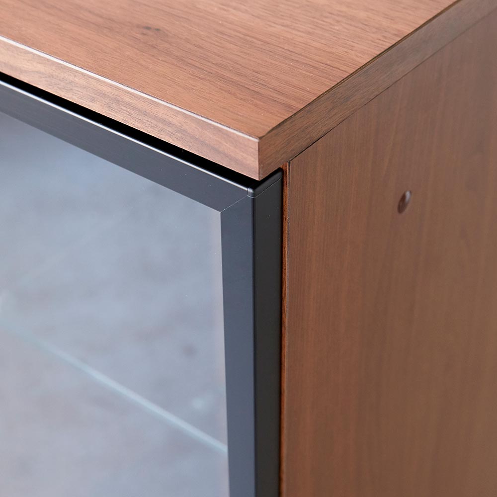 リビングに気品ある雰囲気をもたらす味わい深いウォルナット風の板目が印象的なキャビネット。ゆとりある高さとLEDダウンライトで、ブランドショップのようにリッチなディスプレイが楽しめます。下段は愛蔵書を見せて収納するのも素敵です。圧迫感の少ない高さ95cmタイプ。ディスプレイと収納を1台で上部はLEDダウンライトが付いたディスプレイスペース。2枚のガラス棚板で、3段に愛蔵品を見せながら収納できます。下部は木製棚板の収納空間。愛蔵書の収納などにおすすめ。ガラス付き扉は静かにゆっくり閉まるソフトクロージング仕様です。扉ガラスには飛散防止効果や紫外線を約98%前後遮蔽する効果のあるフィルム張りで、収納物を守ります。美術館のようなコレクション空間を 毎日の暮らしの中に。使いやすさにもこだわりました扉を開ければ大容量の収納空間が出現。大事な品々の大量収納も可能です。扉内の棚板は可動式。空間を無駄なく有効活用します。棚板は6cmピッチで高さ調整できます。愛蔵品や書籍の整理整頓ができて、探しやすくなるのもポイントです。シンプル・モダンに仕上げたデザインは、インテリアの和洋を問わずマッチします。素敵な見た目の飾り棚で、お洒落な印象のリビングが完成します。〜熟練の職人が丹精こめて生産しています〜熟練の家具職人がひとつずつ丁寧に仕上げたワンランク上の国産家具です。天然木素材を使用した商品のため色の誤差が多少あります。天然木ならではの風合いをお楽しみください。デザイン・仕様など細部に至るまでこだわったハウススタイリングが自信を持ってお勧めする日本製のディノス家具です。お気に入りのローボード・サイドボードでリビングや寝室をワンランク上の空間に。すぐ使えるのが嬉しい、取っ手取付のみの完成品でお届け本体は組立不要で簡単な取っ手の取付のみ。届いたらすぐ使えるのが嬉しい本体完成品でお届けします。【LEDライトについて】LED段ライト:タンブラースイッチ付き1つのライトの中にLED36灯使用消費電力1.4W LED寿命 約40000時間