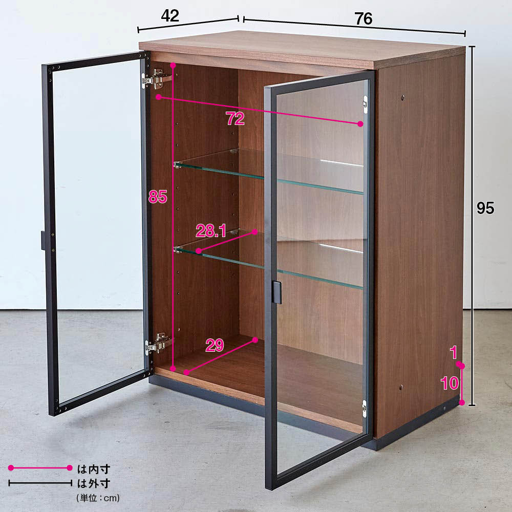 キャビネット 幅76高さ95cm ガラス扉LED