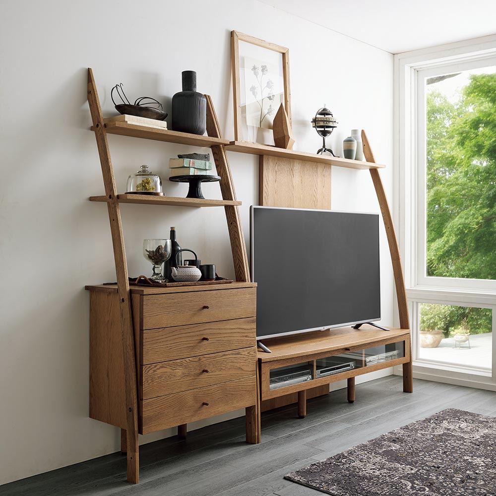柔らかなフォルムがどこか北欧らしい温かみのあるデザインで、空間の心地よい開放感とアクセントに。コーディネート例(右がキャビネット4杯チェスト、左がテレビ台幅150cm) (ア)オーク