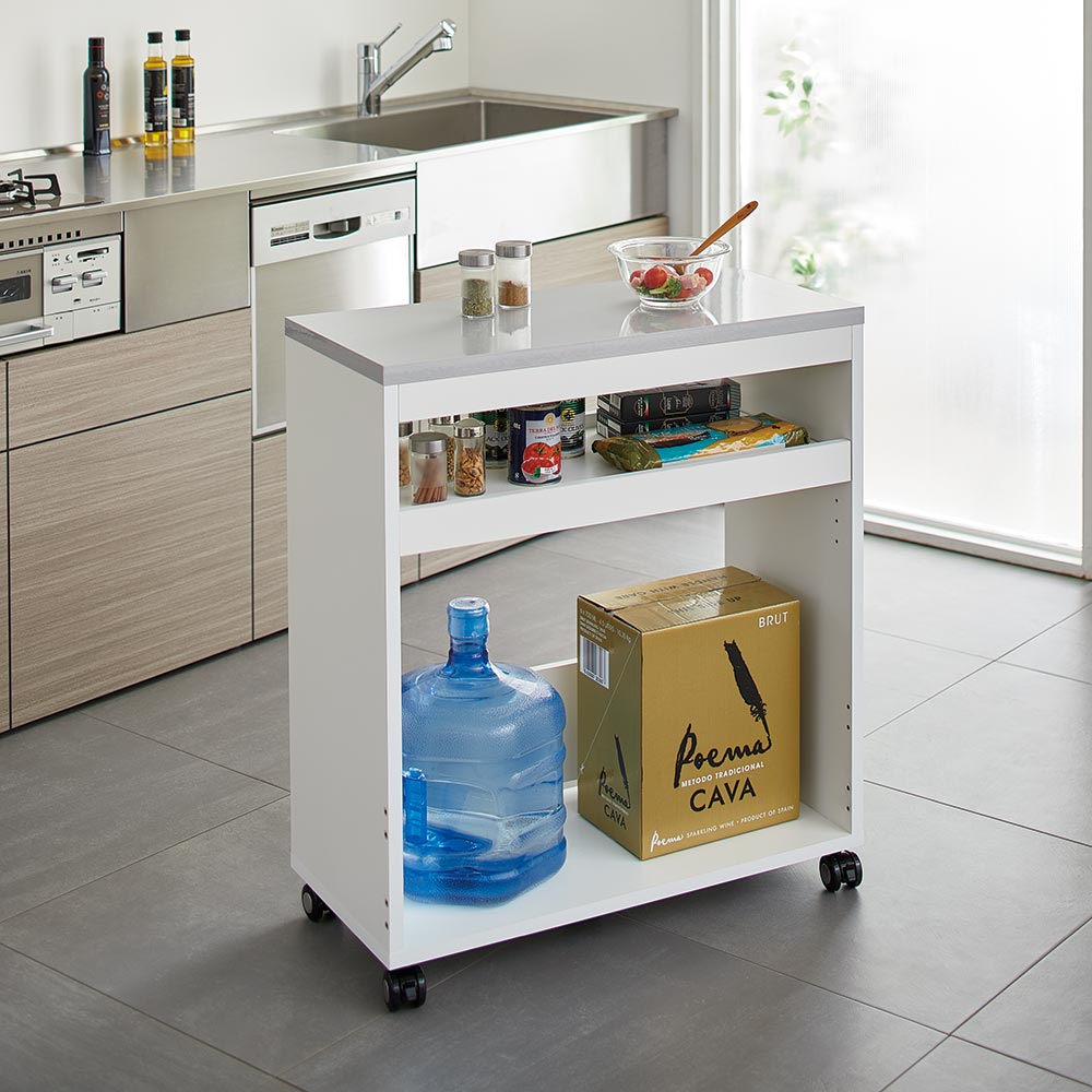 耐荷重50kgのがっしりワゴンをリニューアル!!まとめ買いした重たいペットボトルのほか、段ボールやお米をしっかり収納できる仕様にいたしました。下段の耐荷重は最大50kgで、おおよそ2Lペットボトル2ダース(24本)に相当します。買い置きストックが収納しやすいように設計された専用キッチン収納です。天板はサブの調理台にも◎重たい買い置きのペットボトル飲料をまとめて保管できるキッチンワゴンネットスーパーや食品の宅配システムでまとめて買った飲料・食品をまとめて収納できる頑丈な専用ワゴンです。下段の耐荷重は50kg※でおおよそ2Lペットボトル2ダース(24本)分に相当します。※耐荷重50kg=取り外し可能な補強板を2本しっかり取り付けた状態。ストック類がさらにしまいやすくなるようリニューアルしました!!これまではペットボトルなど飲料に特化した形状のワゴンでしたが、食品ストックを収納しておきたい…というお客様のご要望にお応えして野菜の入った段ボールや、お米なども出し入れしやすい仕様に変更いたしました!下段収納部の片側の補強板を取り外し可能にしたことで、大きな箱物も収納しやすくなっています。補強板はボルトで取り付けるだけ。収納したいものに合わせて補強板を取り付けてください。※補強板2枚を取り付けた状態であれば、耐荷重50kgです。補強板を外した状態では強度が多少落ちてしまうため、ご使用の際はご注意ください。飲料の収納にぴったり!サイズ感にもこだわりました下段の収納部の側板の高さは、2Lペットボトルだけでなく、他よく見られる買い置きの提案、500mlペットボトルとビール缶も仕舞いやすいよう設計しています。500mlペットボトルや350mlビール缶も出し入れしやすいように設計。350mlビール缶は上下に2個積めば上の缶が取り出しやすいサイズです。サブのストック収納として、サブの調理台としても活躍するキッチンストッカー・収納ワゴンワゴン内部に棚板を設け、お菓子や乾麺などの食品ストッカーとしても使用できるスペースを用意。棚板は可動式で、収納物に合わせて調整が可能。こぼれ止め付きでワゴンを動かくして物が落ちにくくなっています。天板は水汚れが落ちやすい表面材を採用。ちょっと濡れたボウルなどの仮置きにもなるので、調理台の延長としても便利ですお手入れが簡単な工夫も。下段のこぼれ止め下にはおおよそ2cmほどのすき間を開けました。どうしてもこういったワゴンの中にほこりが入ったりするもの。ゴミをかき出しやすいように隙間を設け、清潔を保つ工夫を施しました。面倒な組み立てのいらない完成品組み立て不要の完成商品でのお届けになります。届いたその日からキャスターをつけるだけですぐにご使用いただけます。安心と信頼の職人技が光る日本製・国産のキッチンストッカー熟練の家具職人がひとつずつ丁寧に仕上げたワンランク上の仕上がり。細部の丁寧な仕上がりなど日本製ならではの高品質なキッチン収納です。商品担当者からのメッセージもともとはペットボトルをはじめとした飲料ストックの収納に特化したアイテムでしたが、耐荷重50kgもあるならば、他の重たい食品ストック類やお米なども入れたいというお客様のお声から、リニューアルに向けて動き出しました。問屋様・メーカー様と協議を重ねて、飲料だけでなく段ボールやお米を出し入れできる形状にいたしました。キャスターや天板など、細部までこだわりがたくさん詰まった商品です。是非、ご自宅の買い置きグッズ収納にお役立ていただければ幸いです。