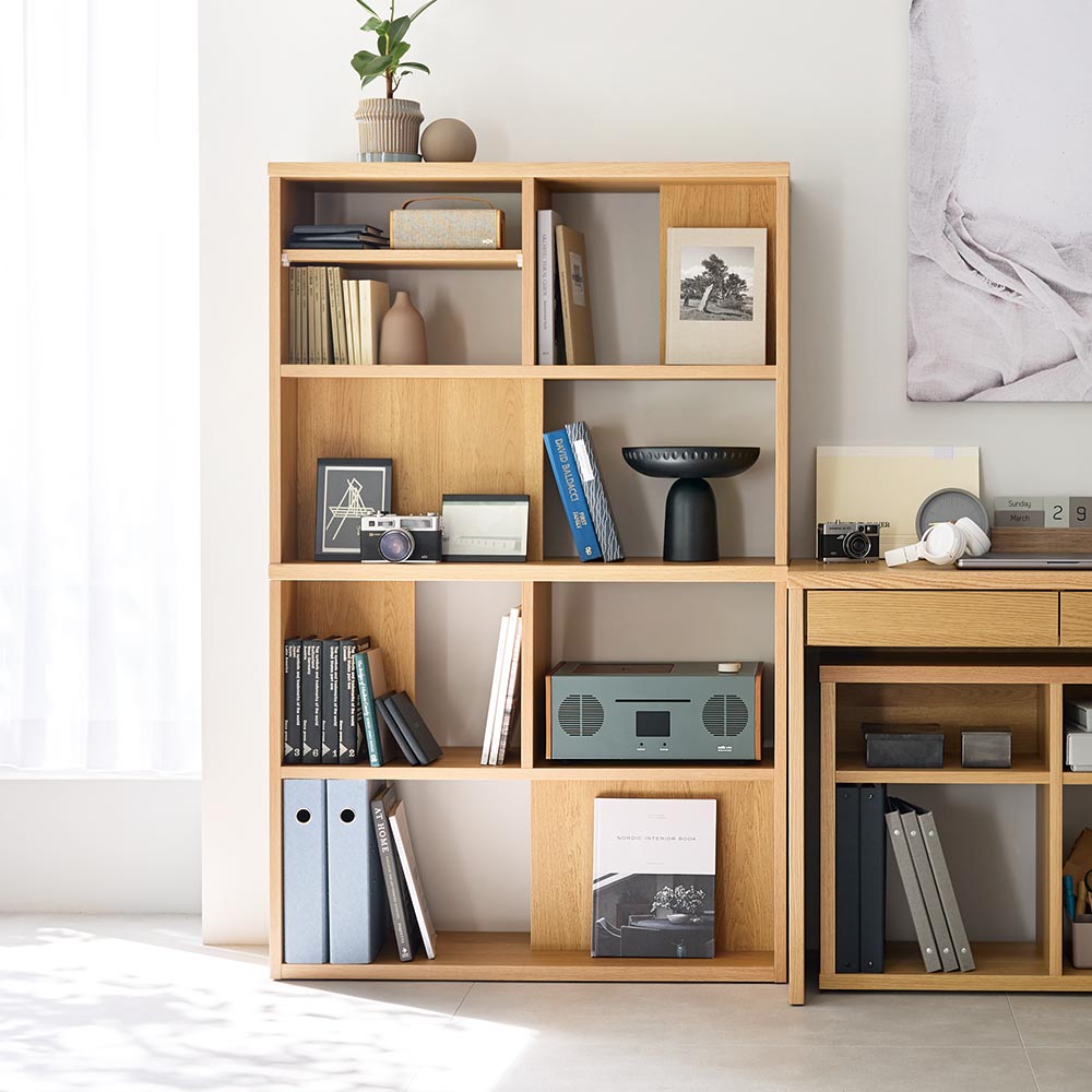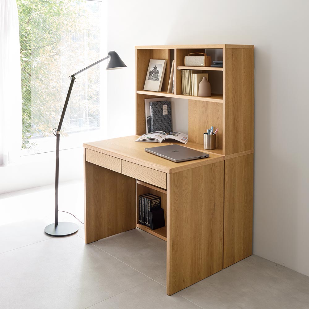 コーディネート例(イ)オーク ※お届けは左の幅90cmシェルフのみです。右はデスク幅90cmとオープンワゴンになります。