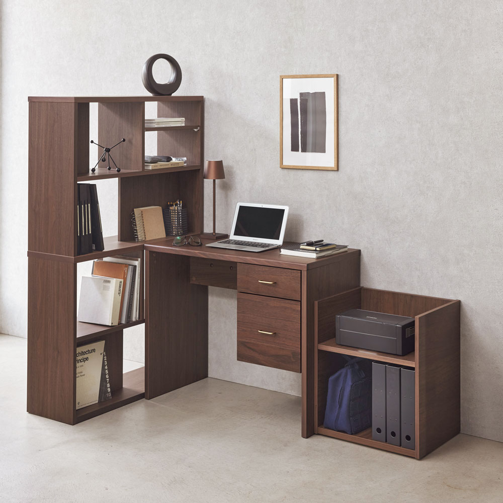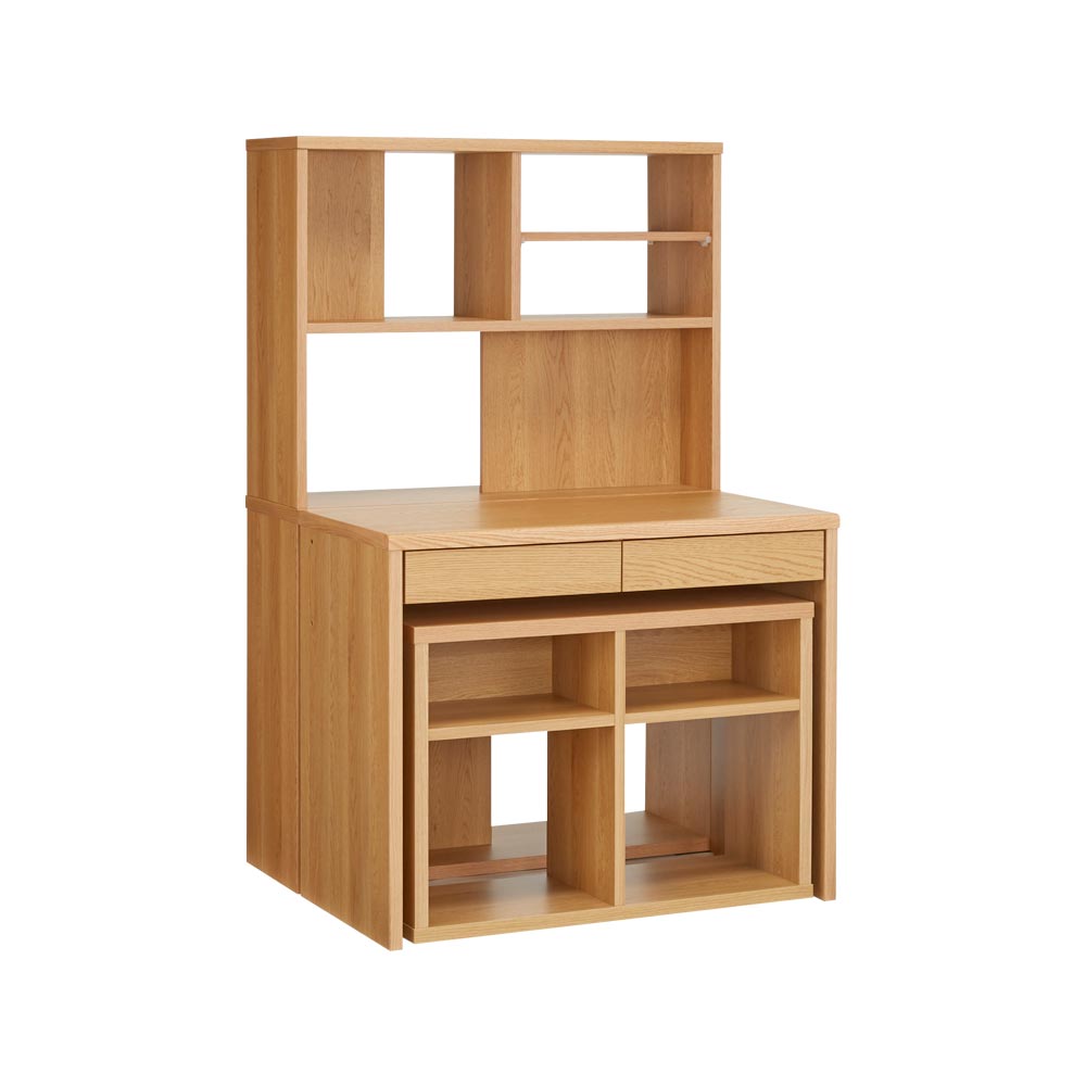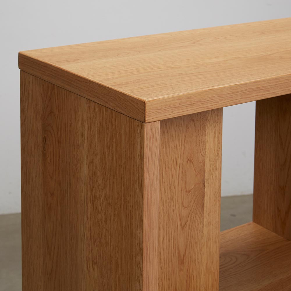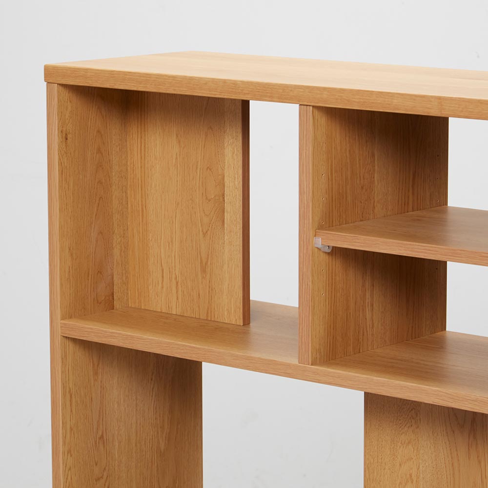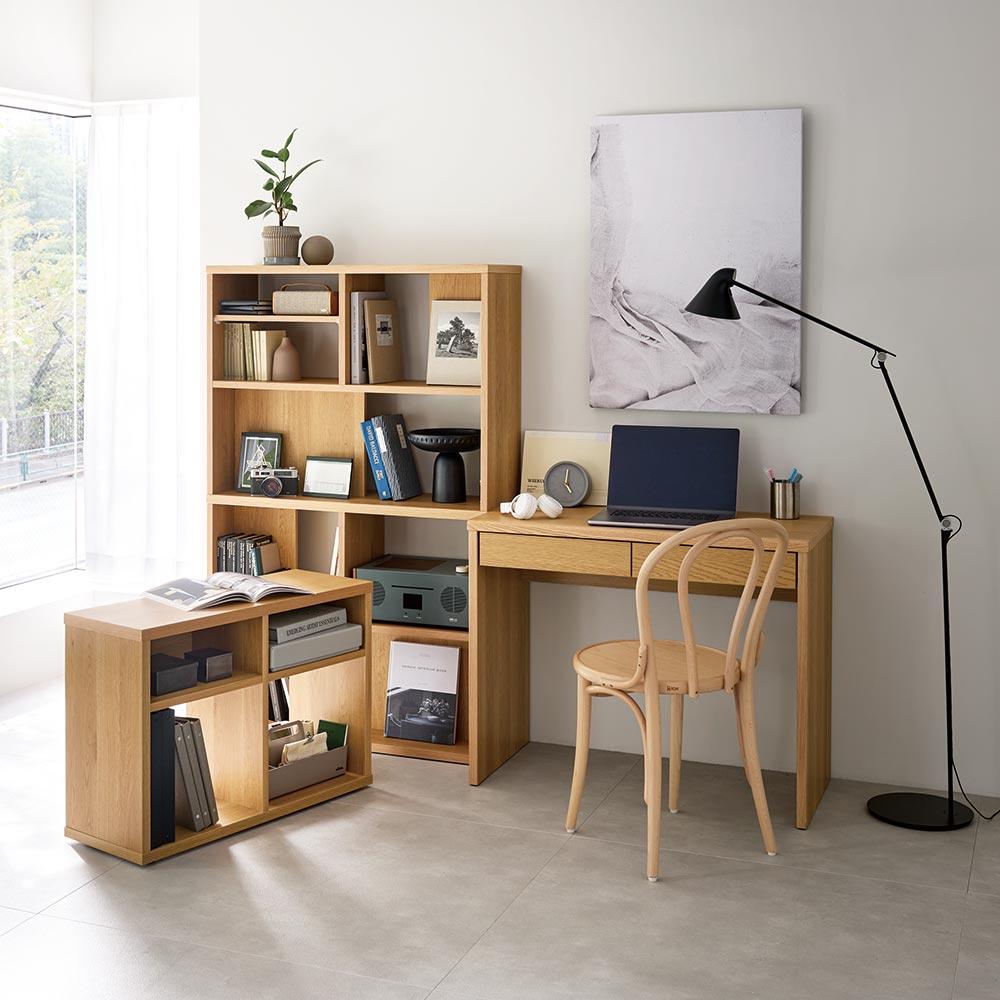 「普段はデスクに見えない」新発想。別売りのデスクと合わせることで、使い勝手の幅が広がります。シェルフ単体でもディスプレイ収納としてリビングでも書斎でも置き場を選ばないスタイルです。ONとOFFの切り替えができる新しいデスクシリーズOFFタイムはまるで棚のようにコンパクトに収納できる、シェルフが登場しました。リモートワークやリビング学習にも最適です。ONタイムは別売りのデスクと置けば、サイドラックのように使うこともできます。シーンに合わせてスタイルチェンジ別売りの平デスク、オープンワゴンを組み合わせることで書斎だけはなく、リビングにも対応したスタイルを作ることができます。おすすめの3つのSTYLEをご紹介します。STYLE01 リビングに作るまるでディスプレイ収納のようなワークデスクシェルフとデスクを横並びに設置して、オープンワゴンをデスク下に収納すれば、まるでディスプレイ型の見せる収納として、リビングやダイニング裏に設置ができます。使うときだけオープンワゴンを移動して、ダイニングチェアなどを使ってワークスペースに変身。場所を取らないスタイルとしておすすめです。STYLE02 作業しやすい奥行が広いワークデスク書斎として使うのに便利な奥行が深いデスクスタイル。シェルフの中段の棚とデスクの高さが揃うので、使い勝手も広がります。STYLE03 ものが取り出しやすいデスクサイドラックデスクの横に向きを替えて設置すれば、シェルフをデスクサイドラックとしても使用できます。横に設置することで間仕切りのように使うことも。デスク2台の間にシェルフを挟めば2名分のワークスペースを確保することも。シェルフの機能について背板のある部分と無い部分があるので、ディスプレイ収納のとして、おしゃれに飾ることも可能。デスクを挟んでシェルフを設置すれば、オープン部はどちらからも収納物を取り出すことができます。中段の棚はデスクと高さが揃うので、シェルフを奥に設置したり、デスクサイドラックのように横に設置することで使い勝手の幅が広がります。