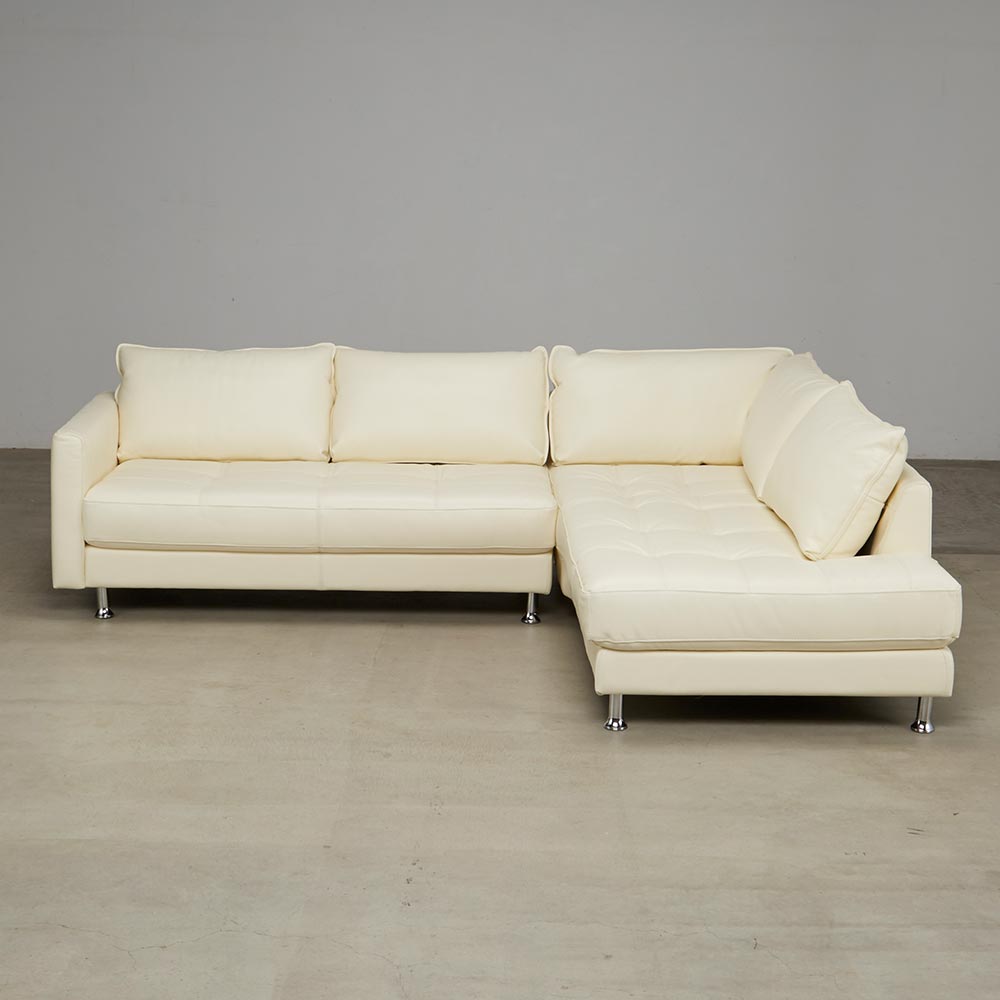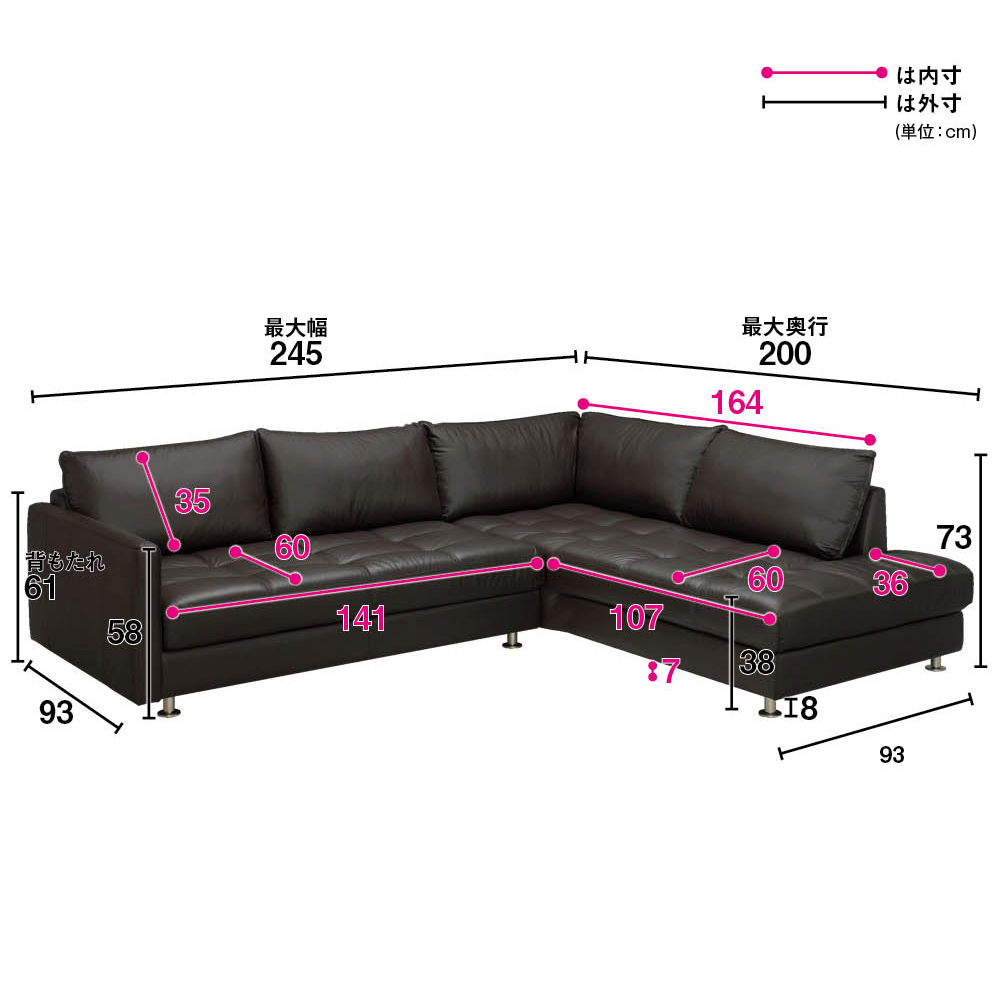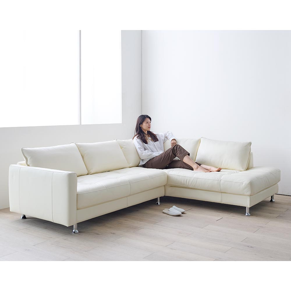 人気のソファがグレードアップ。丁寧にセミアニリン加工した約1.5mmの厚手の牛革を贅沢に使用しました。ハウススタイリングが信頼と実績のある中国のファクトリーとコラボレートしたソファシリーズ。素材の一貫生産による確かな品質と、高いコストパフォーマンスを実現したソファです。〜ディノス・ハウススタイリングのハイエンドのソファがさらにリニューアル〜2008年の発売からご好評をいただいているロングセラーの革張りソファ。今まで使用していた牛革が廃番になってしまったことで、厚くしなやかで上質な新しい革をまとって再登場です。〜定評のある牛本革を使用した総革張りソファ〜◎皮革メーカーとしても名高いファクトリーで生産され、その中で厳選された1.4〜1.6mmの厚手の牛革を使用した本革製ソファです。◎牛革は革本来の質感を味わえるかつお手入れもしやすいセミアニリン仕上げを施しています。◎側面、背面まで本革を使用した総革張りソファです。◎定番の2色、オフホワイト・ダークブラウンからお選びいただけます。 オフホワイト:真っ白ではなく、ほんの少し黄色味が感じられる上品で自然なカラーです ダークブラウン:ビターチョコレートのような、深みのある濃い茶色です◎背クッションは、継ぎはぎのない大判の革を使用した贅沢な仕様です。〜美しいフォルムが織りなすスタイリッシュなモダンスタイル〜◎シンプルなフォルムの美しさ、ダブルステッチでキルティングされた上質な牛革が更なるラグジュアリー空間を演出します。◎シャープなデザインの肘掛けと美しいクロムメッキのスチール製の脚部が絶妙なバランスの本革ソファーです。〜コンパクトながらワイドなリラックス感〜◎全体的にややロータイプにデザインされたL字のコーナーソファセットなのでお部屋に置いた時にシャープに見え、お部屋が引き締まります。◎広々とした座面サイズながら、お部屋に圧迫感を与えないすっきりとしたデザインです。◎シャープなデザインの肘掛けもポイント。肘掛けが細めなので、その分リラックスできる有効幅がたっぷりと確保できました。◎オープンエンドのカウチは、並んで腰かけることも、深く座って脚を伸ばすこともできる余裕のサイズです。〜快適さと丈夫さへのこだわり〜◎ソファ内部のベースに、張りのあるウェビングベルト、クッションには高密度のウレタンフォームを使用しました。しなやかな沈み込みかつ、しっかり体重を支える耐久性のあるシートは長時間座っても快適です。◎一番力のかかる座面はダブルステッチでしっかり縫製し、立体感のあるキルティングに仕上げています。◎背クッションには大きな1枚革をぜいたくに使い、エッジを際立たせた縫製を施しました。◎背クッションにはポリエステルわたの繊維を短く加工し、弾力性を増したフィリングをたっぷりと使用。背もたれは柔らかめの感覚に。〜ここもポイント〜◎片肘ソファとカウチは連結されていません。すべて牛革で張られていますので、離してのご使用もできます。◎分割してお部屋に搬入できるので、間口が狭くても安心(とはいえ大型なので搬入経路のご確認をお願いいたします)。〜バイヤーメッセージ〜革のなめしから、ウレタン・フレームまでを一貫生産しているので、品質の悪い材料があった場合にはその場で状態の良いものに交換することができます。確実な品質管理があってこその上質な品質。そんなファクトリーとディノス「ハウススタイリング」とのコラボ商品です。革のクオリティからソファ内部までこだわりました。また、日本の住環境に合わせたサイズ感も魅力コーナーソファで、日常の暮らしにフィットしたサイズでお楽しみいただけます。そんな特別な商品をお値打ちバリュープライスでご提供しています。存在感あるレザーソファでお部屋をラグジュアリーなリビングルームに演出してください。