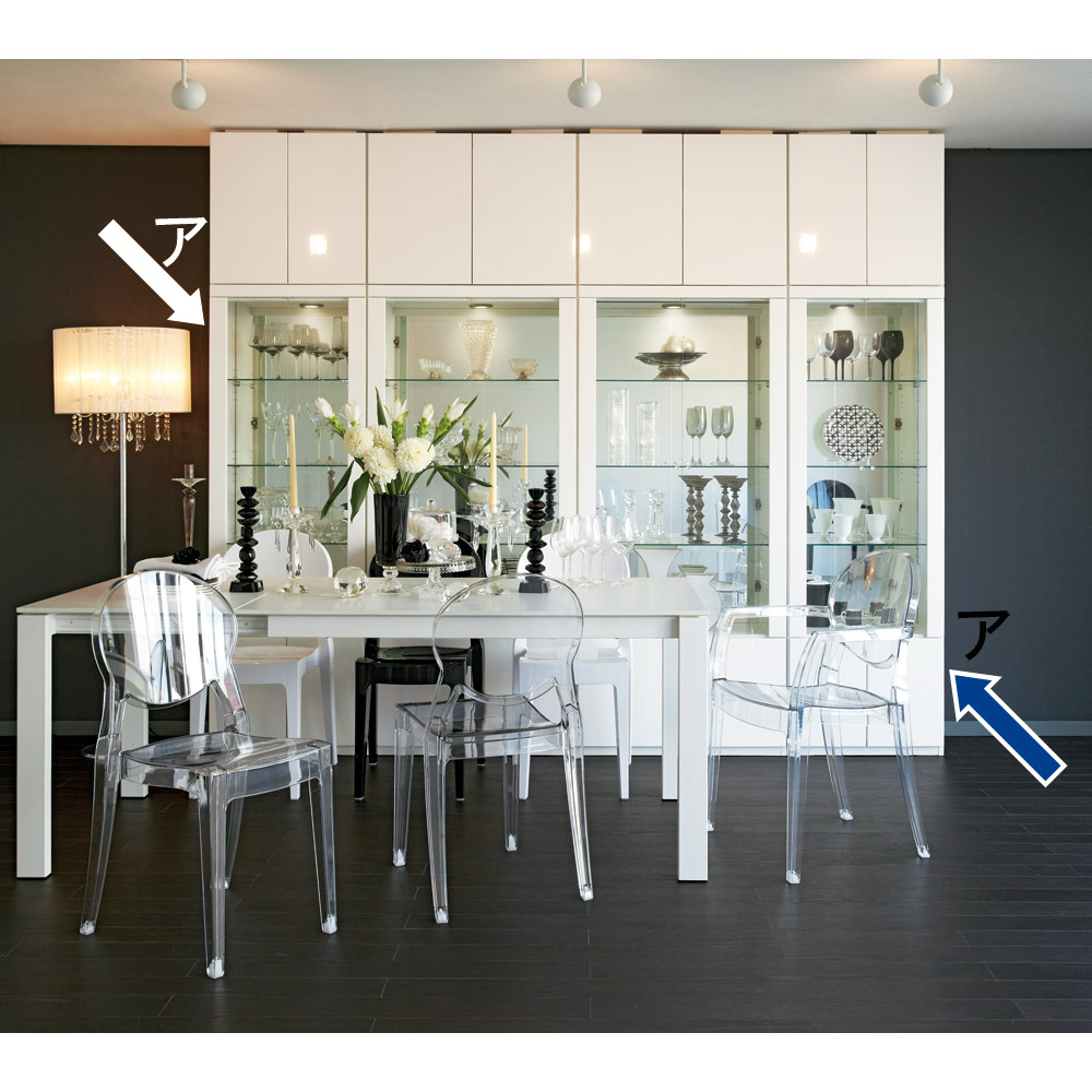 (ア)ホワイト色は、曇りのないつややかな光沢感も魅力。窓から差し込む光、お部屋のライティングを受けてそのツヤ感がさらに際立ちます。