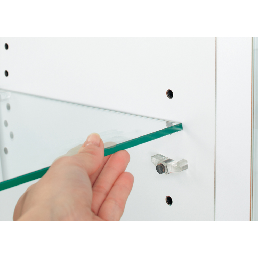ガラス棚は簡単に可動 3cmピッチで調節可能で、さまざまな形状のものを飾れます。
