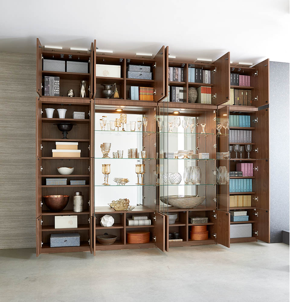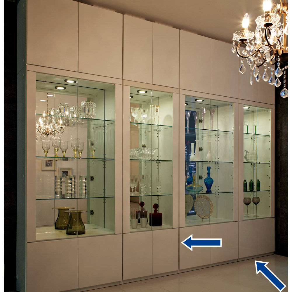 省エネ&長寿命のLEDライトを採用したダウンライトが、自慢のコレクションを美しく演出。さらに、背面のミラーにライトが反射することでラグジュアリーな輝きがいっそう増し、自分だけのミュージアムのような収納を実現します。