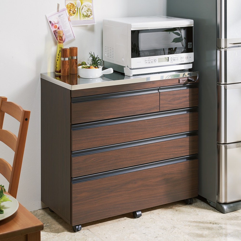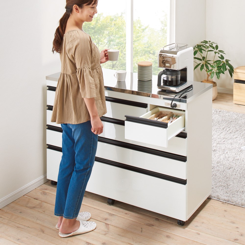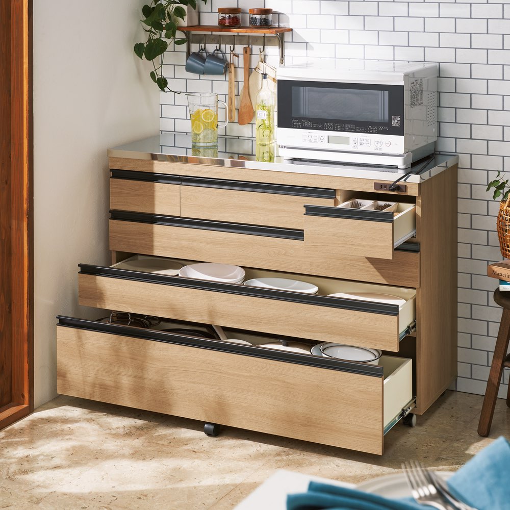 対面カウンターにも間仕切りにもできる、ステンレス天板のキッチン収納が新発売!食器やストック用品、カトラリーや鍋などの整理整頓のしやすさに徹底的にこだわった技あり設計なので、家族みんなが楽しくなり、料理の支度もテキパキはかどります。おしゃれなデザインだから、北欧インテリアやブルックリンスタイルにもぴったりです。引き出しの収納力が違います!料理の支度もテキパキ時短に!◇たくさん小分けされ、入れるものに合わせた引出しのサイズ設計により、何かと大きさがバラバラなキッチン用品、お箸やフォーク、お皿や鍋などを効率よく整理整頓できる技あり設計。◇引出し式なので、奥のものまで一目で見渡せて、探すのも取り出すのもラクラク。◇1段目の引出しは、カトラリーやラップなど、キッチンまわりの細々したものの収納に便利です。◇引出しには、動かせる仕切りが1枚ついているので、引き出し内を効率良く整理することができます。◇2・3段目の引出しは有効高さ9cm。お皿やお椀、お盆やタッパーなどを収納するのに便利です。フルスライドレール付きで開閉スムーズです。◇4段目の引出しは有効高さ15cmと深め。鍋やフライパン、大皿や食品ストックなど、重くかさばるものを収納できます。フルスライドレールなので、重いものも軽々と出し入れできます。◇食品ストッカー・キッチンストッカーとしても優秀です。天板は、ステンレス製。水や汚れにも強い素材で、高級感もあふれます。◇光沢のあるステンレス天板は、汚れやすい台所の味方。水汚れに強く、調味料をこぼしてもさっと拭いてお手入れ簡単。◇熱にも強いので、鍋など熱いものを扱うときも安心です。◇ステンレス天板部までの高さは85cmで、作業台としても使いやすい高さです。◇家電置きスペースとしてはもちろん、調理台としてお使いいただくにもピッタリです。大型スチームレンジも対応!奥行44cmのレンジラック◇置き場所に困ってしまう大型スチームレンジを乗せることのできる家電台として使用できる設計。◇大型スチームレンジは通常のレンジに比べ奥行が広く、普通のレンジ台には収まらないことも。◇このシリーズの家電ラックは天板部分の奥行が45cmと広々。◇諦めていた大型レンジも乗せられる心強い家電収納です。◇もちろん2口コンセント付きでレンジラックとしてはもちろん、トースターや炊飯器やポット、コーヒーメーカーなども置けます。家族みんなで使える工夫がたくさん!◇キャスター付きで移動ラクラクだから、料理の時の配膳や、掃除のときも移動できて便利です。◇動かさないときはストッパーを付けられ、安全にも配慮しています。◇美しい背面化粧仕上げだから、間仕切りや対面カウンターとしても使えるので、家族みんなで料理の準備ができます。◇本体高さ85cmは、一般的なキッチンのシンクと同じ位の高さなので、家族みんなが天板をつかいやすい高さ感です。女性バイヤーのこだわり。インテリアに調和するおしゃれなデザイン性。市販のキッチンカウンターは、便利だけど、インテリア性がちょっと…そんなお客様からのご要望にお応えして、女性バイヤーが細かいところまでデザインにこだわりました。便利な機能性にとどまらず、おしゃれなデザイン性も自慢です。◇取っ手は、つやのない黒色の取っ手を選別。北欧インテリアやブルックリンスタイルにもぴったりの人気のデザインです。◇(ア)ナチュラルオークは、ラフな素材感が美しいオーク天然木の素材感のあるシートを選別しました。節もありリアルな質感が自慢です。◇(イ)ホワイトは、光沢感のあるスタイリッシュなデザイン。前板はオレフィン化粧合板を使用しており、水や汚れにも強い素材を選別しました。◇(ウ)ウォルナットは、ウォルナット天然木の木目の素材感のあるシートを選別しました。流れるような木目、リアルな質感がモダンインテリアにぴったりです。安心と信頼の国内生産品◇熟練の家具職人がひとつずつ丁寧に仕上げた、、日本製のキッチン収納・キッチンワゴンです。◇細部の丁寧な仕上がりなど、国産品ならではの高品質をお楽しみください。◇素材の安全性にもこだわり、ホルムアルデヒドの放出を抑えるF☆☆☆☆の素材のみを使用いたしました。小さなお子様のいるご家庭でも安心です。◇商品は完成品でお届けするので、面倒な組み立てがいらず、届いたらすぐに使えるのが嬉しいポイントです。◇お客様にて、キャスターのみ取り付けをお願いいたします。(重量のある商品のため、女性の方など心配な方は、有料の取り付けサービスをご利用ください。)