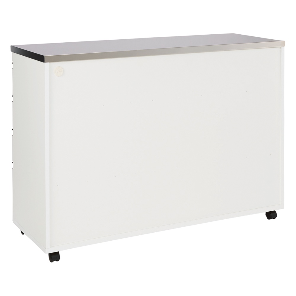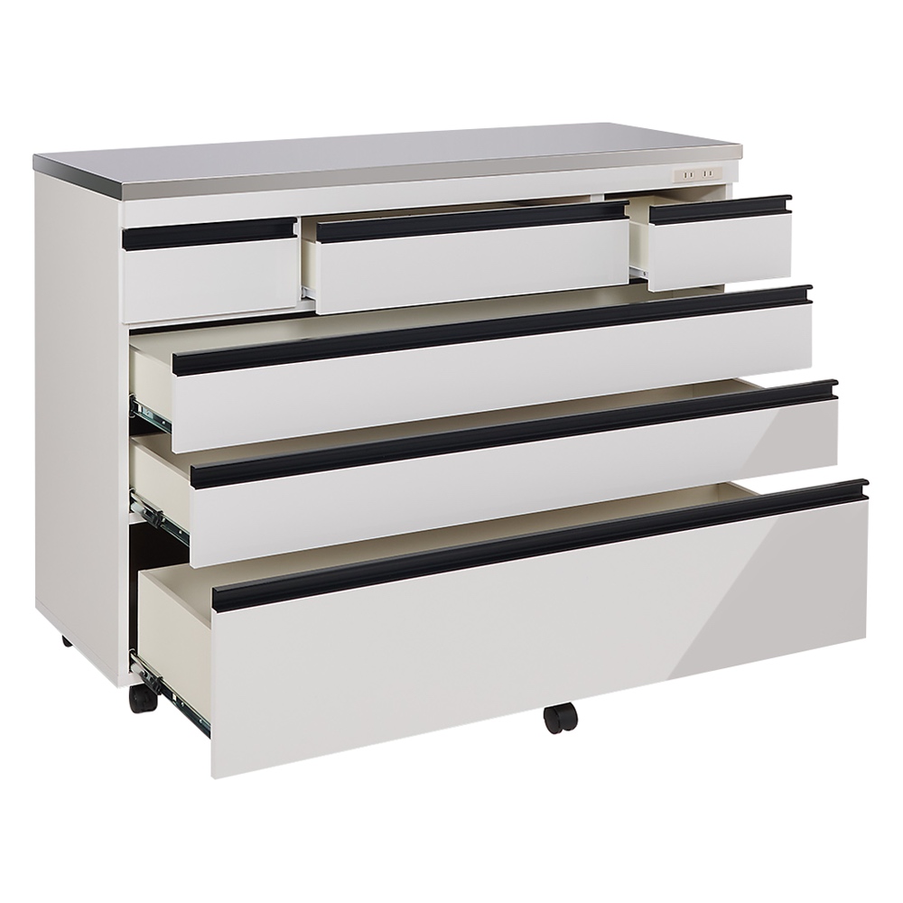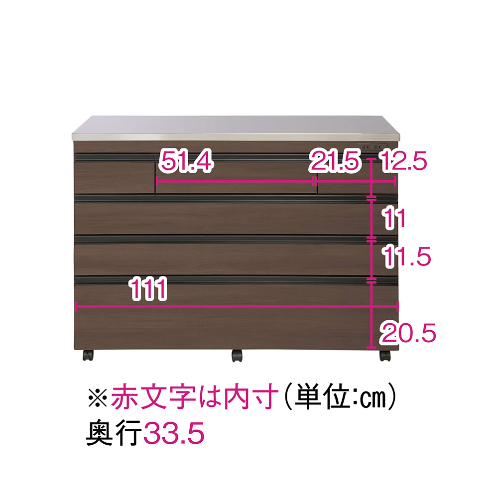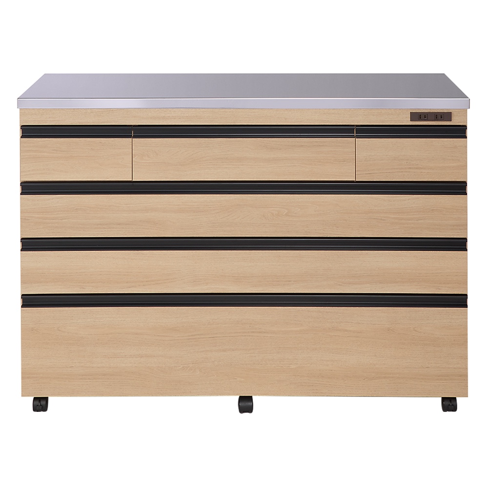 対面カウンターにも間仕切りにもできる、ステンレス天板のキッチン収納が新発売!食器やストック用品、カトラリーや鍋などの整理整頓のしやすさに徹底的にこだわった技あり設計なので、家族みんなが楽しくなり、料理の支度もテキパキはかどります。おしゃれなデザインだから、北欧インテリアやブルックリンスタイルにもぴったりです。引き出しの収納力が違います!料理の支度もテキパキ時短に!◇たくさん小分けされ、入れるものに合わせた引出しのサイズ設計により、何かと大きさがバラバラなキッチン用品、お箸やフォーク、お皿や鍋などを効率よく整理整頓できる技あり設計。◇引出し式なので、奥のものまで一目で見渡せて、探すのも取り出すのもラクラク。◇1段目の引出しは、カトラリーやラップなど、キッチンまわりの細々したものの収納に便利です。◇引出しには、動かせる仕切りが1枚ついているので、引き出し内を効率良く整理することができます。◇2・3段目の引出しは有効高さ9cm。お皿やお椀、お盆やタッパーなどを収納するのに便利です。フルスライドレール付きで開閉スムーズです。◇4段目の引出しは有効高さ15cmと深め。鍋やフライパン、大皿や食品ストックなど、重くかさばるものを収納できます。フルスライドレールなので、重いものも軽々と出し入れできます。◇食品ストッカー・キッチンストッカーとしても優秀です。天板は、ステンレス製。水や汚れにも強い素材で、高級感もあふれます。◇光沢のあるステンレス天板は、汚れやすい台所の味方。水汚れに強く、調味料をこぼしてもさっと拭いてお手入れ簡単。◇熱にも強いので、鍋など熱いものを扱うときも安心です。◇ステンレス天板部までの高さは85cmで、作業台としても使いやすい高さです。◇家電置きスペースとしてはもちろん、調理台としてお使いいただくにもピッタリです。大型スチームレンジも対応!奥行44cmのレンジラック◇置き場所に困ってしまう大型スチームレンジを乗せることのできる家電台として使用できる設計。◇大型スチームレンジは通常のレンジに比べ奥行が広く、普通のレンジ台には収まらないことも。◇このシリーズの家電ラックは天板部分の奥行が45cmと広々。◇諦めていた大型レンジも乗せられる心強い家電収納です。◇もちろん2口コンセント付きでレンジラックとしてはもちろん、トースターや炊飯器やポット、コーヒーメーカーなども置けます。家族みんなで使える工夫がたくさん!◇キャスター付きで移動ラクラクだから、料理の時の配膳や、掃除のときも移動できて便利です。◇動かさないときはストッパーを付けられ、安全にも配慮しています。◇美しい背面化粧仕上げだから、間仕切りや対面カウンターとしても使えるので、家族みんなで料理の準備ができます。◇本体高さ85cmは、一般的なキッチンのシンクと同じ位の高さなので、家族みんなが天板をつかいやすい高さ感です。女性バイヤーのこだわり。インテリアに調和するおしゃれなデザイン性。市販のキッチンカウンターは、便利だけど、インテリア性がちょっと…そんなお客様からのご要望にお応えして、女性バイヤーが細かいところまでデザインにこだわりました。便利な機能性にとどまらず、おしゃれなデザイン性も自慢です。◇取っ手は、つやのない黒色の取っ手を選別。北欧インテリアやブルックリンスタイルにもぴったりの人気のデザインです。◇(ア)ナチュラルオークは、ラフな素材感が美しいオーク天然木の素材感のあるシートを選別しました。節もありリアルな質感が自慢です。◇(イ)ホワイトは、光沢感のあるスタイリッシュなデザイン。前板はオレフィン化粧合板を使用しており、水や汚れにも強い素材を選別しました。◇(ウ)ウォルナットは、ウォルナット天然木の木目の素材感のあるシートを選別しました。流れるような木目、リアルな質感がモダンインテリアにぴったりです。安心と信頼の国内生産品◇熟練の家具職人がひとつずつ丁寧に仕上げた、、日本製のキッチン収納・キッチンワゴンです。◇細部の丁寧な仕上がりなど、国産品ならではの高品質をお楽しみください。◇素材の安全性にもこだわり、ホルムアルデヒドの放出を抑えるF☆☆☆☆の素材のみを使用いたしました。小さなお子様のいるご家庭でも安心です。◇商品は完成品でお届けするので、面倒な組み立てがいらず、届いたらすぐに使えるのが嬉しいポイントです。◇お客様にて、キャスターのみ取り付けをお願いいたします。(重量のある商品のため、女性の方など心配な方は、有料の取り付けサービスをご利用ください。)