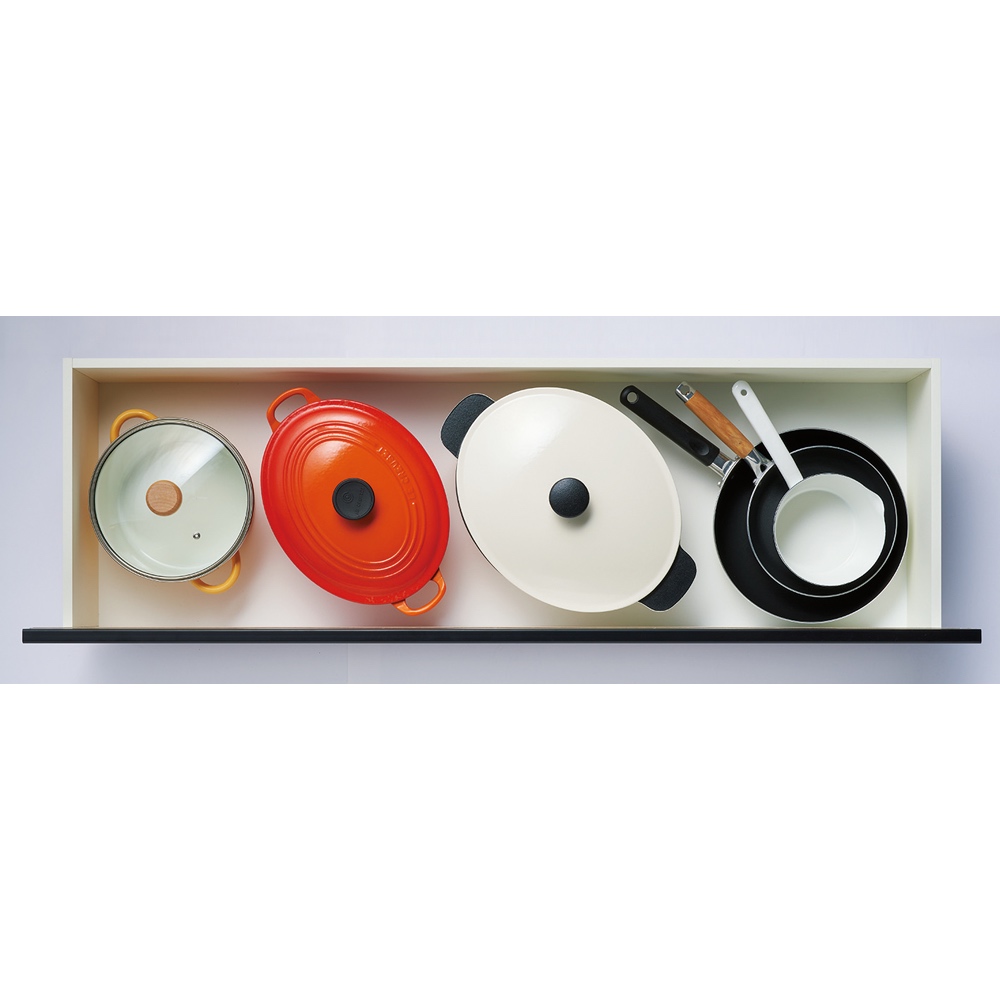 【4段目】鍋やフライパン、大皿や食品ストックなど。引き出し内寸=幅111奥行33.5高さ15cm