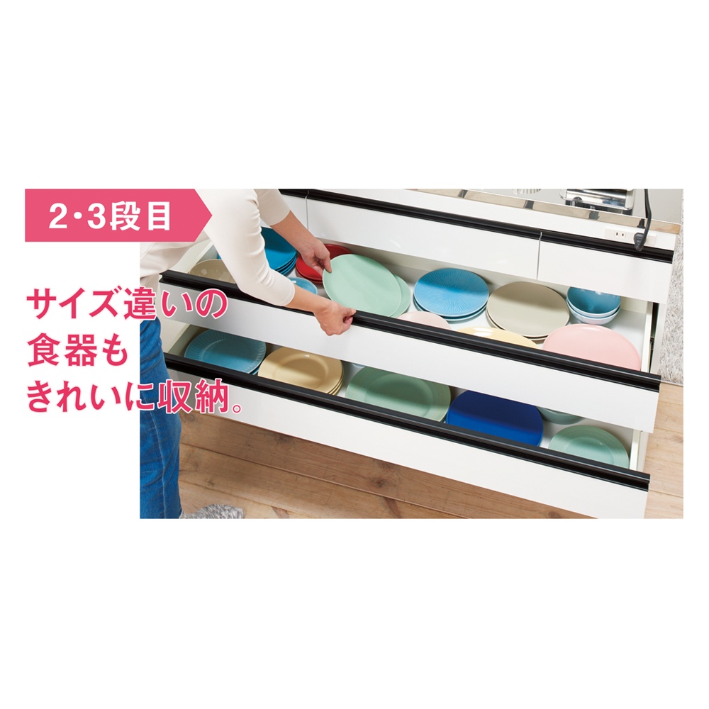 【2・3段目】お皿、お椀、お盆やタッパーなど。引き出し内寸=幅111奥行33.5高さ9cm