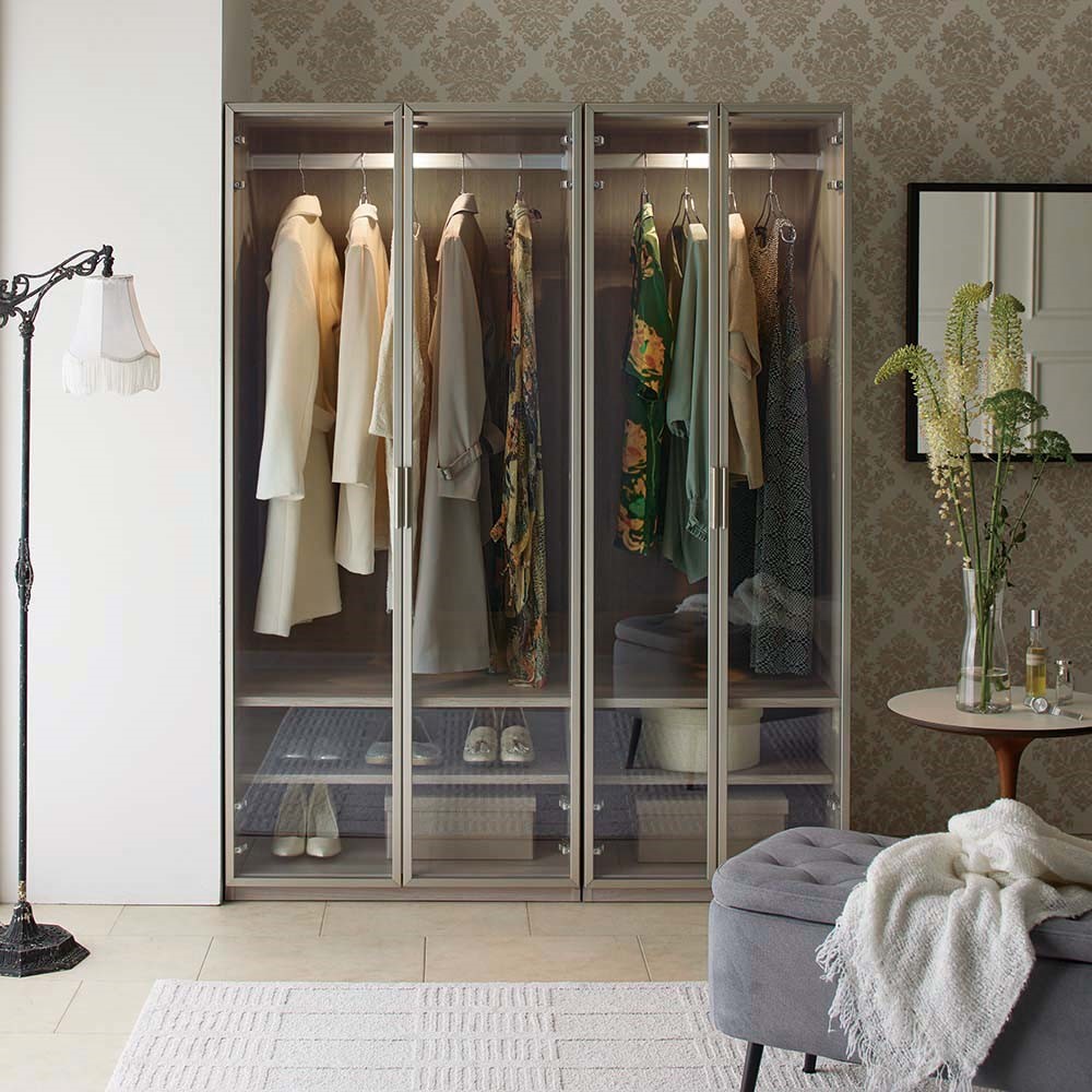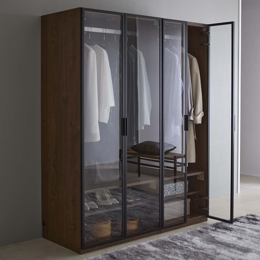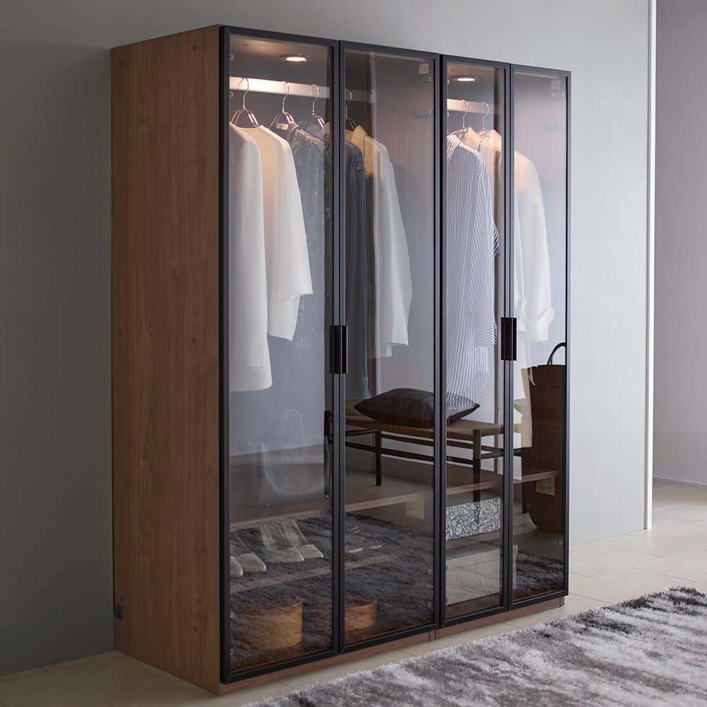 お気に入りの服や小物を飾るようにしまって“魅せる収納”を。LEDライトがコレクションを美しく照らします。ガラス扉で一目で見渡せてお出かけ準備もスピーディ。「美しく飾る」を追求したワードローブ■お気に入りの洋服やバッグを飾り毎日の暮らしの中に。コレクションを美しく魅せることにこだわった衣類収納です。 ■LEDライトが美しく照らしてくれます。ライト自体は天板裏に付いているので上から収納物を美しく照らす高級感のある仕様です。■飾るものがしっかり見えるように扉枠は出来る限り細身のスタイリッシュなデザインを採用しました。■ガラス付き扉は静かにゆっくり閉まるソフトクロージング仕様です。■上質でモダンなデザインなのでリビングや寝室に置いても。ワンランク上の空間に。■ハンガー収納部の高さは130cm(ハンガーパイプの下は約120cm)。ロングコートなども収納可能です。〜熟練の職人が丹精こめて生産しています〜家具の町、「福岡県大川市」の老舗メーカーが作った、ガラス扉のワードローブです。お気に入りの洋服やコートを収納でき、LEDライトでブティックのように魅せる収納が叶います。ガラス扉を囲うフレームはシャンパンゴールドとブラックのアルミフレーム。ガラス扉は開け閉めの衝撃も心配ですが、丁番には閉まる直前でゆっくりと閉まるようにできる特別な丁番を使用しています。お店で見つけにくいデザインで、かつお求めやすい価格に設定した、イチオシのアイテムです。