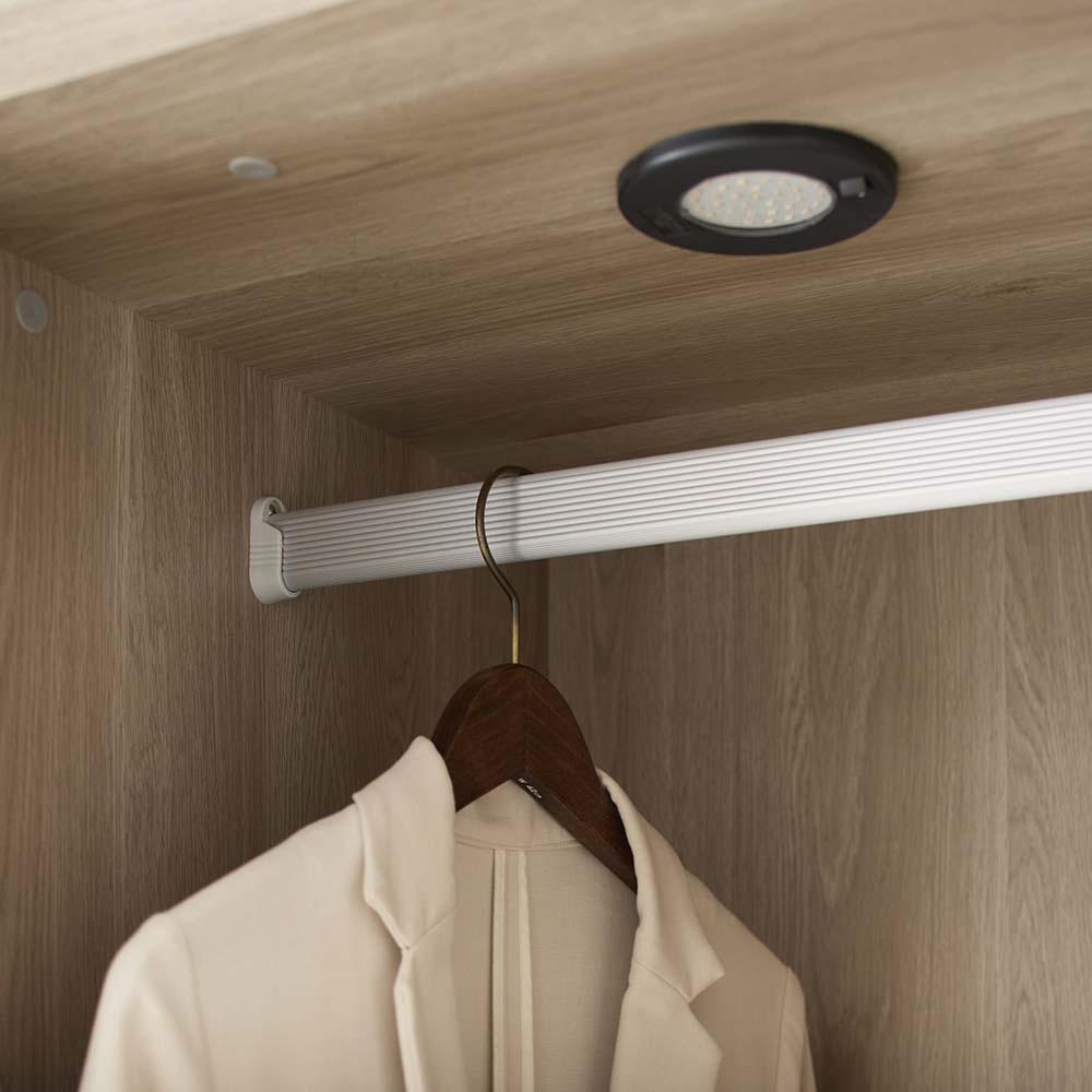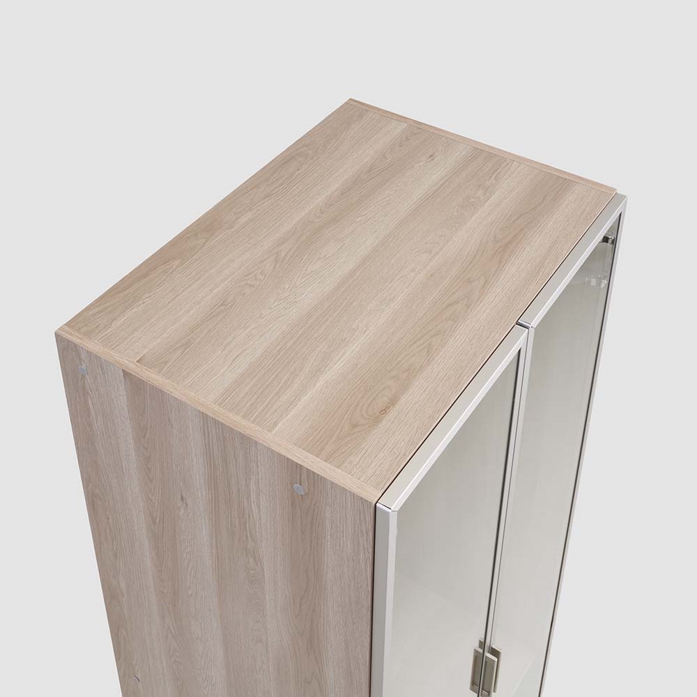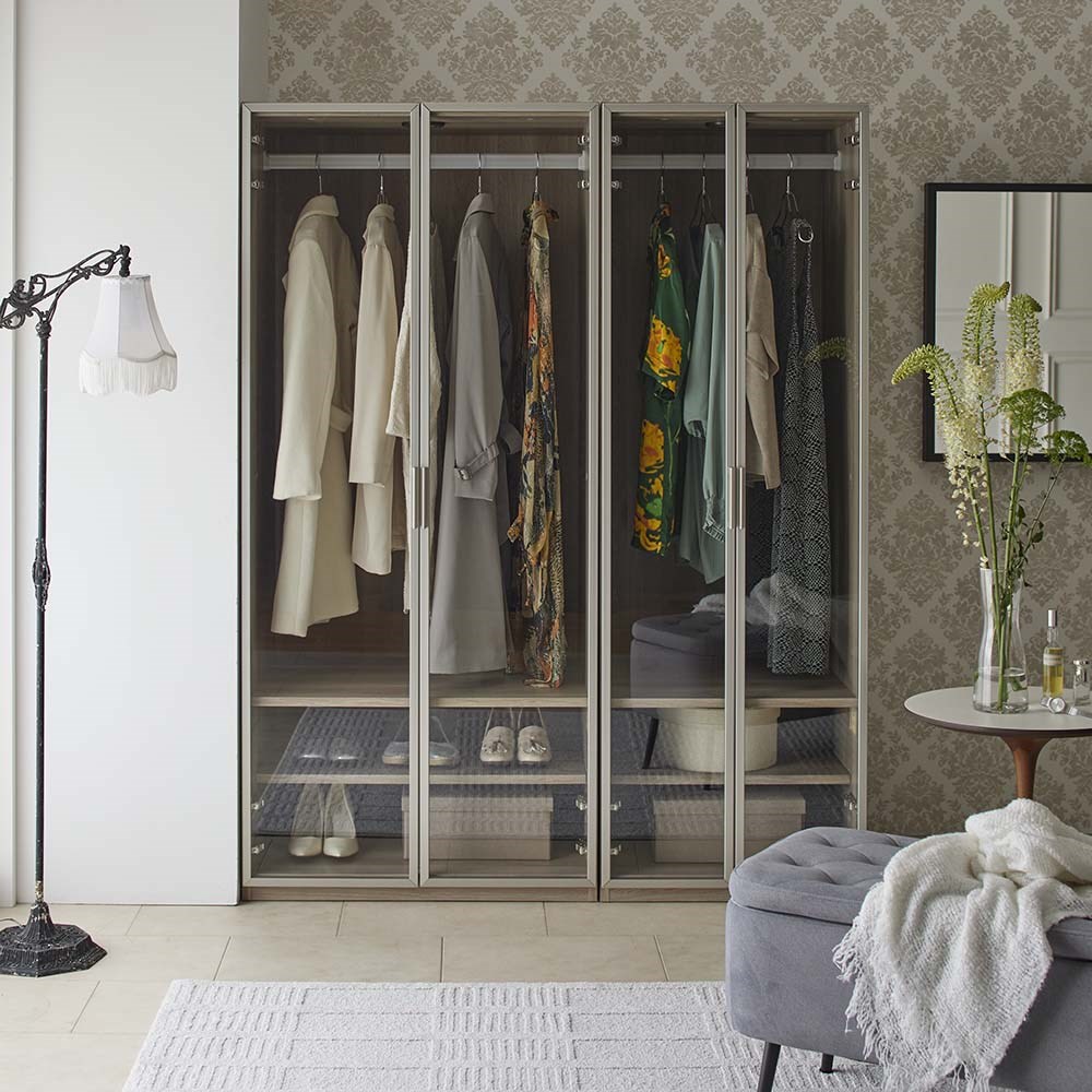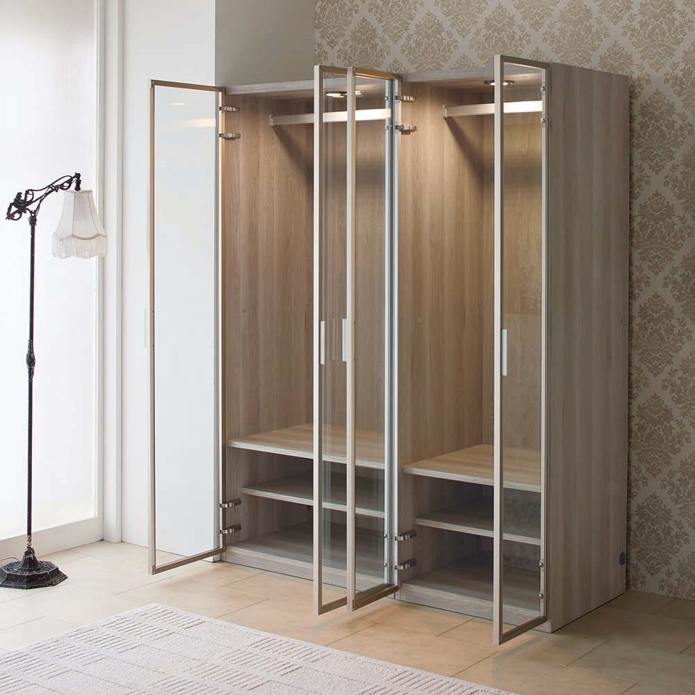 お気に入りの服や小物を飾るようにしまって“魅せる収納”を。LEDライトがコレクションを美しく照らします。ガラス扉で一目で見渡せてお出かけ準備もスピーディ。「美しく飾る」を追求したワードローブ■お気に入りの洋服やバッグを飾り毎日の暮らしの中に。コレクションを美しく魅せることにこだわった衣類収納です。 ■LEDライトが美しく照らしてくれます。ライト自体は天板裏に付いているので上から収納物を美しく照らす高級感のある仕様です。■飾るものがしっかり見えるように扉枠は出来る限り細身のスタイリッシュなデザインを採用しました。■ガラス付き扉は静かにゆっくり閉まるソフトクロージング仕様です。■上質でモダンなデザインなのでリビングや寝室に置いても。ワンランク上の空間に。■ハンガー収納部の高さは130cm(ハンガーパイプの下は約120cm)。ロングコートなども収納可能です。〜熟練の職人が丹精こめて生産しています〜家具の町、「福岡県大川市」の老舗メーカーが作った、ガラス扉のワードローブです。お気に入りの洋服やコートを収納でき、LEDライトでブティックのように魅せる収納が叶います。ガラス扉を囲うフレームはシャンパンゴールドとブラックのアルミフレーム。ガラス扉は開け閉めの衝撃も心配ですが、丁番には閉まる直前でゆっくりと閉まるようにできる特別な丁番を使用しています。お店で見つけにくいデザインで、かつお求めやすい価格に設定した、イチオシのアイテムです。