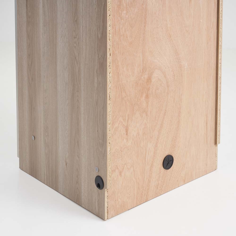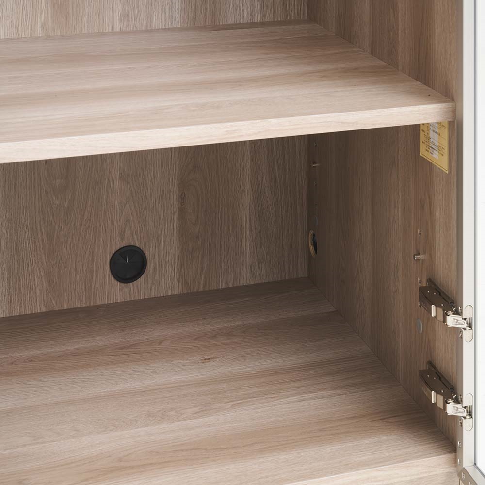 下の棚は可動式の棚板で取り外しが可能です。また、背板にはコンセントから電源を通すコード穴がついています。