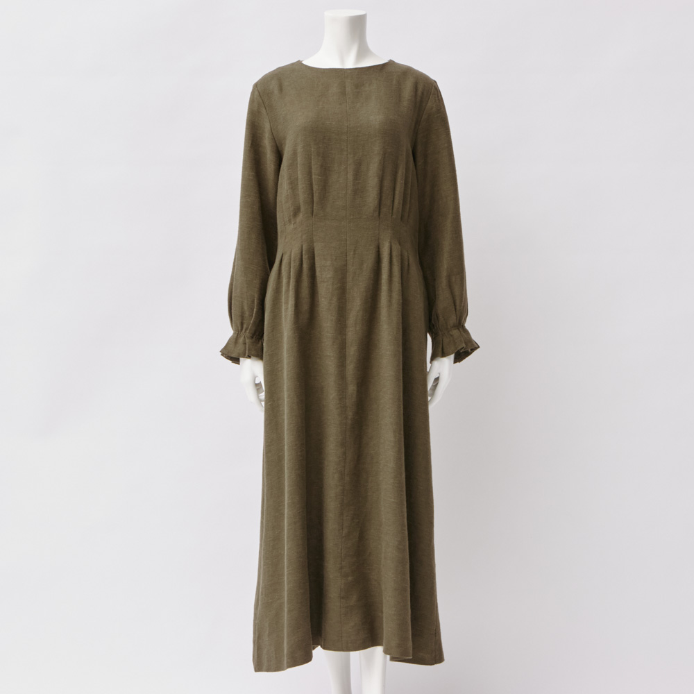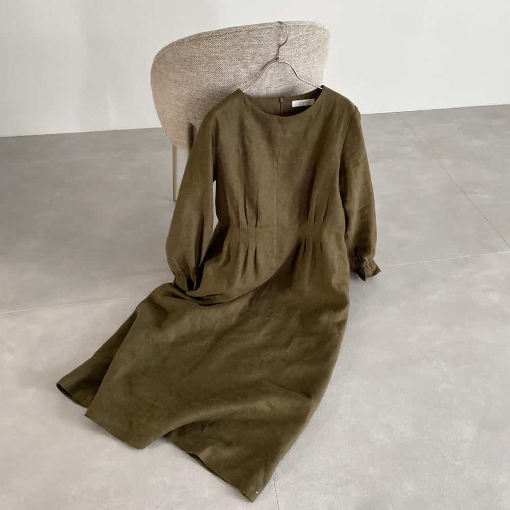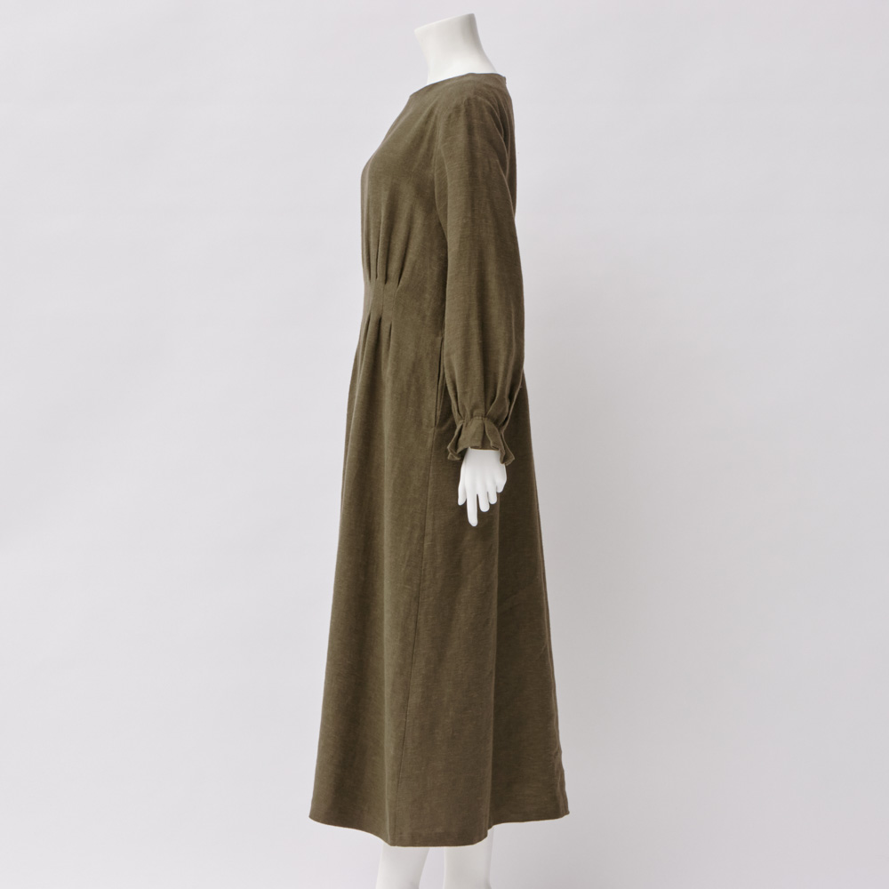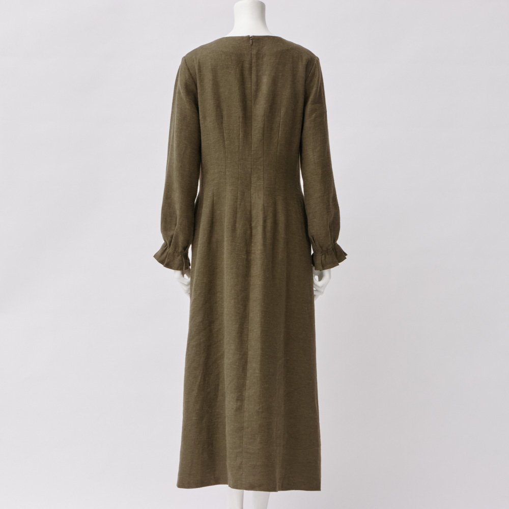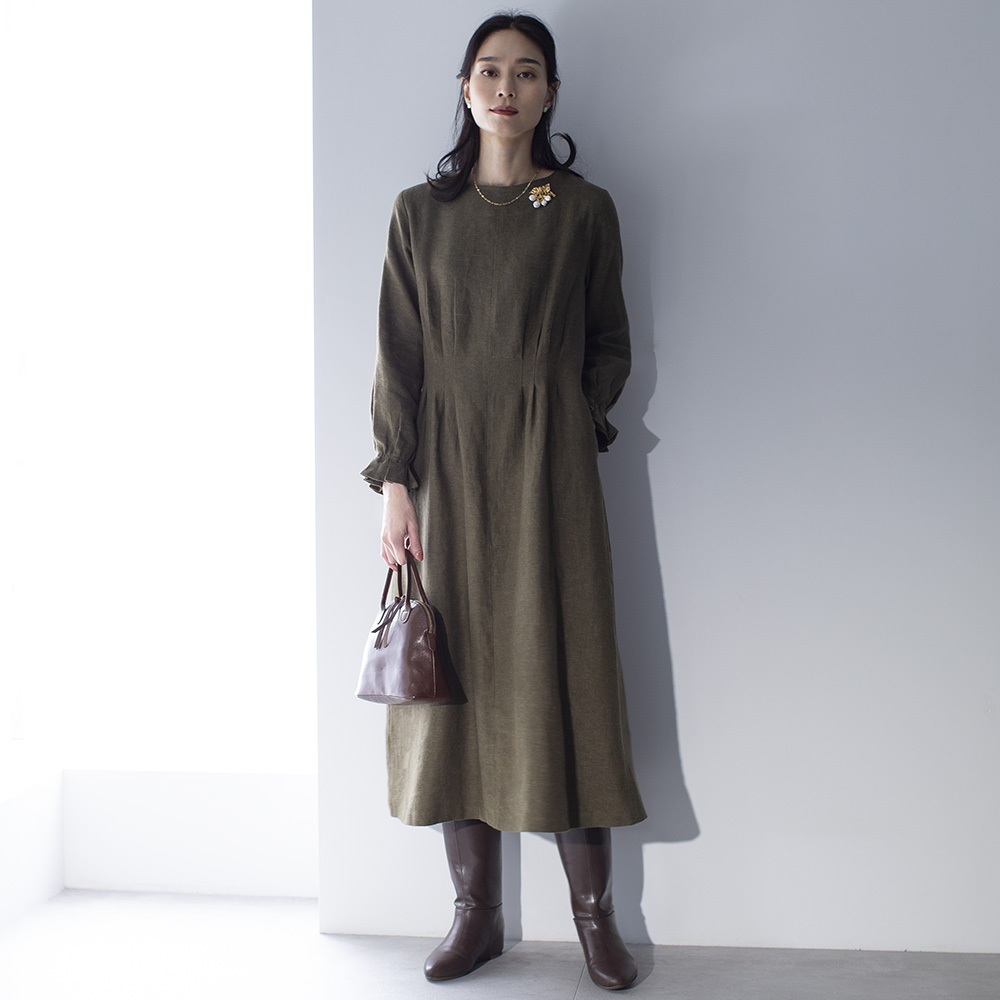 深まりゆく秋の装いに。あったかくて柔らかな、「起毛リネン」の上品ワンピース。サラリと着るだけで素敵に決まるから、この秋からのスタイリングにおすすめ。きれいめはもちろん、カジュアルな着こなしにもアレンジできる魅力的な1着です。リネンは温かな空気をため込むから、秋冬は暖か。サラッとドライタッチで春夏用の素材と思われがちなリネン。でも寒い時期は、繊維の中にある空洞に、体温で温められた空気をため込んで保温性を発揮するので、秋冬は暖かく着こなせる優秀な素材です。今回、新しく出会ったのが、起毛させて見た目にも暖かみのあるフレンチリネンの珍しい生地。厚みがしっかりありながらも軽く、ふんわりと柔らかで、上品な表情も持ち併せるなど、魅力がたっぷり。その上質な生地を使って、秋冬にマッチする素敵なワンピースを仕立てました。シックなカラーと上品なシルエット。肌当たりの良いトリコットの裏地も付いているので、ワンピース1枚で着ていただけます。秋が深まっていく時期から、リネンの心地良い温もりをぜひ楽しんでみてください。程よい華を添える袖口フリル。ゴム入りだからブラウジングもOK袖口はほんのり甘さを感じさせるフリルデザイン。ゴム入りなので、たくし上げても決まります。カジュアルな雰囲気に見せたいとき、気候が良くてちょっと暑い日など、サッとアレンジできるのが便利。すっきりと美しいシルエットを演出するウエストタック入り着こなしにメリハリを与えているのがウエストタック。やや高めの位置で切り替えているので着るだけでスタイルアップが叶い、360度どこから見ても美しいシルエットに。後ろファスナーで脱ぎ着も簡単です。両サイドには何かと便利なポケット付きちょっと何かを入れたいときに便利なポケットが付いています。脇の縫い目にあしらったシームポケットなので目立ちにくく、ワンピースの上品な雰囲気を壊さないのも高ポイント。おしゃれの格上げはアクセサリーをプラスして特別な日や、お出かけの日。いつもよりきれいめ感を増したいときは、アクセサリーをあしらって。ダークトーンなワンピースなので、相性が良いのはホワイトやゴールド。より素敵な印象を演出できますよ。