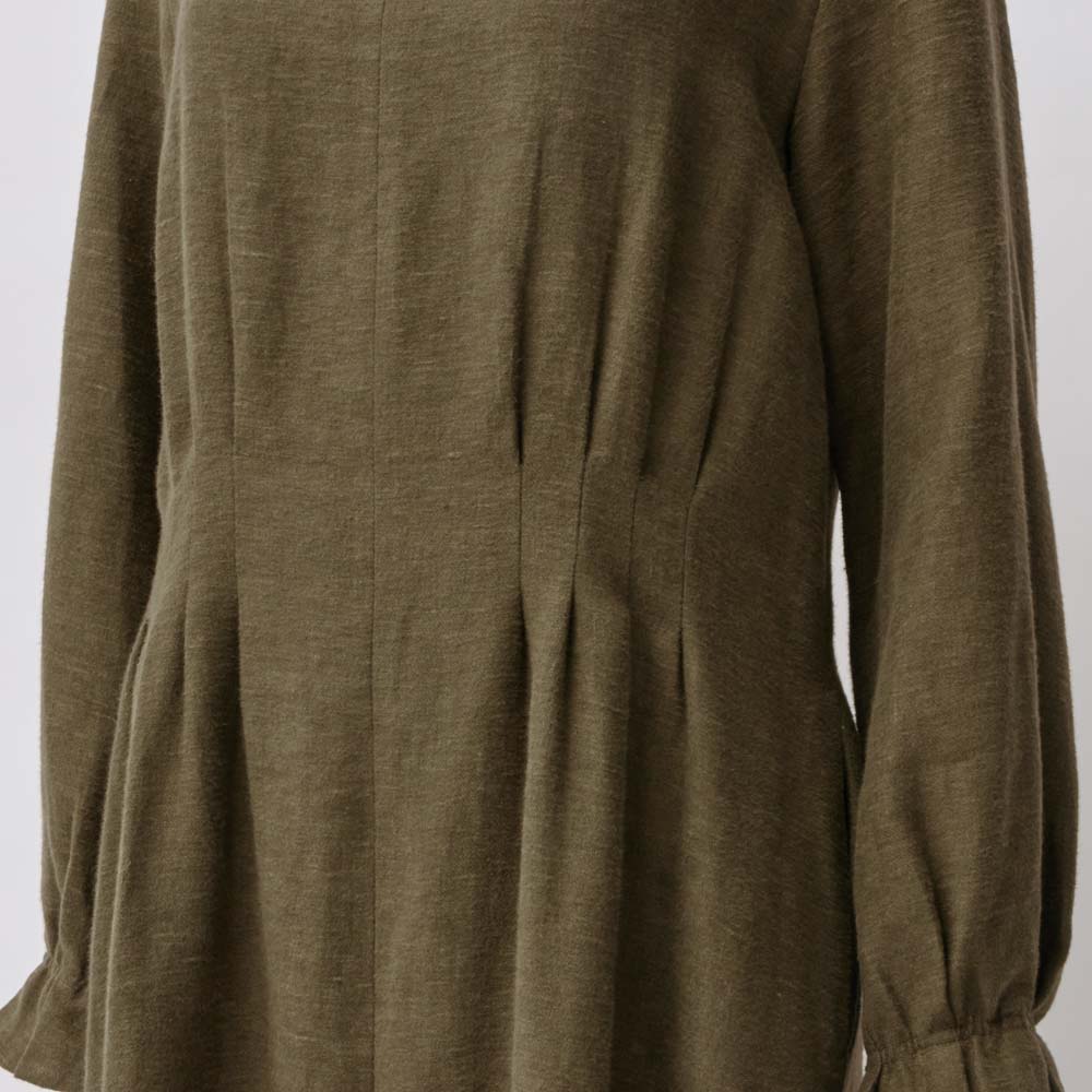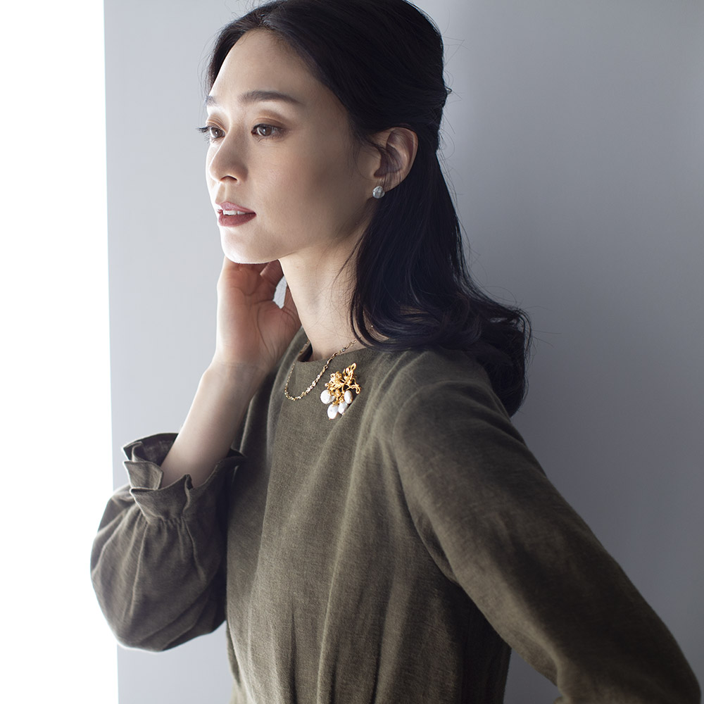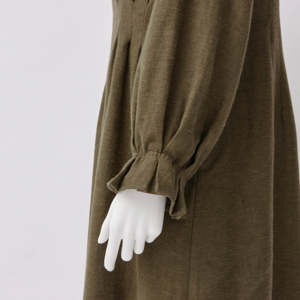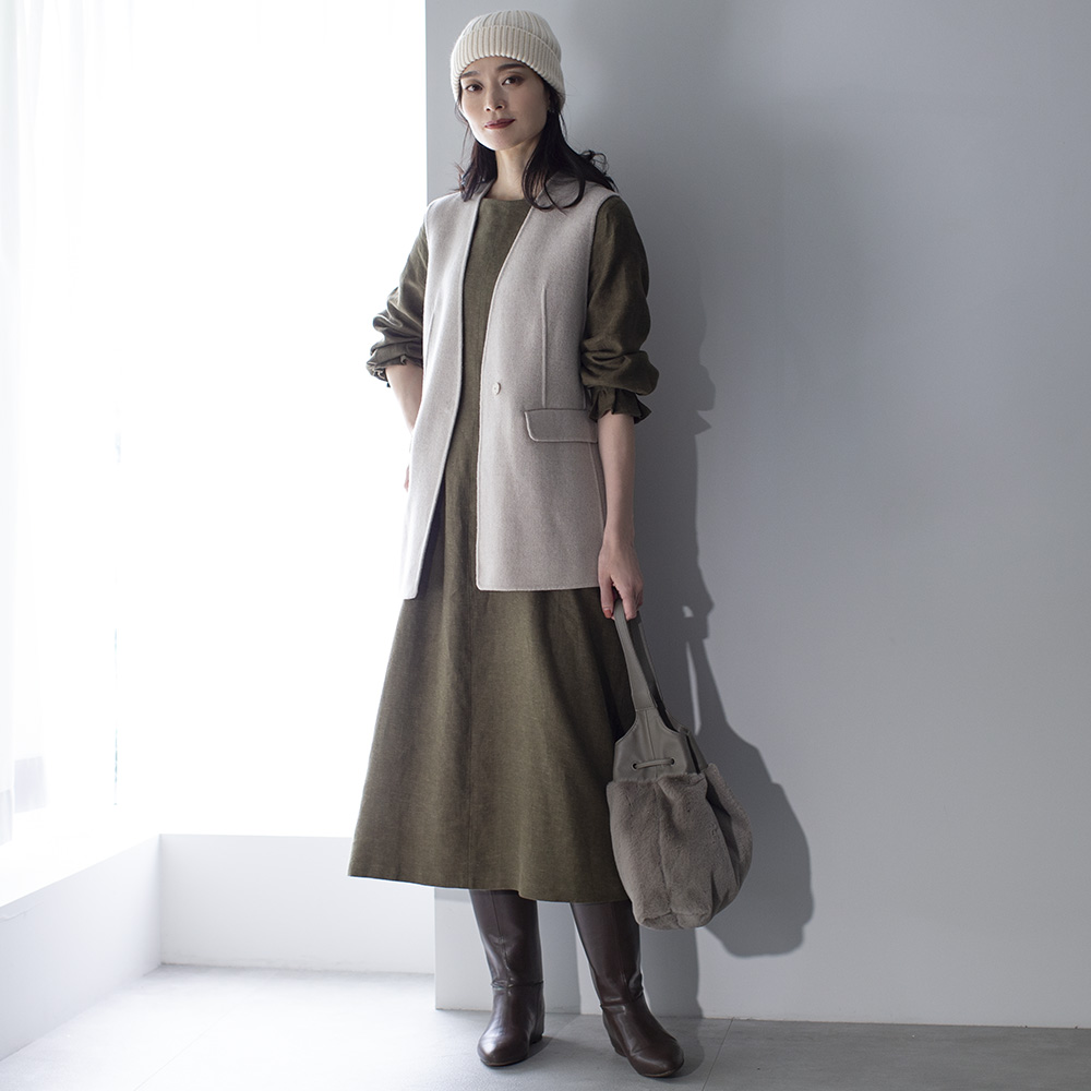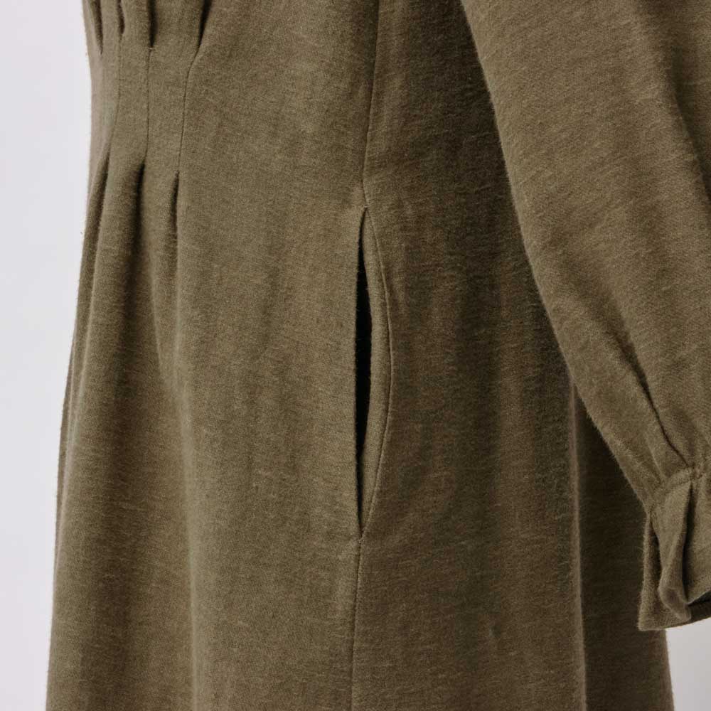 深まりゆく秋の装いに。あったかくて柔らかな、「起毛リネン」の上品ワンピース。サラリと着るだけで素敵に決まるから、この秋からのスタイリングにおすすめ。きれいめはもちろん、カジュアルな着こなしにもアレンジできる魅力的な1着です。リネンは温かな空気をため込むから、秋冬は暖か。サラッとドライタッチで春夏用の素材と思われがちなリネン。でも寒い時期は、繊維の中にある空洞に、体温で温められた空気をため込んで保温性を発揮するので、秋冬は暖かく着こなせる優秀な素材です。今回、新しく出会ったのが、起毛させて見た目にも暖かみのあるフレンチリネンの珍しい生地。厚みがしっかりありながらも軽く、ふんわりと柔らかで、上品な表情も持ち併せるなど、魅力がたっぷり。その上質な生地を使って、秋冬にマッチする素敵なワンピースを仕立てました。シックなカラーと上品なシルエット。肌当たりの良いトリコットの裏地も付いているので、ワンピース1枚で着ていただけます。秋が深まっていく時期から、リネンの心地良い温もりをぜひ楽しんでみてください。程よい華を添える袖口フリル。ゴム入りだからブラウジングもOK袖口はほんのり甘さを感じさせるフリルデザイン。ゴム入りなので、たくし上げても決まります。カジュアルな雰囲気に見せたいとき、気候が良くてちょっと暑い日など、サッとアレンジできるのが便利。すっきりと美しいシルエットを演出するウエストタック入り着こなしにメリハリを与えているのがウエストタック。やや高めの位置で切り替えているので着るだけでスタイルアップが叶い、360度どこから見ても美しいシルエットに。後ろファスナーで脱ぎ着も簡単です。両サイドには何かと便利なポケット付きちょっと何かを入れたいときに便利なポケットが付いています。脇の縫い目にあしらったシームポケットなので目立ちにくく、ワンピースの上品な雰囲気を壊さないのも高ポイント。おしゃれの格上げはアクセサリーをプラスして特別な日や、お出かけの日。いつもよりきれいめ感を増したいときは、アクセサリーをあしらって。ダークトーンなワンピースなので、相性が良いのはホワイトやゴールド。より素敵な印象を演出できますよ。