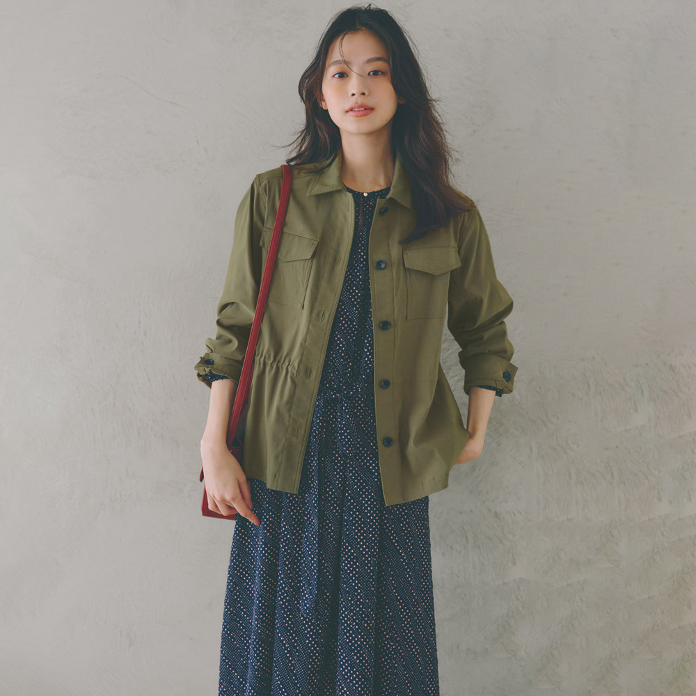 コーディネート例 /甘口ワンピも、たちまちクール顔に…リズミカルなドット柄が可愛げあふれるワンピースに、メンズライクなサファリシャツでビターに味つけ。ワンツーテクで完成する大人の甘辛スタイル。