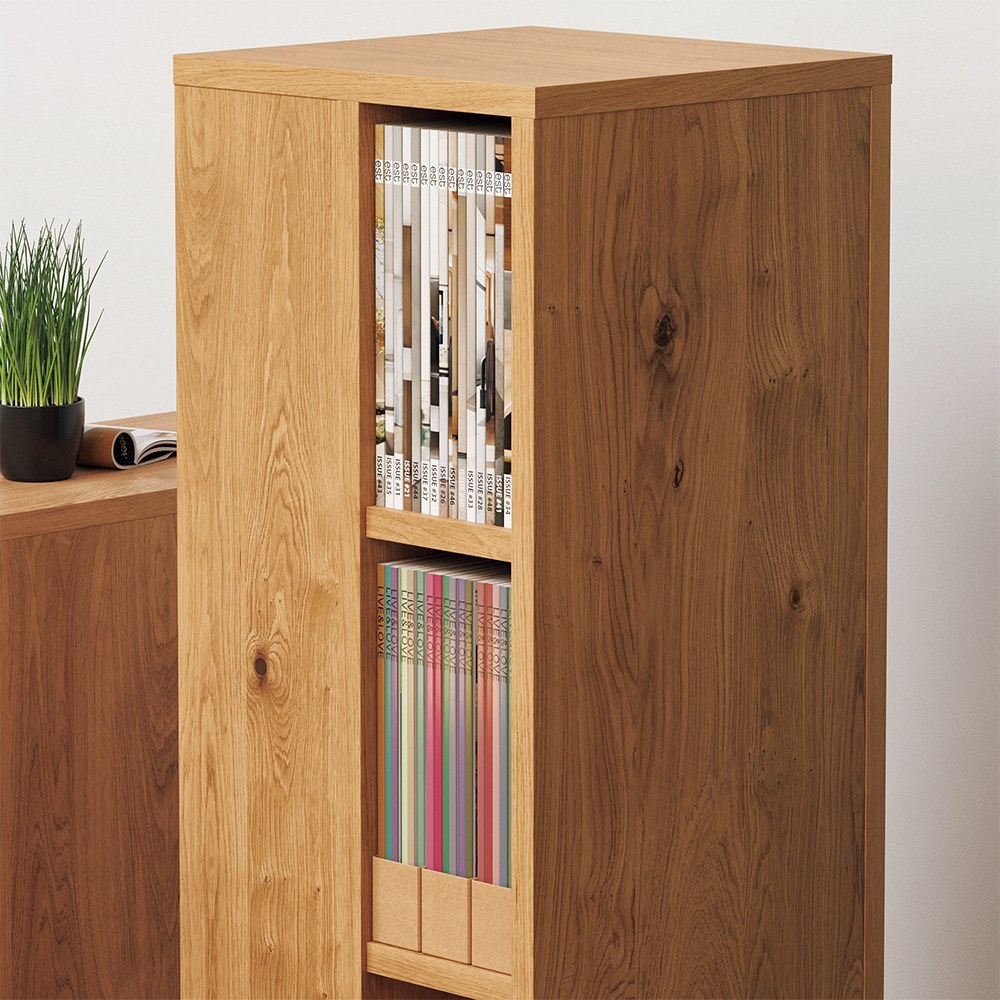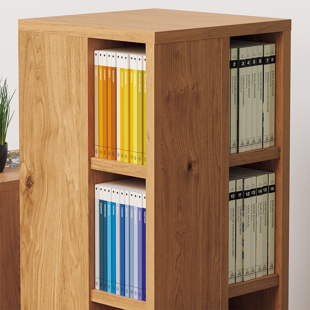 サイズの異なる本を3面から分類収納できます。雑誌もコミックもスリムにたっぷり収納して、くるりと回せばお気に入りがすぐ見つかります。