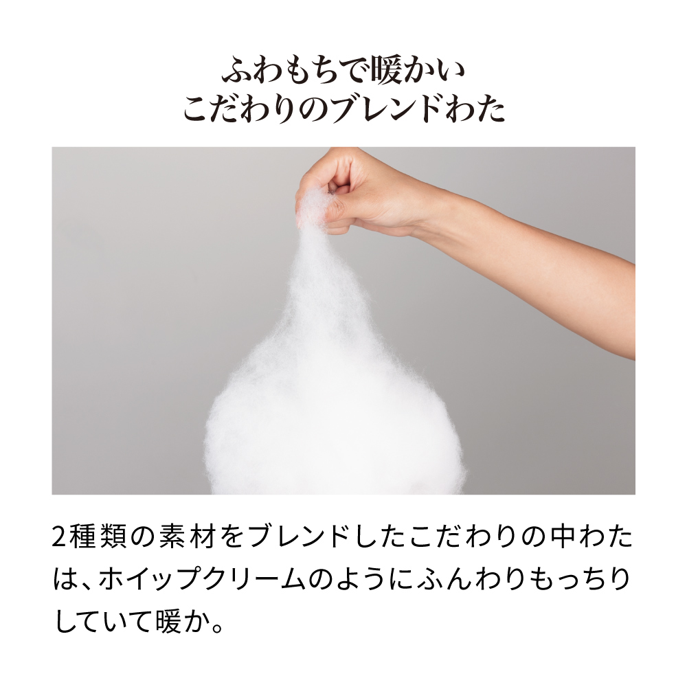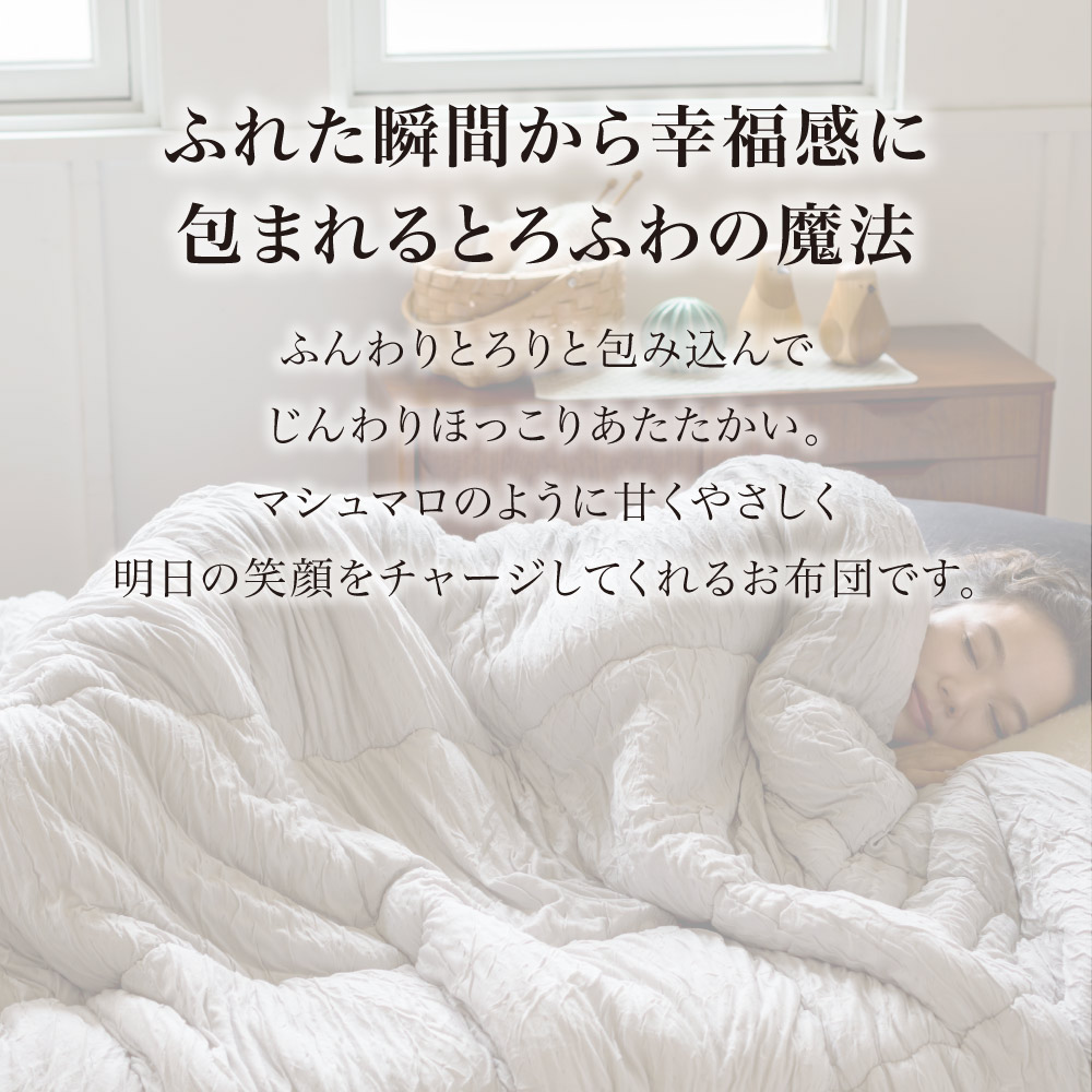 マシュマロのような感触で大人気!ふんわりとしたボリューム感があり、とても暖かな掛け布団です。下着にも使われるとろりとなめらかな天然由来のニット地と、2種類の素材をミックスしたふわもちわたの組合せで、一度ふれると手放せなくなる風合い。ホコリも出にくく、丸洗いできて清潔。カバーなしで使えて、やみつきのとろふわ感を全身で満喫できます。ふれた瞬間から幸福感に包まれるとろふわの魔法ふんわりとろりと包み込んでじんわりほっこりあたたかい。この感触を例えるならばマシュマロ、羽二重餅、ホイップクリーム…?甘くやさしく疲れた心身を癒してくれるご褒美スイーツのようなお布団があれば毎晩がしあわせの充電タイム。掛けただけで身体にフィットする、癒しの“とろふわ”感触側地はテンセル(TM)ブランドのモダール繊維で仕立てた、伸縮性のあるやわらかなニット生地。ふわっと掛けるだけで肩口まですき間なくフィットして、暖かさを逃しません。ふんわりもっちりとした中わたと相まって、まるでマシュマロのような幸せな風合いに包まれます。※画像はコンフォータータイプです。なめらかなニット生地×もちふわの中わたが生むとびきりの掛け心地2種類の素材をブレンドしたこだわりの中わたは、ホイップクリームのようにふんわりもっちりしていて暖か。側地は上質な肌着にも使われるテンセル(TM)ブランドのモダール繊維で仕立てた、くしゅっとした伸縮性のあるニット生地。この中わたと側地の組み合わせが、マシュマロタッチとドレープ感を生み出します。湿気を熱に変えるから、暖かいのにサラッと快適中わたには吸湿発熱性の高いテンセル(TM)ブランドのリヨセル繊維を50%使用。人の身体から出る汗や湿気で適度に発熱し、中空わたで保温するので、ムレにくく心地よい暖かさです。※画像はコンフォータータイプです。肌への刺激や、毛羽・ホコリが気になる方にも安心の天然由来素材天然由来素材なので、化繊が苦手な方やデリケートな肌の方にもおすすめ。肌着にも使用される高品質な生地は、毛羽やホコリも出にくく快適です。洗濯機で洗えて、カバーも不要カバーなしで使えて思う存分とろふわ感触を堪能できます。ご家庭の洗濯機で丸洗いできるから、清潔に保ちやすく気持ちよくお使いいただけます。※お届けはボリューム掛け布団です。コンフォーターはおすすめ関連商品からご覧ください。上(ウ)ホワイト、左下(ア)ラベンダー、右下(イ)ベージュの3色からお選びいただけます。【北澤恵理さんもおすすめ】この感触に癒されながら眠りたいマシュマロみたいで本当にたまりません!愛用のタオルを手放せなくなる、あの感覚なんです。ドレープが身体に沿うから、肩口も冷えずに安心です。■モデル・タレント 北澤恵理さんモデルとして活躍していた1995年、元サッカー日本代表で現在は解説者の北澤豪さんと結婚。2男1女を持つ、母親歴20余年のベテランママ。