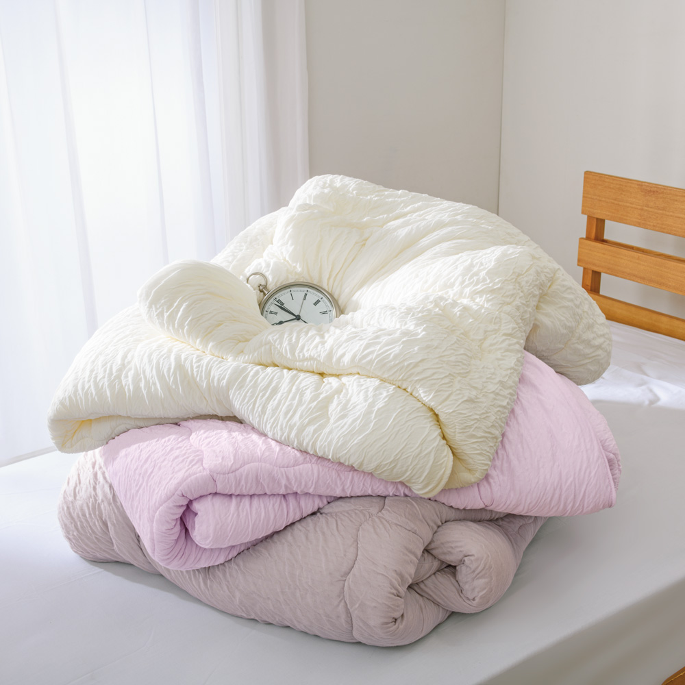 なめらかなニット生地×もちふわの中わたが生むとびきりの掛け心地2種類の素材をブレンドしたこだわりの中わたは、ホイップクリームのようにふんわりもっちりしていて暖か。側地は上質な肌着にも使われるテンセル(TM)ブランドのモダール繊維で仕立てた、くしゅっとした伸縮性のあるニット生地。この中わたと側地の組み合わせが、マシュマロタッチとドレープ感を生み出します。