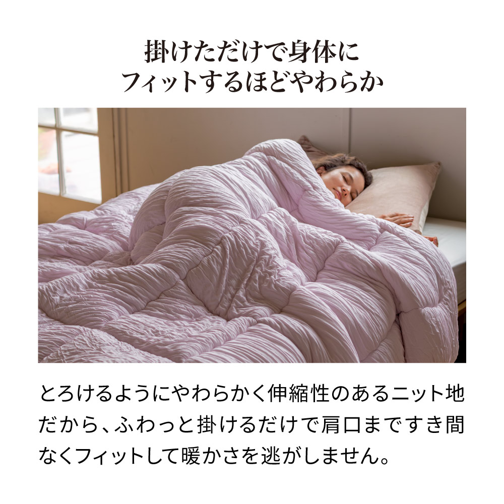 掛けただけで身体にフィットする、癒しの“とろふわ”感触側地はテンセル(TM)ブランドのモダール繊維で仕立てた、伸縮性のあるやわらかなニット生地。ふわっと掛けるだけで肩口まですき間なくフィットして、暖かさを逃しません。ふんわりもっちりとした中わたと相まって、まるでマシュマロのような幸せな風合いに包まれます。