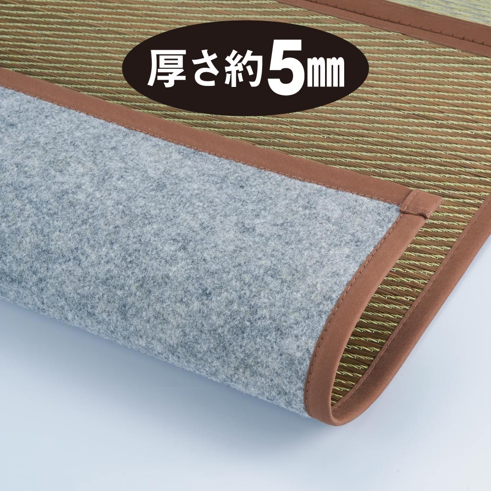 「い草は使ってみたいけどオフシーズンの収納場所が気になって・・・」そんな方におすすめの折りたためるい草ラグです。不織布を裏面に貼っているためボリュームもあり、厚さは、約5mmの裏付きタイプと、約9mmの厚手裏付きのタイプが選べます。