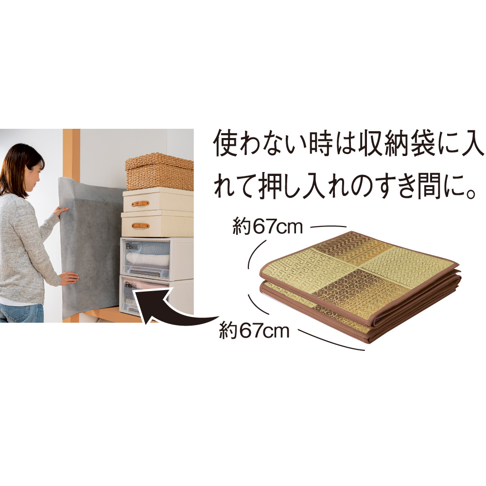 コンパクトに折りたため、オフシーズンにはすっきり収納できるのもポイントの「折りたためるい草ラグ」。裏付きタイプで、クッション性も。