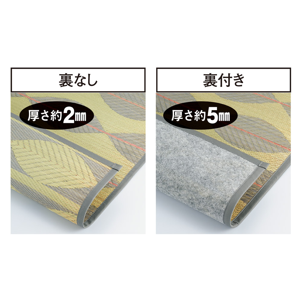 みずみずしい夏の葉や枝をイメージしたデザインで視覚からも涼しく、織りで表現したリーフ模様がさわやかです。デザインしたのはプロダクトデザインを中心に国内外で活躍する「梅野 聡さん」。ナチュラルな雰囲気の中にもさりげなくセンスを感じさせる、注目のデザイナー梅野聡さんらしいデザインです。上質な九州産い草の優れた機能で、日本の暑い夏を安心・快適にラグは不織布を裏面に貼った裏付きタイプ(厚さ約5mm)と、い草の素材感を生かした裏なしタイプ(厚さ約2mm)、中心にウレタンを入れたふっくらタイプの厚手裏付き(厚さ約9mm・別売り)の3タイプから選べます。