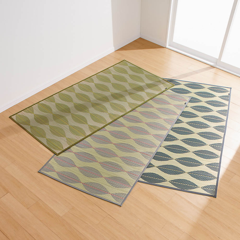 みずみずしい夏の木立をイメージをモチーフにした、心地よいアクセントカラーとアースカラーがモダンな印象。畳を守り、傷んだ畳は隠せる上敷きです。上質な九州産い草とさわやかなリーフ柄がマッチしたロングセラー。みずみずしい夏の葉や枝をイメージしたデザインで視覚からも涼しく、織りで表現したリーフ模様がさわやかです。ナチュラルな雰囲気の中にもさりげなくセンスを感じさせるデザインで永く愛されるロングセラーシリーズです。“福岡花ござ”から始まる、ひとつ先の心地よい暮らし国産へのこだわり福岡の熟練職人が織り成す「福岡花ござ」ディノスがお届けするい草は、すべて日本の大地で育まれた国産い草。その中でも、福岡県で織り上げられるものだけが名乗れる「福岡花ござ」を厳選しました。しなやかな艶、均一な目通し、そして洗練された意匠。素材の良さと匠の技が響き合う一枚が、住まいに穏やかな格調を添えます。天然い草の4つの恵みい草には日本の高温多湿な気候に適した天然の機能性がたくさん備わっています。1. 湿度をほどよく整える“呼吸する床”梅雨のべたつきも冬の乾燥も、い草が吸放湿を繰り返して一年中サラリ。湿度の変化に対応し、一年中快適にご使用いただけます。2. 空気を浄化し、においもカットスポンジ状の繊維が空気中の二酸化炭素やホルムアルデヒドを吸着。汗やペット臭などの原因物質も抑え、深呼吸したくなる空間に。3. どこか懐かしく、気分までほどける香り畳の上で昼寝をしたあの頃の記憶。フィトンチッドを含むい草の爽やかな香りが、忙しい毎日に小さな“深呼吸の時間”をくれます。4. 長く寄り添う強さとお手入れの手軽さ国産い草の丈夫な繊維は摩擦に強く、汚れもサッと拭くだけ。上質なものを丁寧に使い、永く愛する―そんな大人の暮らしにぴったりです。+αの安心:天然カテキンの抗菌・防臭ケア八女茶で染め上げた国産い草が、茶カテキンの持つ抗菌作用により臭いのもととなる菌の繁殖を抑制。素肌に触れる夏も爽やかです。畳を守り、傷んだ畳は隠せる「上敷き」タイプ敷くだけで部屋全体の印象が凛と整い、洋室にも映える万能な一枚。模様替えも気軽に行えます。厚さ約5mm、床を傷付けにくい不織布+滑り止め加工の裏付きタイプです。伝統を解き放ち、線で魅せる。−UMENO DESIGNUMENODESIGNにデザインを託したこのい草シリーズは、従来の和のイメージに留まらない、現代のお部屋にもなじむ洗練された佇まいが魅力です。伝統的な織りの技法にひねりを加え、葉脈を思わせる立体的なパターンを細部まで丁寧に表現。国産い草ならではのやさしい肌ざわりと上品な艶をそのままに、和室はもちろん、リビングのソファサイドやベッドルームにもすっと溶け込みます。●UMENODESIGN デザイナー 梅野 聡2003年UMENODESIGN設立。プロダクトデザインを中心に商品プロデュースやブランディングを幅広く手掛け、国内外で活躍中。地域の伝統工芸へのデザインを提供するなど、日本の古くからの技術を生かしたデザインを行っている。