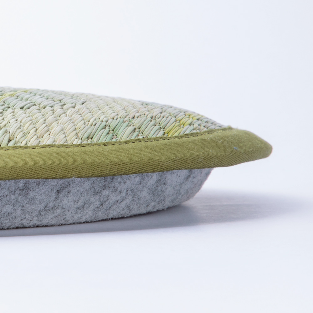 夏の葉のイメージをい草でモダンに表現した、人気のUMENO DESIGNシリーズ〈リーブス〉の円形シートクッション。椅子やソファに置いてサラッと快適な夏のインテリアのアクセントに。い草の風合いとリーフ柄がマッチしたチェアマット。じめじめ汗ばむ季節、座面に置くだけでサラッと快適ない草の円形シートクッションです。厚さ約3.5センチで、ウレタン入りの優れたクッション性。厚みを感じさせないスッキリとした仕上がりで、チェアやベンチ、ソファで使ってもしっくり馴染みます。上質な九州産い草とさわやかなリーフ柄がマッチしたロングセラー。みずみずしい夏の葉や枝をイメージしたデザインで視覚からも涼しく、織りで表現したリーフ模様がさわやかです。ナチュラルな雰囲気の中にもさりげなくセンスを感じさせるデザインで永く愛されるロングセラーシリーズです。“福岡花ござ”から始まる、ひとつ先の心地よい暮らし国産へのこだわり福岡の熟練職人が織り成す「福岡花ござ」ディノスがお届けするい草は、すべて日本の大地で育まれた国産い草。その中でも、福岡県で織り上げられるものだけが名乗れる「福岡花ござ」を厳選しました。しなやかな艶、均一な目通し、そして洗練された意匠。素材の良さと匠の技が響き合う一枚が、住まいに穏やかな格調を添えます。天然い草の4つの恵みい草には日本の高温多湿な気候に適した天然の機能性がたくさん備わっています。1. 湿度をほどよく整える“呼吸する床”梅雨のべたつきも冬の乾燥も、い草が吸放湿を繰り返して一年中サラリ。湿度の変化に対応し、一年中快適にご使用いただけます。2. 空気を浄化し、においもカットスポンジ状の繊維が空気中の二酸化炭素やホルムアルデヒドを吸着。汗やペット臭などの原因物質も抑え、深呼吸したくなる空間に。3. どこか懐かしく、気分までほどける香り畳の上で昼寝をしたあの頃の記憶。フィトンチッドを含むい草の爽やかな香りが、忙しい毎日に小さな“深呼吸の時間”をくれます。4. 長く寄り添う強さとお手入れの手軽さ国産い草の丈夫な繊維は摩擦に強く、汚れもサッと拭くだけ。上質なものを丁寧に使い、永く愛する―そんな大人の暮らしにぴったりです。+αの安心:天然カテキンの抗菌・防臭ケア八女茶で染め上げた国産い草が、茶カテキンの持つ抗菌作用により臭いのもととなる菌の繁殖を抑制。素肌に触れる夏も爽やかです。伝統を解き放ち、線で魅せる。−UMENO DESIGNUMENODESIGNにデザインを託したこのい草シリーズは、従来の和のイメージに留まらない、現代のお部屋にもなじむ洗練された佇まいが魅力です。伝統的な織りの技法にひねりを加え、葉脈を思わせる立体的なパターンを細部まで丁寧に表現。国産い草ならではのやさしい肌ざわりと上品な艶をそのままに、和室はもちろん、リビングのソファサイドやベッドルームにもすっと溶け込みます。●UMENODESIGN デザイナー 梅野 聡2003年UMENODESIGN設立。プロダクトデザインを中心に商品プロデュースやブランディングを幅広く手掛け、国内外で活躍中。地域の伝統工芸へのデザインを提供するなど、日本の古くからの技術を生かしたデザインを行っている。