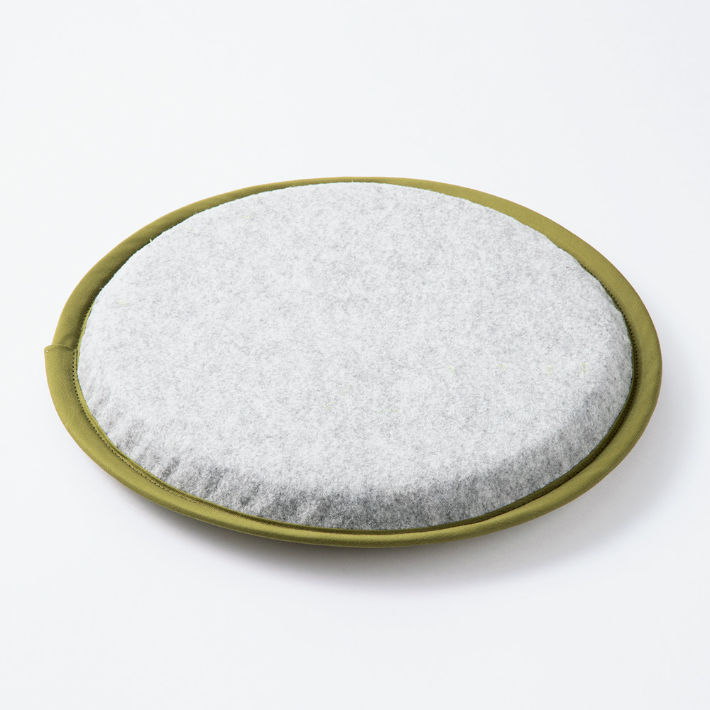 ウレタン入りでクッション性に優れた円形シートクッション。裏面は滑りにくい加工を施した不織布。 ※写真は上から(ア)フレッシュグリーン(イ)ライトパープル(ウ)ネイビーグレー