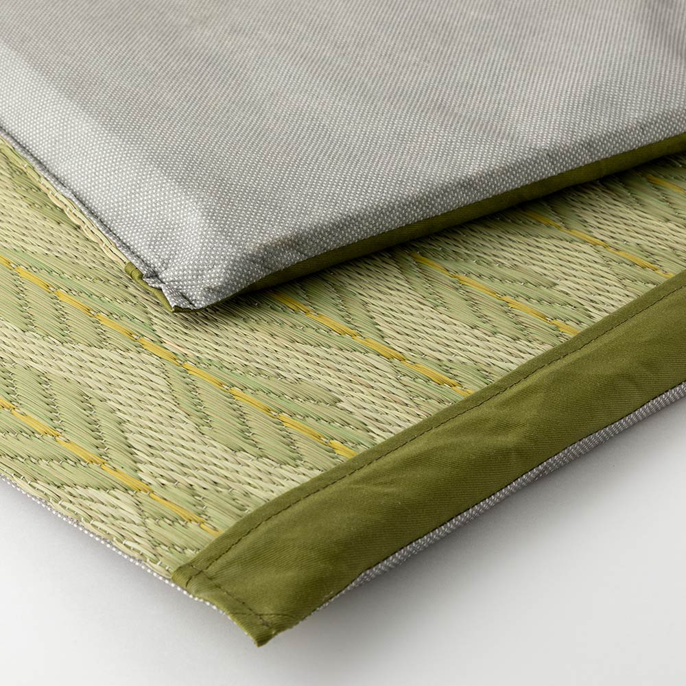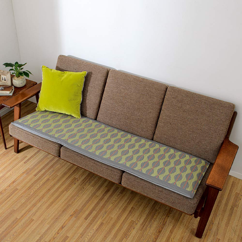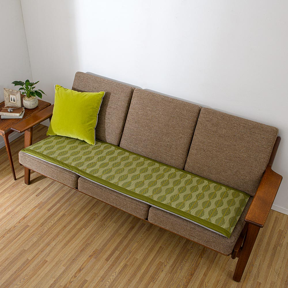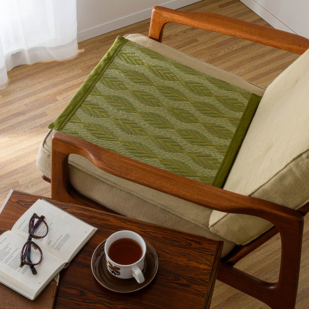 まるで我が家で森林浴をしているかのよう!みずみずしい葉を織りで表現した、目にも涼やかなデザインのシートクッションです。フロアやソファに敷いて、い草の爽やかさと心地よいクッション性をお楽しみください。上質な九州産い草とさわやかなリーフ柄がマッチしたロングセラー。みずみずしい夏の葉や枝をイメージしたデザインで視覚からも涼しく、織りで表現したリーフ模様がさわやかです。ナチュラルな雰囲気の中にもさりげなくセンスを感じさせるデザインで永く愛されるロングセラーシリーズです。い草の風合いとリーフ柄がマッチしたシートクッション。ふっくらウレタン入りのシートクッションです。ソファを快適な夏仕様にアレンジしたり、フロアに直接敷いてごろ寝マットとしてもお使いいただけます。へり部分はソファに座った時にひざ裏が痛くなりにくいヘム仕様。“福岡花ござ”から始まる、ひとつ先の心地よい暮らし国産へのこだわり福岡の熟練職人が織り成す「福岡花ござ」ディノスがお届けするい草は、すべて日本の大地で育まれた国産い草。その中でも、福岡県で織り上げられるものだけが名乗れる「福岡花ござ」を厳選しました。しなやかな艶、均一な目通し、そして洗練された意匠。素材の良さと匠の技が響き合う一枚が、住まいに穏やかな格調を添えます。天然い草の4つの恵みい草には日本の高温多湿な気候に適した天然の機能性がたくさん備わっています。1. 湿度をほどよく整える“呼吸する床”梅雨のべたつきも冬の乾燥も、い草が吸放湿を繰り返して一年中サラリ。湿度の変化に対応し、一年中快適にご使用いただけます。2. 空気を浄化し、においもカットスポンジ状の繊維が空気中の二酸化炭素やホルムアルデヒドを吸着。汗やペット臭などの原因物質も抑え、深呼吸したくなる空間に。3. どこか懐かしく、気分までほどける香り畳の上で昼寝をしたあの頃の記憶。フィトンチッドを含むい草の爽やかな香りが、忙しい毎日に小さな“深呼吸の時間”をくれます。4. 長く寄り添う強さとお手入れの手軽さ国産い草の丈夫な繊維は摩擦に強く、汚れもサッと拭くだけ。上質なものを丁寧に使い、永く愛する―そんな大人の暮らしにぴったりです。+αの安心:天然カテキンの抗菌・防臭ケア八女茶で染め上げた国産い草が、茶カテキンの持つ抗菌作用により臭いのもととなる菌の繁殖を抑制。素肌に触れる夏も爽やかです。伝統を解き放ち、線で魅せる。−UMENO DESIGNUMENODESIGNにデザインを託したこのい草シリーズは、従来の和のイメージに留まらない、現代のお部屋にもなじむ洗練された佇まいが魅力です。伝統的な織りの技法にひねりを加え、葉脈を思わせる立体的なパターンを細部まで丁寧に表現。国産い草ならではのやさしい肌ざわりと上品な艶をそのままに、和室はもちろん、リビングのソファサイドやベッドルームにもすっと溶け込みます。●UMENODESIGN デザイナー 梅野 聡2003年UMENODESIGN設立。プロダクトデザインを中心に商品プロデュースやブランディングを幅広く手掛け、国内外で活躍中。地域の伝統工芸へのデザインを提供するなど、日本の古くからの技術を生かしたデザインを行っている。
