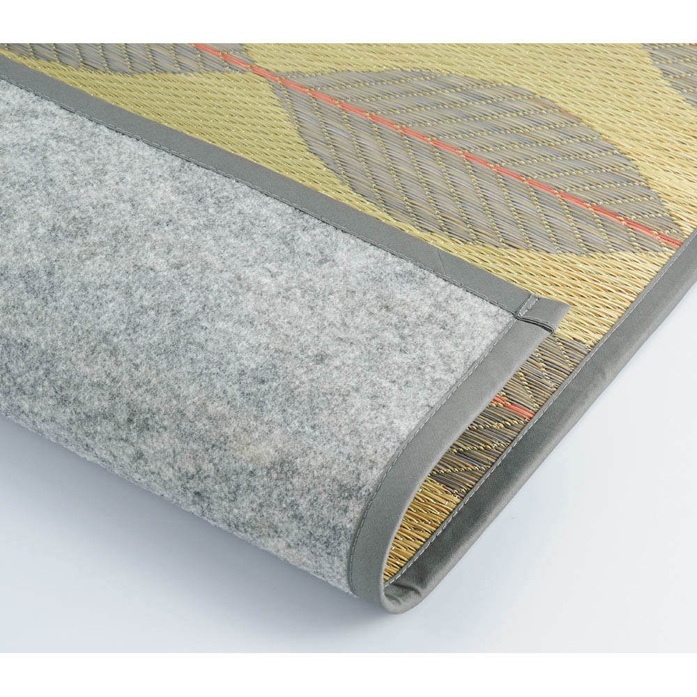 みずみずしい夏の葉や枝をイメージしたデザインで視覚からも涼しく、織りで表現したリーフ模様がさわやかです。デザインしたのはプロダクトデザインを中心に国内外で活躍する「梅野 聡さん」。ナチュラルな雰囲気の中にもさりげなくセンスを感じさせる、注目のデザイナー梅野聡さんらしいデザインです。上質な九州産い草の優れた機能で、日本の暑い夏を安心・快適にラグは不織布を裏面に貼った裏付きタイプ(厚さ約5mm)と、い草の素材感を生かした裏なしタイプ(厚さ約2mm)、中心にウレタンを入れたふっくらタイプの厚手裏付き(厚さ約9mm・別売り)の3タイプから選べます。