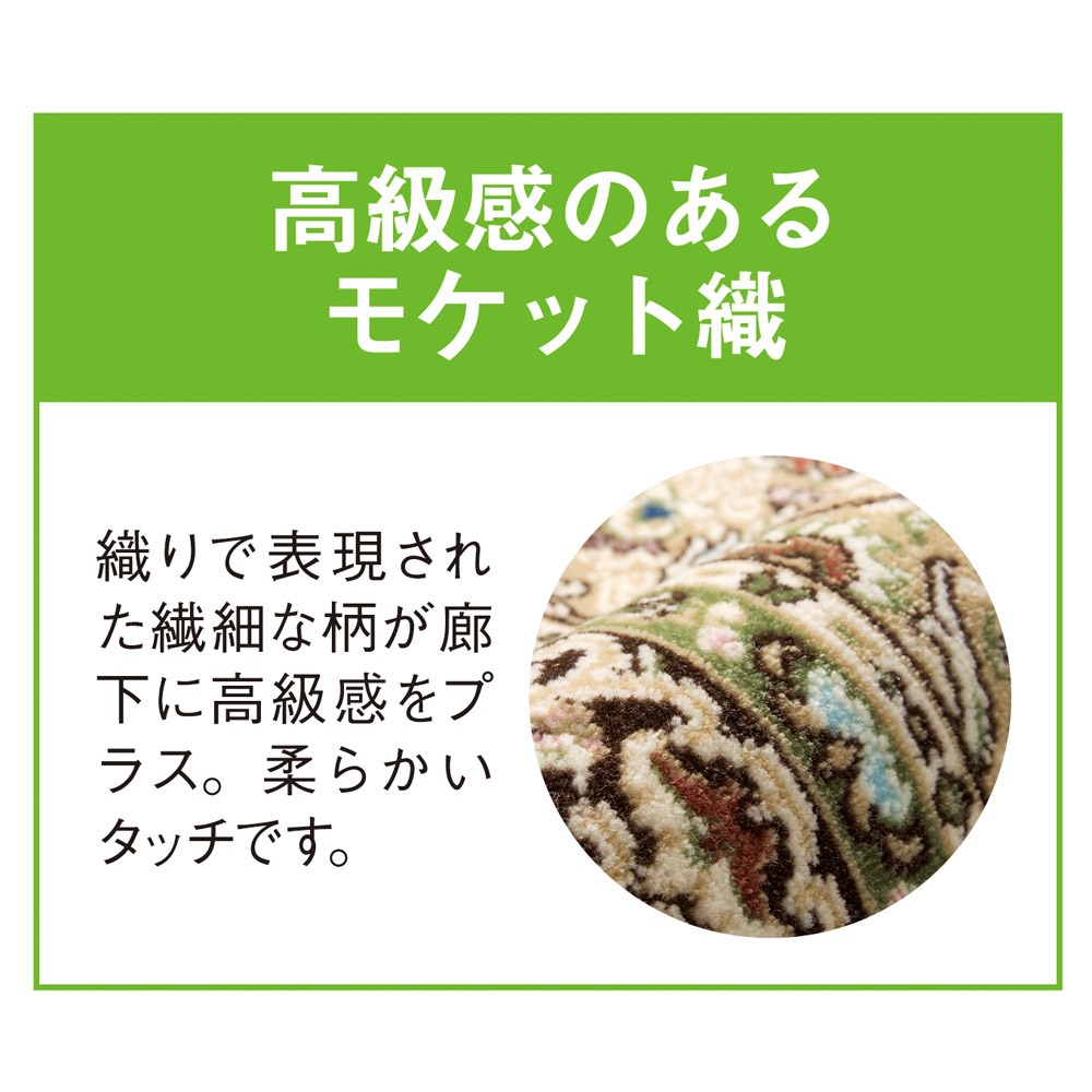 繊細な柄が際立つ、なめらかで高級感のあるモケット織の廊下敷きです。抗菌・防臭機能も備えています。敷くだけで、廊下を華やかな空間にドレスアップしてくれます。キッチンマットやベッドサイドにもおすすめです!なめらかなモケット織で表現された繊細でクラシカルな柄がリッチな雰囲気。敷くだけで、廊下を華やかな空間にドレスアップしてくれます。もちろん、ウォッシャブル仕様や抗菌・防臭と機能も充実。●モケット織とは毛羽のある織物で、肌触りが滑らかで耐久性に優れているため、カーペット(ラグ)以外にも、長時間にわたり使用される飛行機や鉄道車両などの座席の表地に使用されています。独特の光沢感もあり、高級感があります。