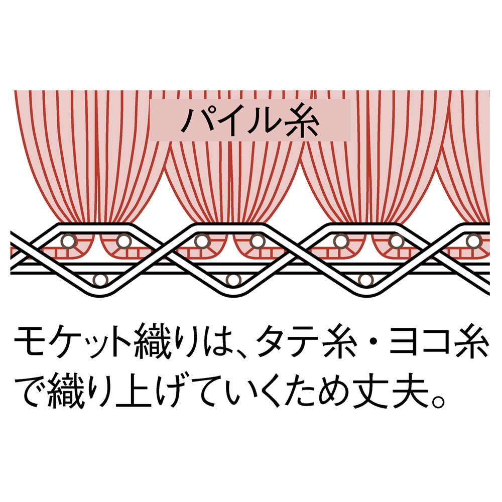 ●モケット織とは毛羽のある織物で、肌触りが滑らかで耐久性に優れているため、カーペット(ラグ)以外にも、長時間にわたり使用される飛行機や鉄道車両などの座席の表地に使用されています。