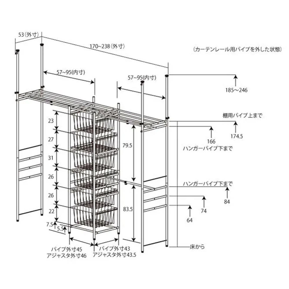 洗練された空間を演出するホワイト色の大量収納ハンガーラックです。総耐荷重120kgの頑丈な突っ張り式だから、お気に入りの洋服をたっぷり、天井まで収納できます。通気性の良いワイヤー引き出し付きで掛ける収納とたたむ収納を1台にまとめられます。ホコリや日焼けから収納物を守るカーテン付きタイプです。カーテン・バスケット付き ハイタイプお部屋の雰囲気を明るくする白の突っ張り式ハンガー洋服をたくさん掛けたい、見た目はシンプルが良い、という方におすすめのクローゼットハンガー。上質なクローゼットルームを思い起こさせる、ホワイトの統一感が特徴です。上質感を求め、金具や細部のデザインもこだわって作りました。耐荷重120kgの頑丈な突っ張り式だから、お気に入りの洋服をたっぷり天井まで収納できます。カーテンで収納物を隠せる便利な上下・左右のカーテン付き。カーテンを閉めれば、衣類をスッキリと隠せます。急な来客でもサッと隠せて、片付けの時短にも。また、ホコリの侵入や日焼けから収納物を守ってくれます。お届け商品 ※赤文字は内寸(単位cm) カーテン・バスケット付き ロータイプ上下・左右のカーテン付き、バスケットの引き出し(6段)付き。高さ:ロータイプ(185cm〜246cm)、幅:170cm〜238cm奥行53cmなので、ウォークインクローゼットでの使用もおすすめ。白い壁でも色のある壁にもマッチする、シンプルなホワイトが魅力です。ハイタイプ 左:幅170cmの状態、右:幅238cmの状態スペースに合わせて幅が変えられる幅が伸縮できるので、ご自宅のスペースに合わせて設置可能。幅は最小170cmから最大238cmまで伸縮できます。 たたむ収納に便利な引き出しワイヤーバスケットの引き出し付きタイプは、掛ける収納とたたむ収納を1台にまとめられます。中身が見えるので、収納物がひと目でわかります。また、通気性が良いので、かさばるバッグの収納、ハンガー掛けでは型崩れしてしまう「セーター」などの衣類収納にも便利。高さ調節可能な下段のハンガーバー下段のハンガーバーは収納する衣類の長さに合わせ、3段階に高さ調整が可能。スカートやパンツ、短めのシャツやジャケットを掛けるのに便利です。 また、下段のハンガーバーは左右どちらにも設置可能。左:カーテン・バスケット付き ハイタイプ家族の衣類を1台にまとめられる頑丈さ総耐荷重約120kg(上棚約60kg、上ハンガー部約40kg、下ハンガー部約20kg)と頑丈な構造です。ハンガーバーは厚みのあるパイプを使用。スチール製の中間リングを使い、荷重をしっかり支えます。天井の段差や梁にも対応する突っ張り式しっかり固定できる天井突っ張り式なので、揺れや荷重に強く安心してお使いいただけます。つっぱり棒部分は4本別々に高さ調整でき、天井の梁にも対応。取り外し&洗濯可能なカーテンカーテンは、洗濯ネットを使用して丸洗い可能。前面の上下カーテンは市販のカーテンに変更もできます。(サイドカーテンは紐で結ぶ仕様になっています)足元はアジャスター付きガタつく床にも対応。約1cm調整が可能です。