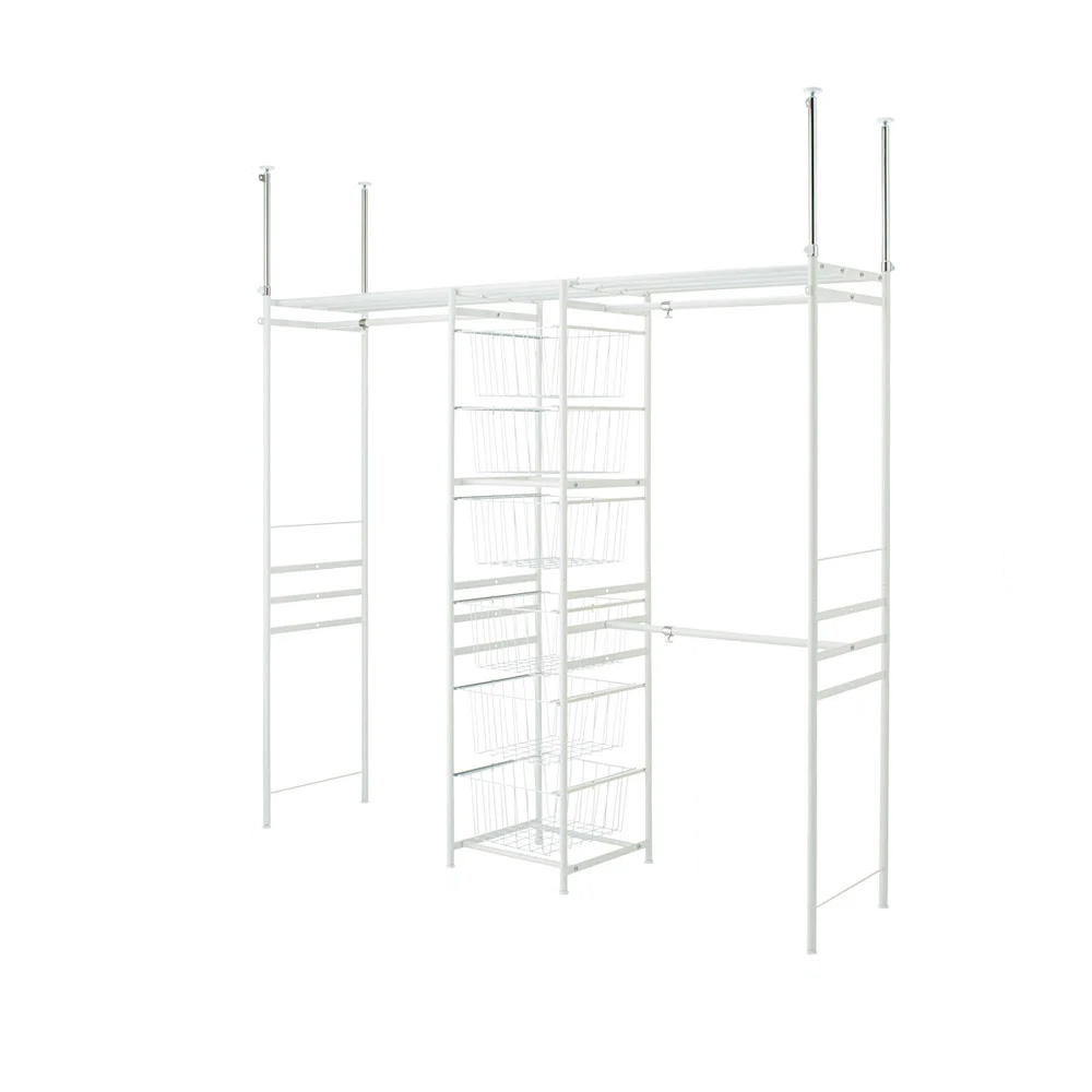 洗練された空間を演出するホワイト色の大量収納ハンガーラックです。総耐荷重120kgの頑丈な突っ張り式だから、お気に入りの洋服をたっぷり、天井まで収納できます。通気性の良いワイヤー引き出し付きで掛ける収納とたたむ収納を1台にまとめられます。ホコリや日焼けから収納物を守るカーテン付きタイプです。カーテン・バスケット付き ハイタイプお部屋の雰囲気を明るくする白の突っ張り式ハンガー洋服をたくさん掛けたい、見た目はシンプルが良い、という方におすすめのクローゼットハンガー。上質なクローゼットルームを思い起こさせる、ホワイトの統一感が特徴です。上質感を求め、金具や細部のデザインもこだわって作りました。耐荷重120kgの頑丈な突っ張り式だから、お気に入りの洋服をたっぷり天井まで収納できます。カーテンで収納物を隠せる便利な上下・左右のカーテン付き。カーテンを閉めれば、衣類をスッキリと隠せます。急な来客でもサッと隠せて、片付けの時短にも。また、ホコリの侵入や日焼けから収納物を守ってくれます。お届け商品 ※赤文字は内寸(単位cm) カーテン・バスケット付き ハイタイプ上下・左右のカーテン付き、バスケットの引き出し(7段)付き。高さ:ハイタイプ(218cm〜280cm)、幅:170cm〜238cm奥行53cmなので、ウォークインクローゼットでの使用もおすすめ。白い壁でも色のある壁にもマッチする、シンプルなホワイトが魅力です。ハイタイプ 左:幅170cmの状態、右:幅238cmの状態スペースに合わせて幅が変えられる幅が伸縮できるので、ご自宅のスペースに合わせて設置可能。幅は最小170cmから最大238cmまで伸縮できます。 たたむ収納に便利な引き出しワイヤーバスケットの引き出し付きタイプは、掛ける収納とたたむ収納を1台にまとめられます。中身が見えるので、収納物がひと目でわかります。また、通気性が良いので、かさばるバッグの収納、ハンガー掛けでは型崩れしてしまう「セーター」などの衣類収納にも便利。高さ調節可能な下段のハンガーバー下段のハンガーバーは収納する衣類の長さに合わせ、3段階に高さ調整が可能。スカートやパンツ、短めのシャツやジャケットを掛けるのに便利です。 また、下段のハンガーバーは左右どちらにも設置可能。左:カーテン・バスケット付き ハイタイプ家族の衣類を1台にまとめられる頑丈さ総耐荷重約120kg(上棚約60kg、上ハンガー部約40kg、下ハンガー部約20kg)と頑丈な構造です。ハンガーバーは厚みのあるパイプを使用。スチール製の中間リングを使い、荷重をしっかり支えます。天井の段差や梁にも対応する突っ張り式しっかり固定できる天井突っ張り式なので、揺れや荷重に強く安心してお使いいただけます。つっぱり棒部分は4本別々に高さ調整でき、天井の梁にも対応。取り外し&洗濯可能なカーテンカーテンは、洗濯ネットを使用して丸洗い可能。前面の上下カーテンは市販のカーテンに変更もできます。(サイドカーテンは紐で結ぶ仕様になっています)足元はアジャスター付きガタつく床にも対応。約1cm調整が可能です。
